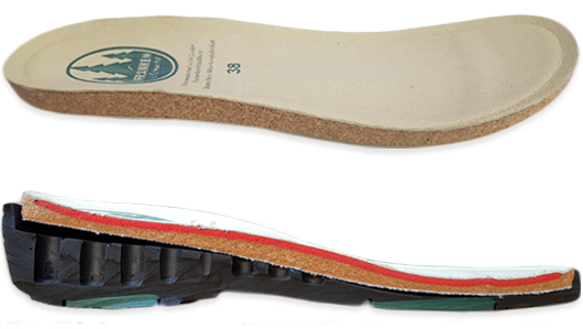 - основа стельки выполнена из натурального экологичного материала – коры пробкового дуба, чья пористая структура обеспечивает циркуляцию воздуха, практически не впитывает влагу и на длительное время предохраняет от появления неприятного запаха. Экстракт хвои в составе материала стельки оказывает дополнительное дезодорирующее и антисептическое действие