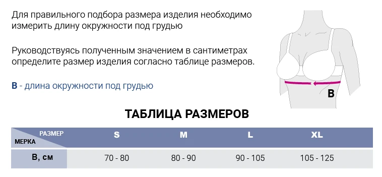 Гипоаллергенная воздухопроницаемая ткань обеспечивает комфортный температурный баланс для кожи. Четыре ряда крючков на бретельках позволяют регулировать уровень компрессии в соответствии с ходом восстановительных процессов. Плотные боковые вставки обеспечивают дополнительную поддержку.