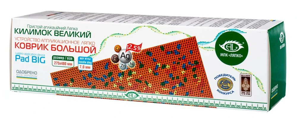 Аппликатор Ляпко благотворно влияет на организм за счет воздействия на кожу. Он представляет собой гибкую пластину из медицинской резины с закругленными иглами. Воздействие иглами стимулирует иммунную систему, улучшает кровообращение, повышает общий тонус мышц и работоспособность организма, снимает боль. Кроме того, при соприкосновении с кожей между иглами аппликатора образуются гальванические микротоки, которые создают эффект электрофореза. Регулярное использование аппликатора повышает жизненный тонус и работоспособность организма.