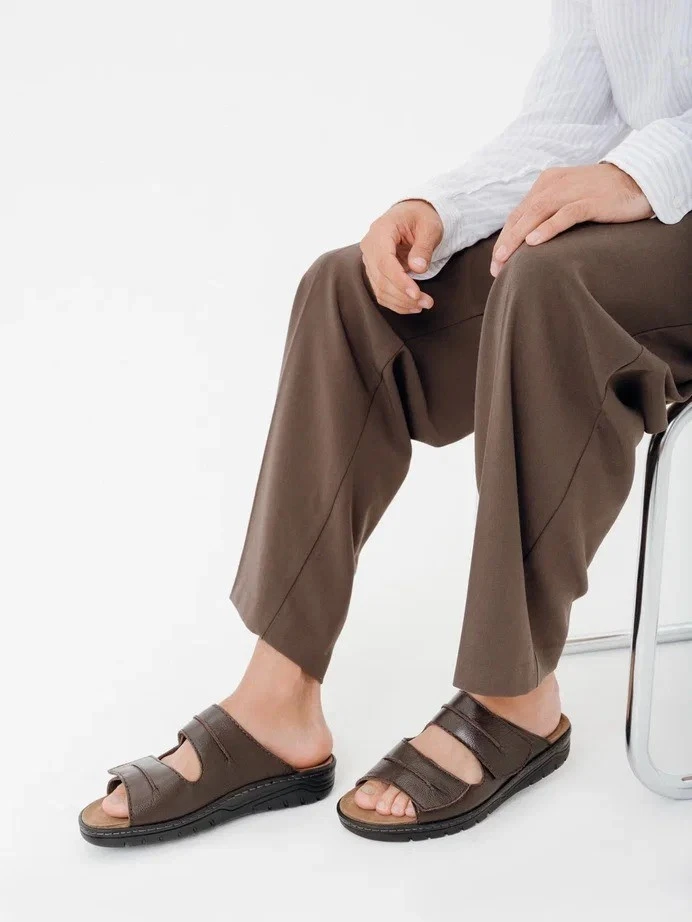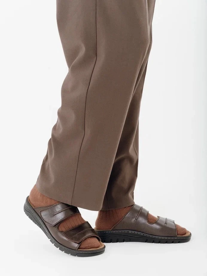 Мужские кожаные сабо в увеличенной полноте обеспечивают полную раскрываемость при помощи двух широких регулируемых ремешков с эргономичной застежкой велкро. Модель на застежках- липучках легко надеть и отрегулировать по стопе. Сабо выполнены из натуральных высококачественных и прочных материалов. Подкладка – натуральная кожа.