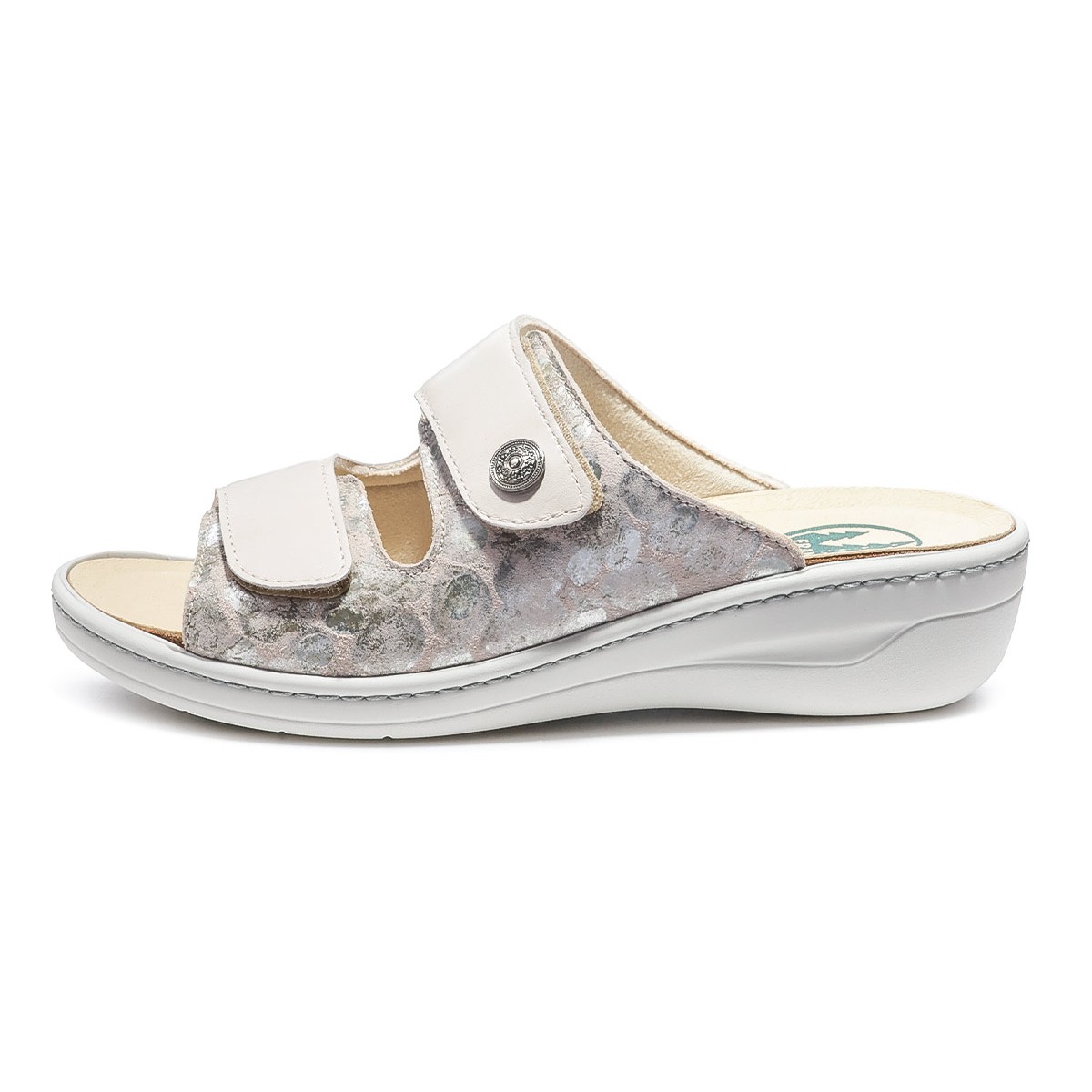 Бежевые сабо в широкой полноте выполнены из натуральной фантазийной кожи с перламутровыми деталями. Модель на липучках имеет полноту K и подходит на широкую стопу и высокий подъем. Повышенная комфортность сабо достигается благодаря мягкой эластичной вставке в области сустава большого пальца. Мягкая вставка защищает деформированный участок, не давит и не натирает. Подкладка модели, выполненная из мягкой дышащей микрофибры, деликатно облегает стопу.