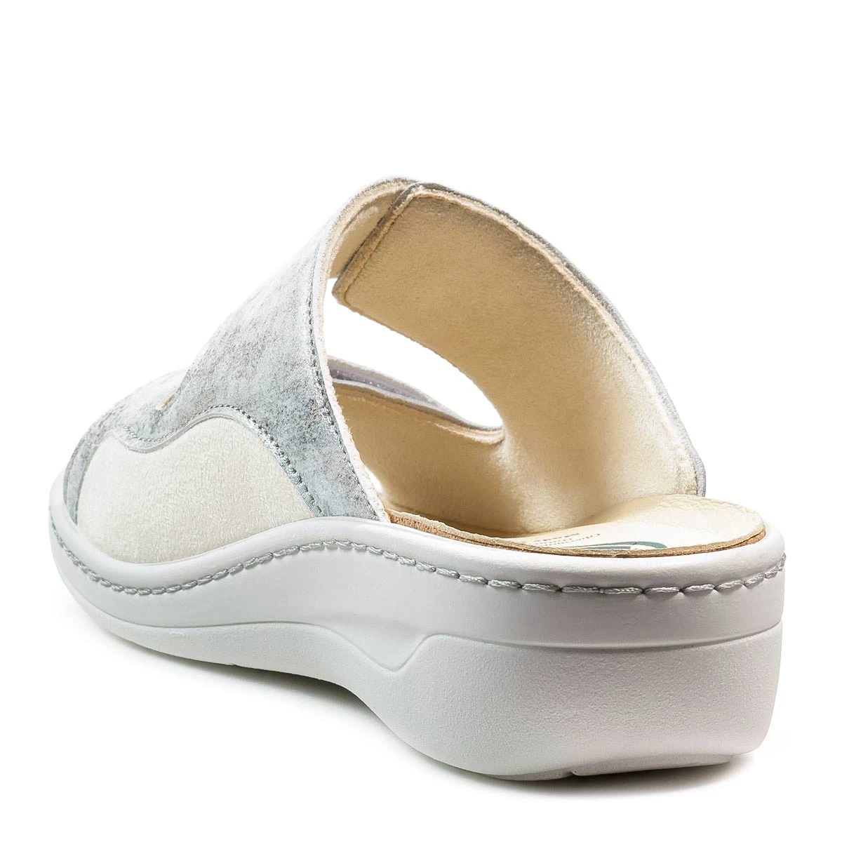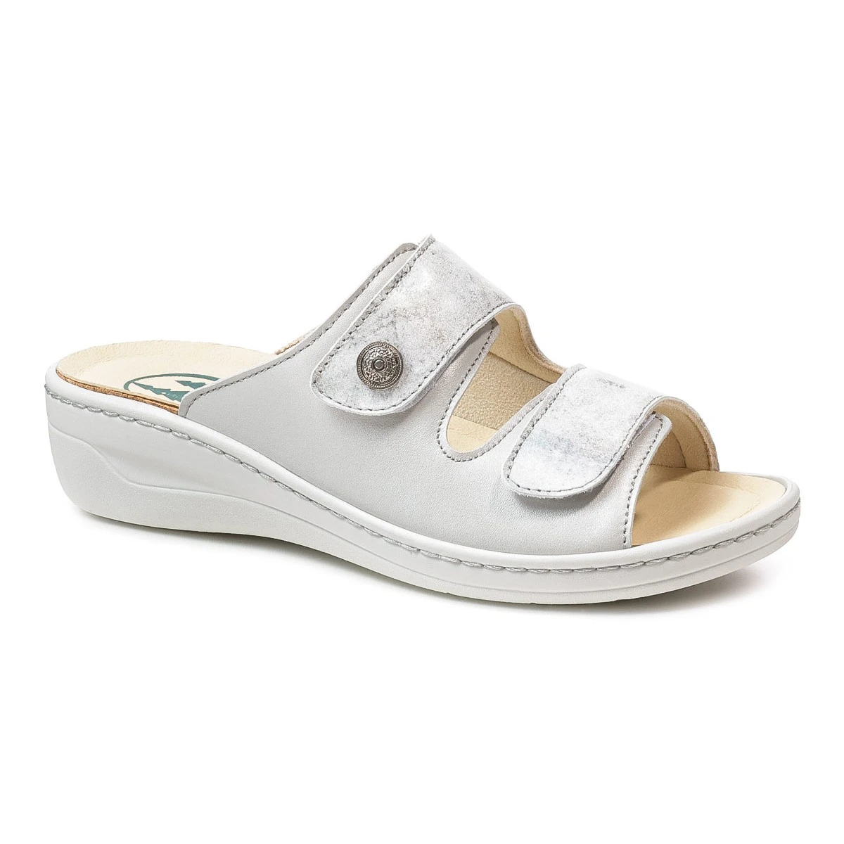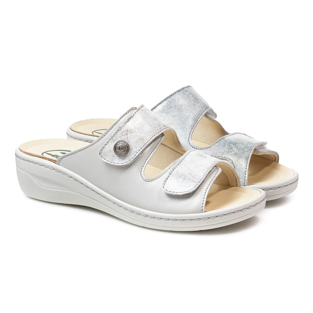 Сабо подходят на широкую стопу и высокий подъем, изготовлены из натуральной кожи с рисунком под мрамор. Благодаря двум застежкам велкро модель легко отрегулировать по стопе. Вставка из мягкого эластичного материала в области сустава большого пальца не давит на деформированные участки стопы.