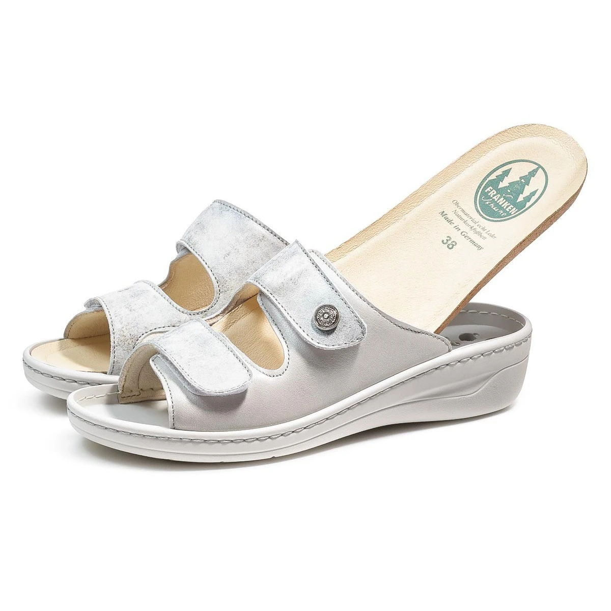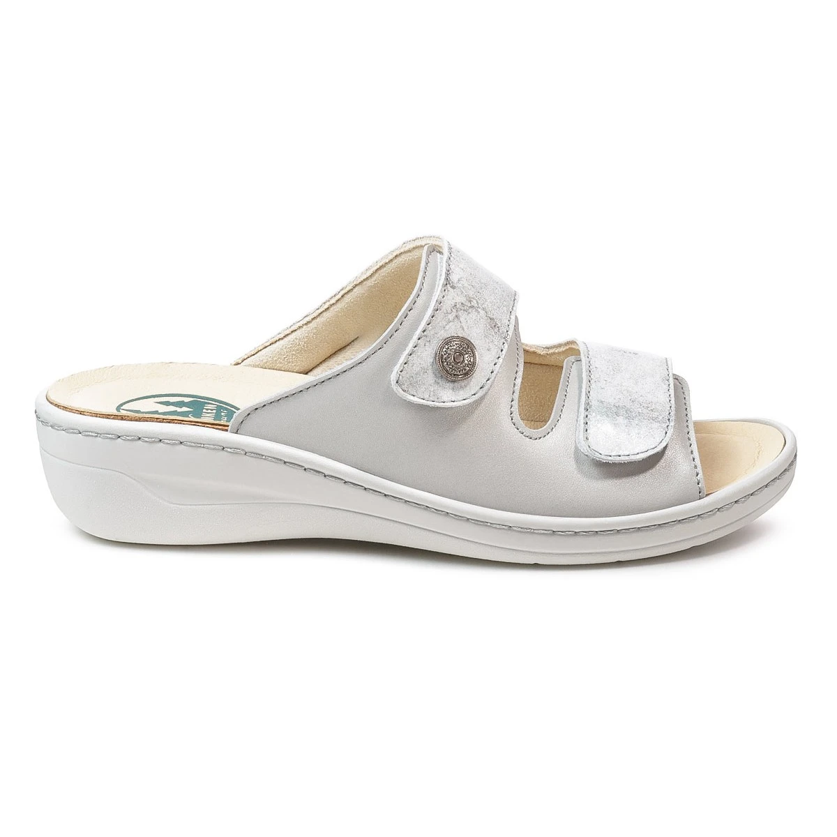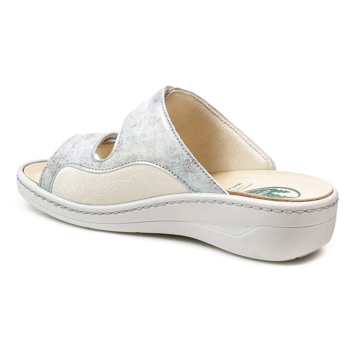 Сабо подходят на широкую стопу и высокий подъем, изготовлены из натуральной кожи с рисунком под мрамор. Благодаря двум застежкам велкро модель легко отрегулировать по стопе. Вставка из мягкого эластичного материала в области сустава большого пальца не давит на деформированные участки стопы.