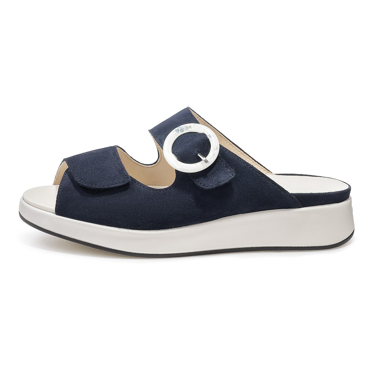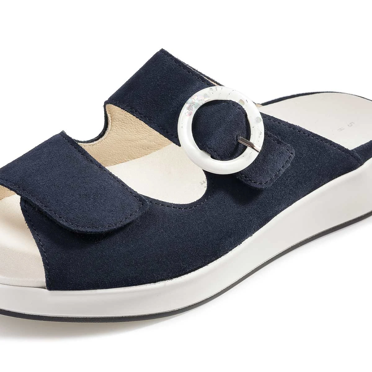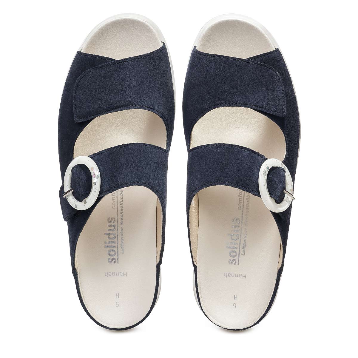 Замшевые сабо в синем цвете на колодке Hannah в увеличенной полноте Н – стильная и удобная модель для дома и летних прогулок. Акцентом в модели является круглая декоративная пряжка с имитацией рога. Обе застежки-липучки – велкро – удобно и надежно регулируются по ноге.