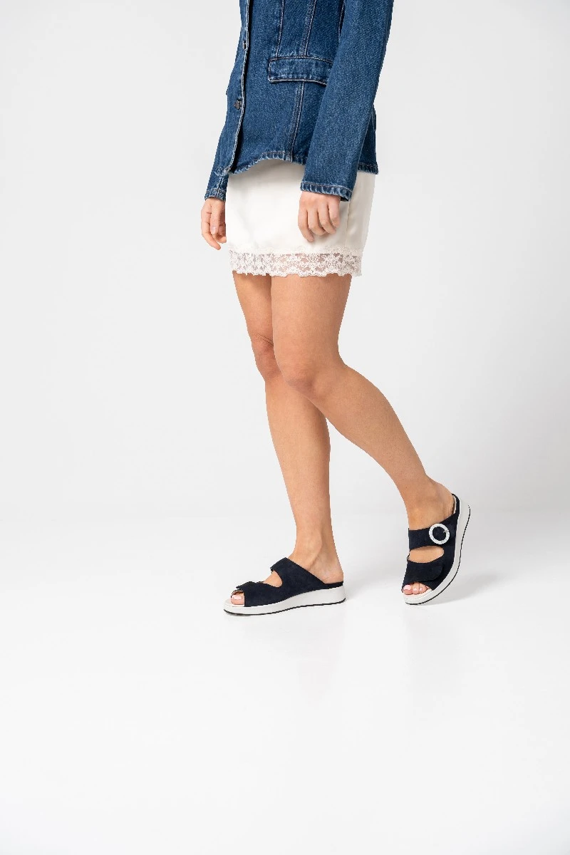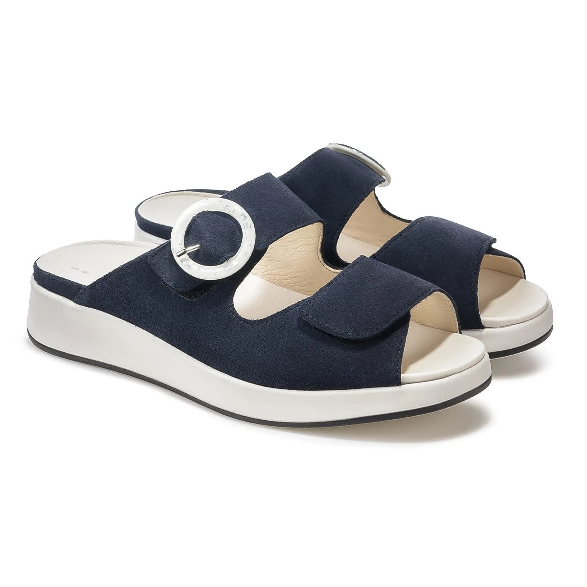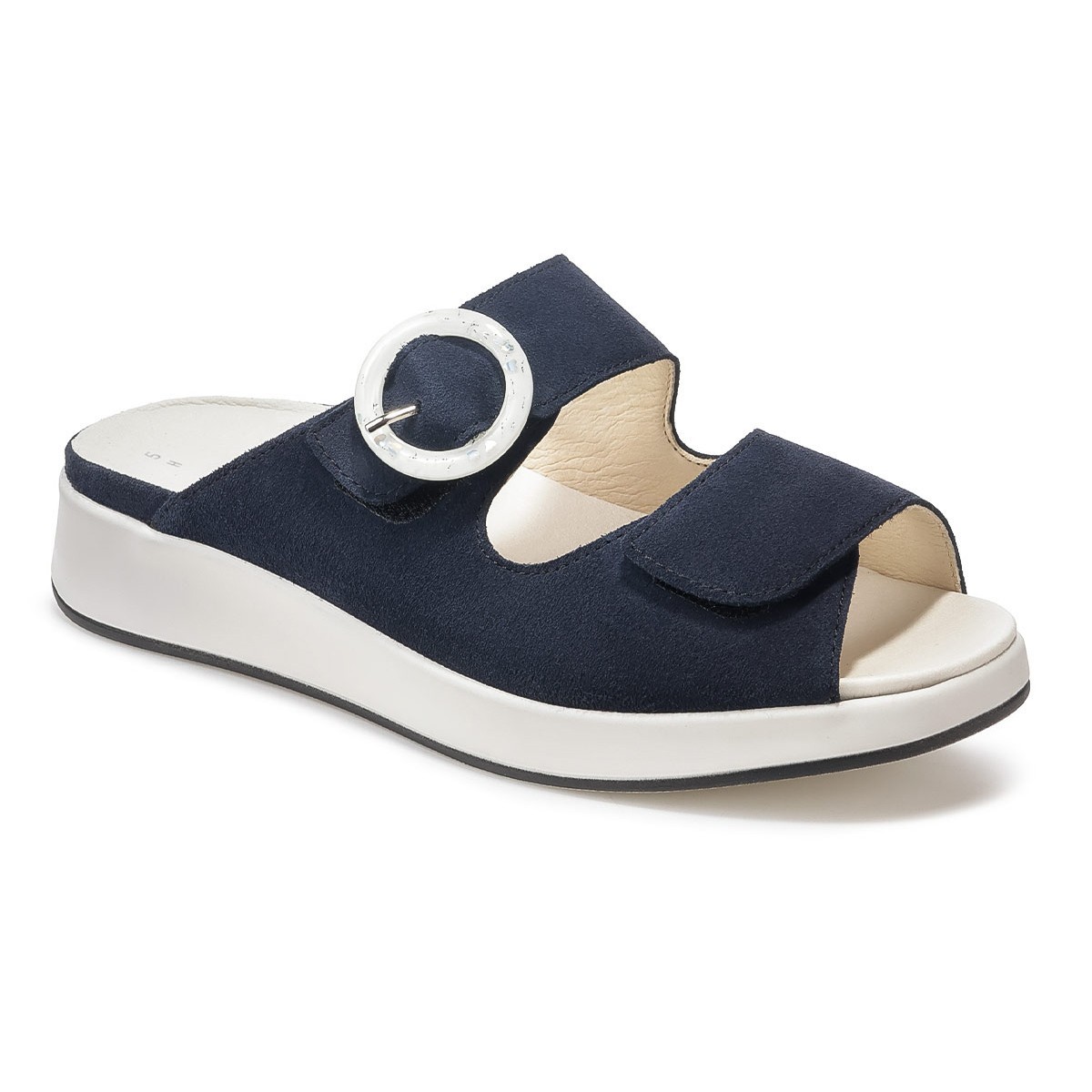 Замшевые сабо в синем цвете на колодке Hannah в увеличенной полноте Н – стильная и удобная модель для дома и летних прогулок. Акцентом в модели является круглая декоративная пряжка с имитацией рога. Обе застежки-липучки – велкро – удобно и надежно регулируются по ноге.
