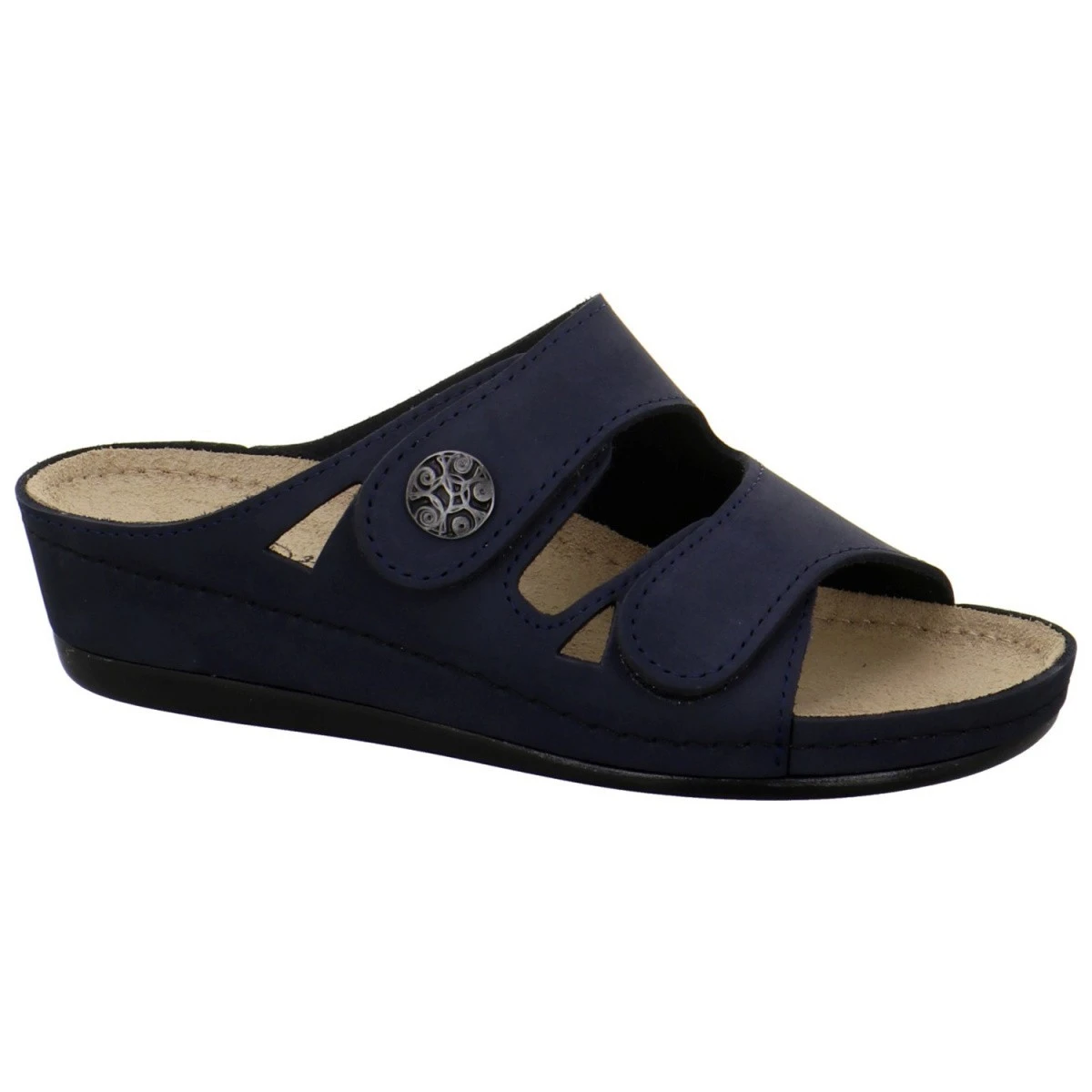 В поисках удобной летней обуви Вы точно не пропустите сабо из натурального нубука на широких регулируемых ремешках. Синие сабо на липучках - это о теплых летних днях и продолжительных прогулках. Стильные женские сабо на танкетке (подъем в пятке 3,5 см) легко адаптировать к городскому, пляжному и расслабленному летнему силуэту.