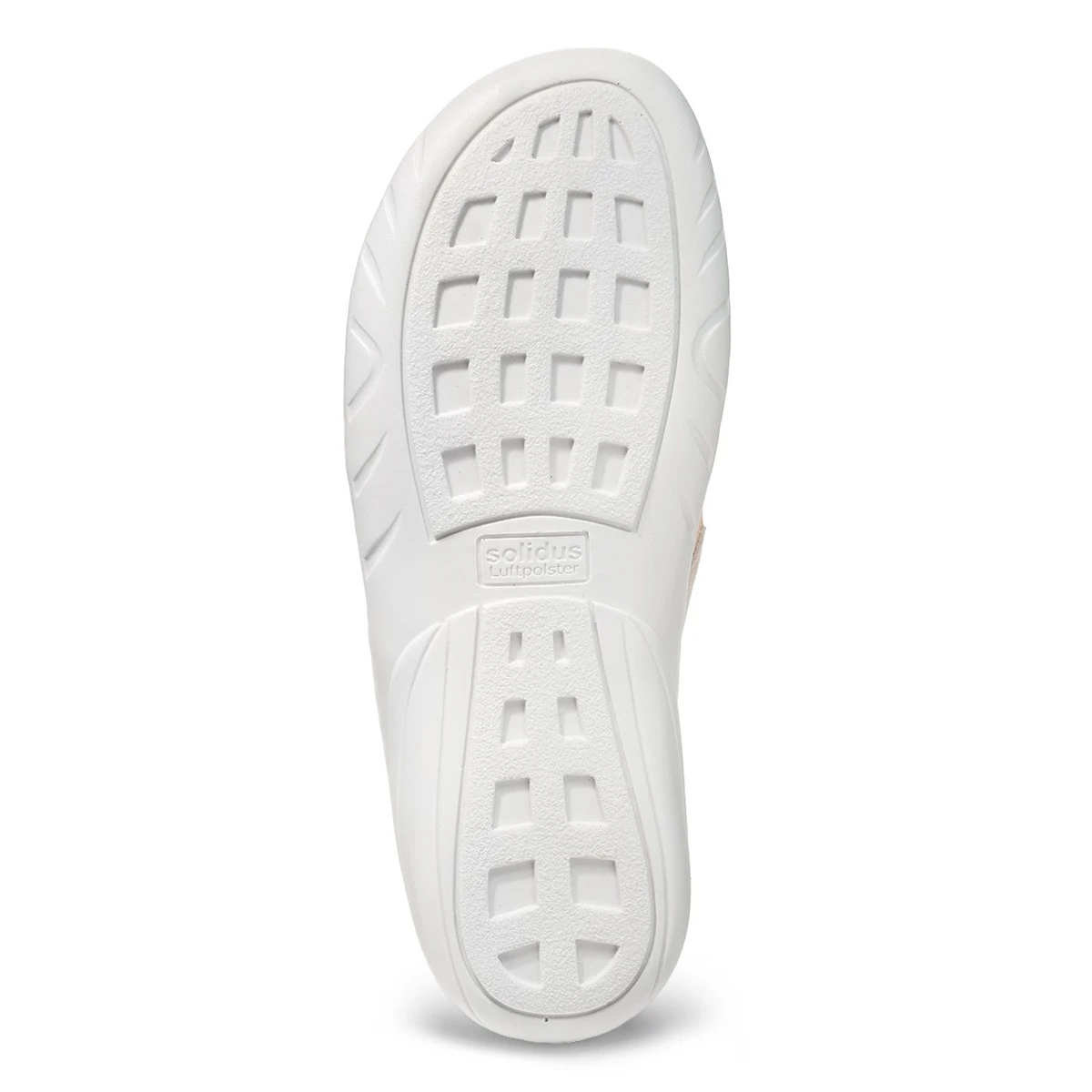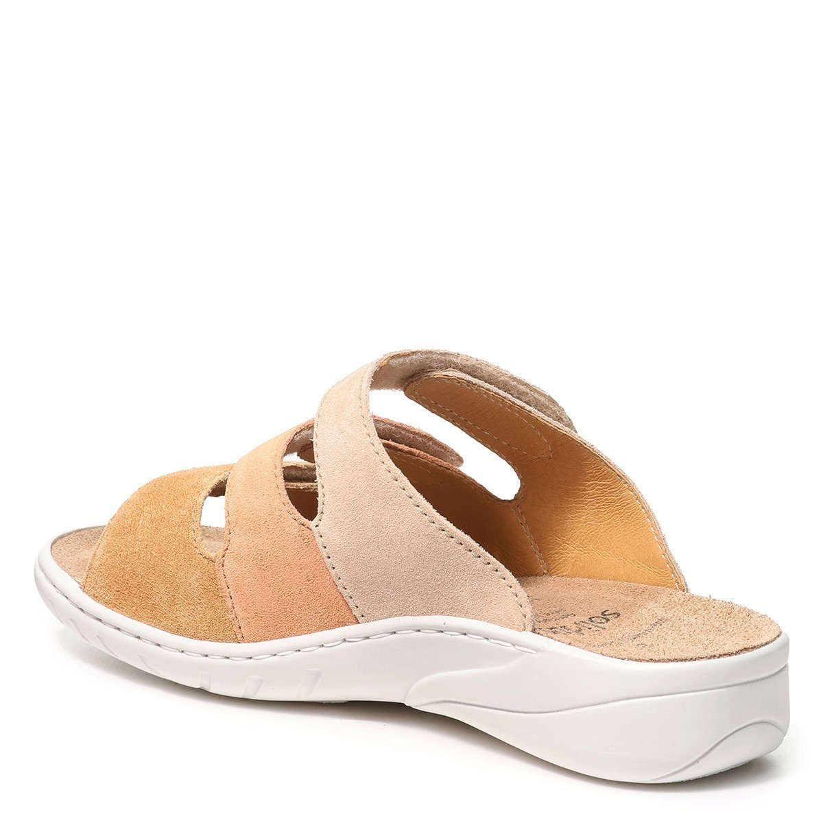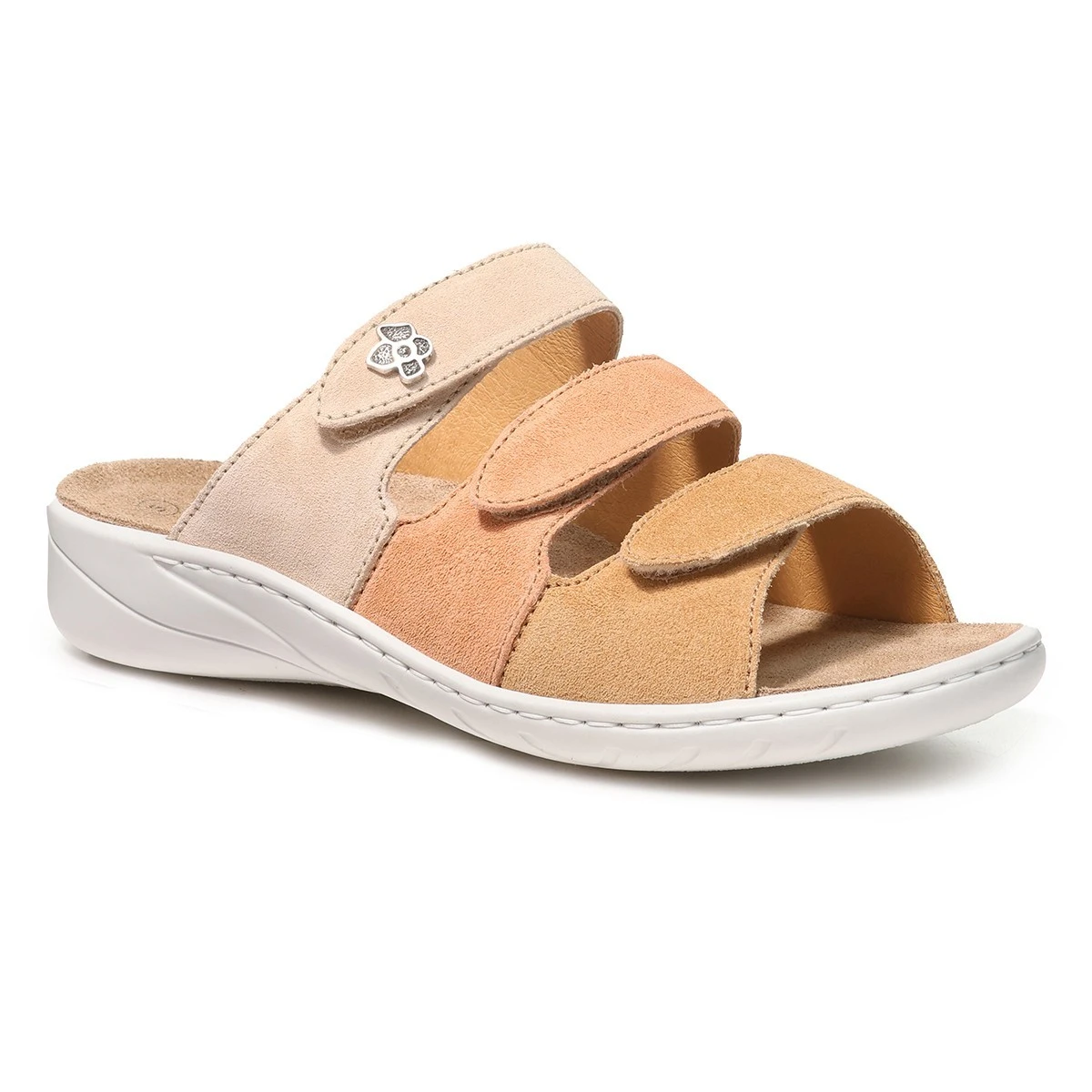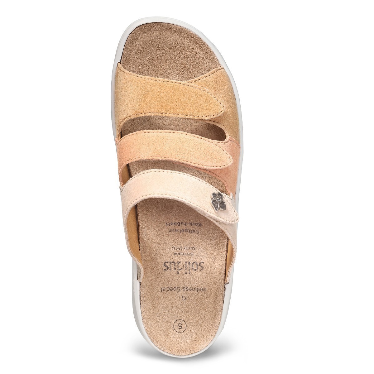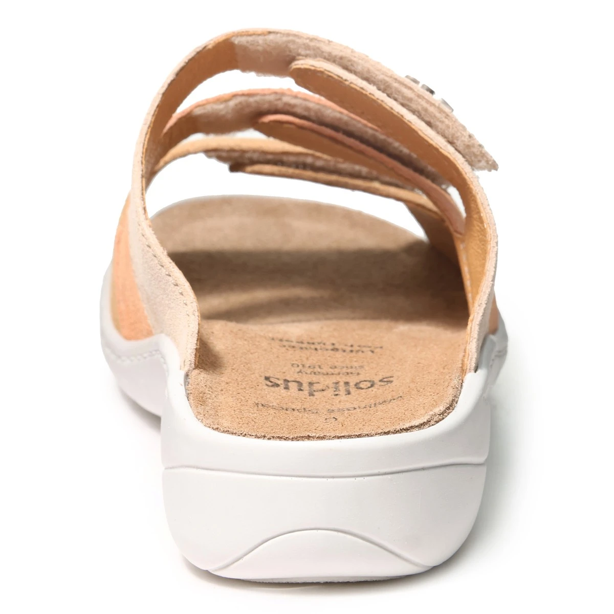 Женские сабо немецкого бренда Solidus выполнены в великолепном летнем цветовом сочетании. Каждый из трех ремешков разных песочных оттенков, сочетающихся между собой. На верхнем ремешке - небольшая модная брошь в форме цветка с декоративным камнем. С помощью трех застежек-липучек обувь оптимально адаптируется к ноге.