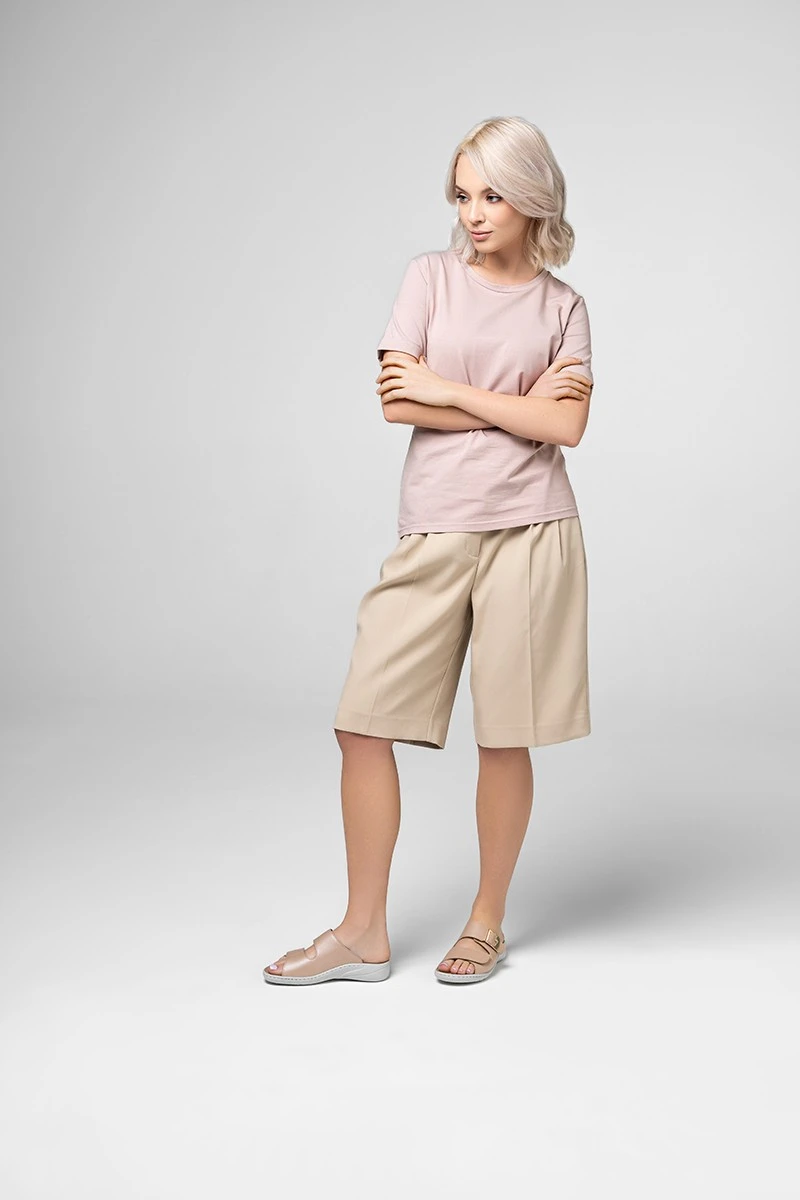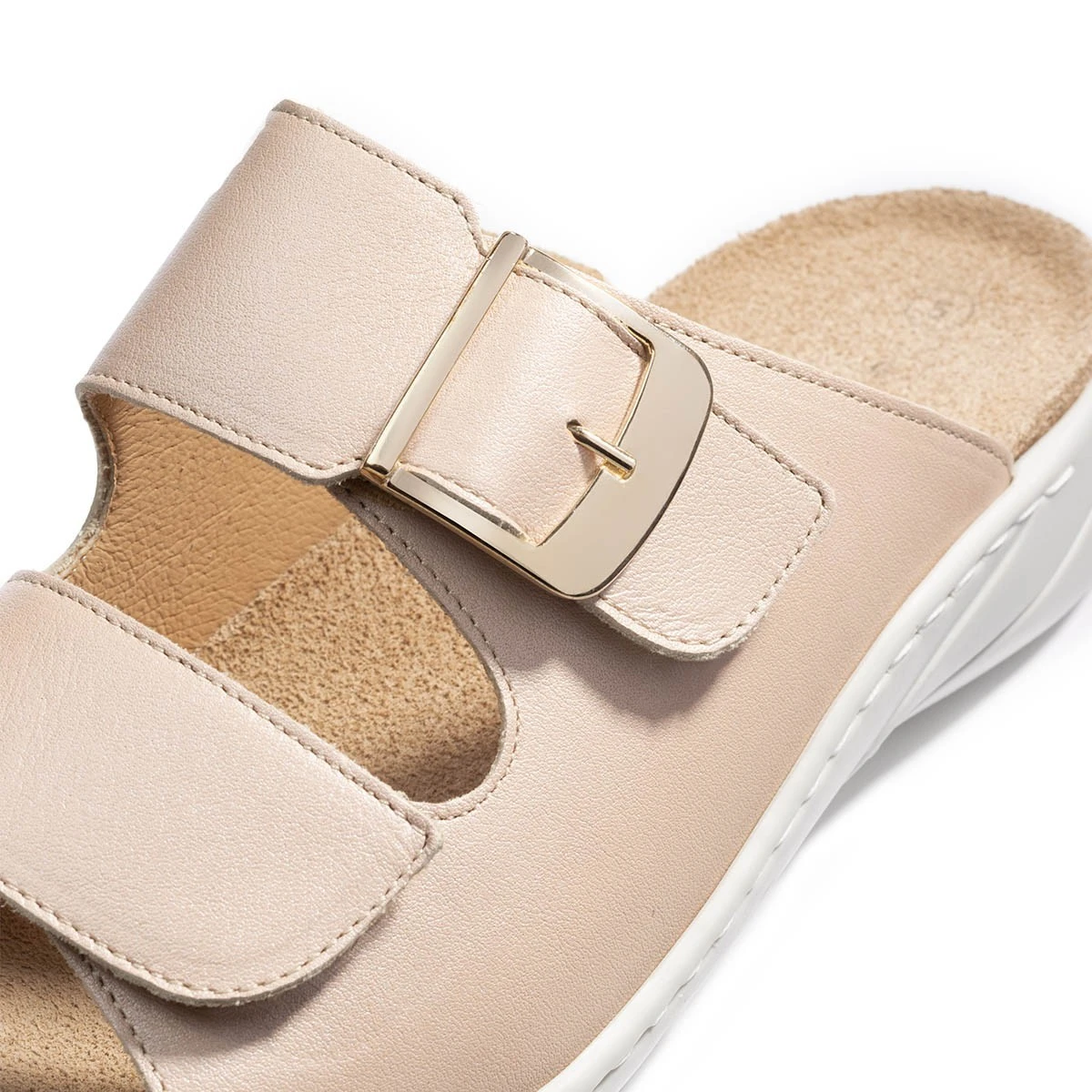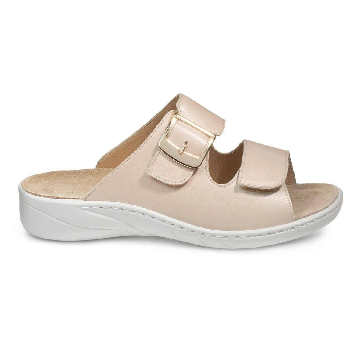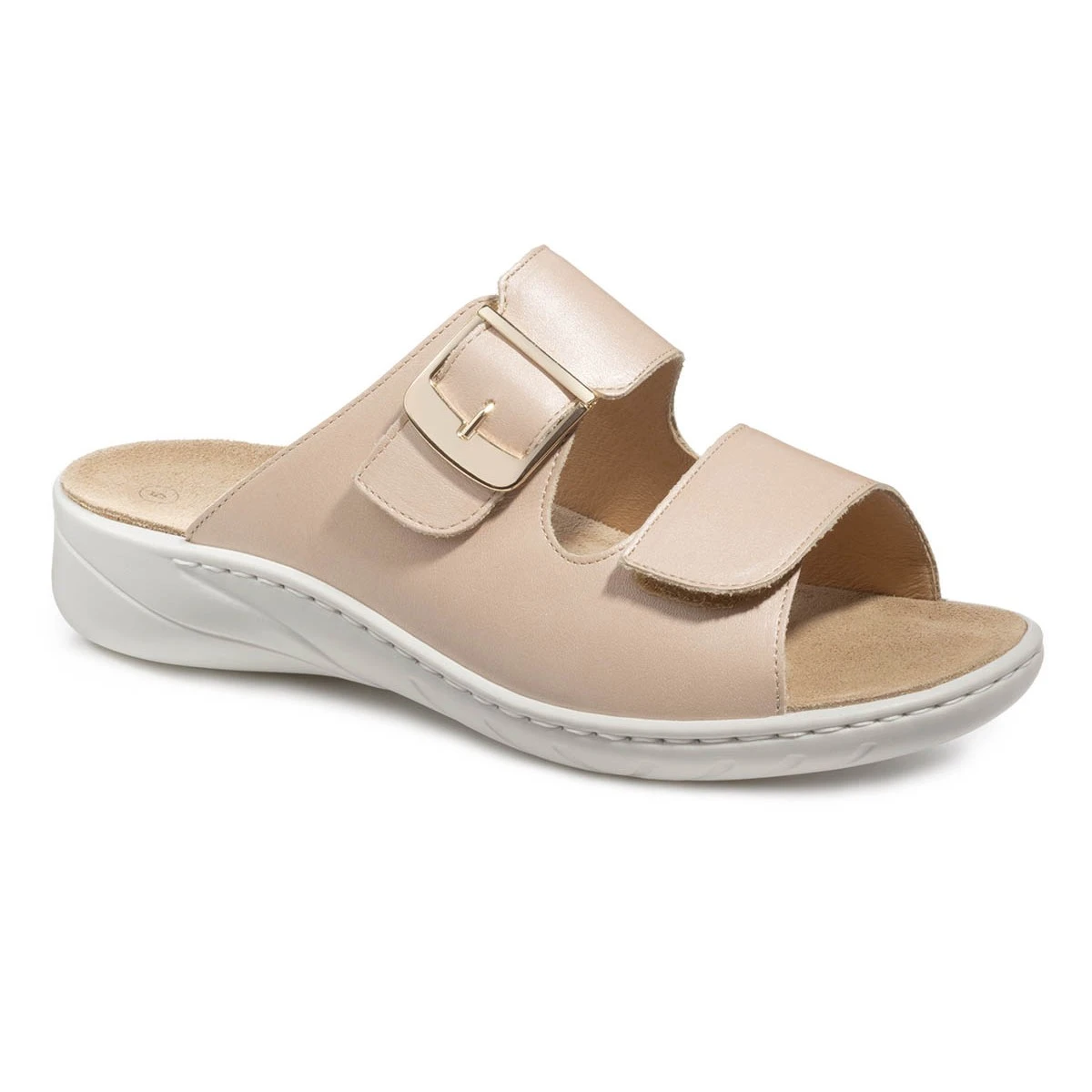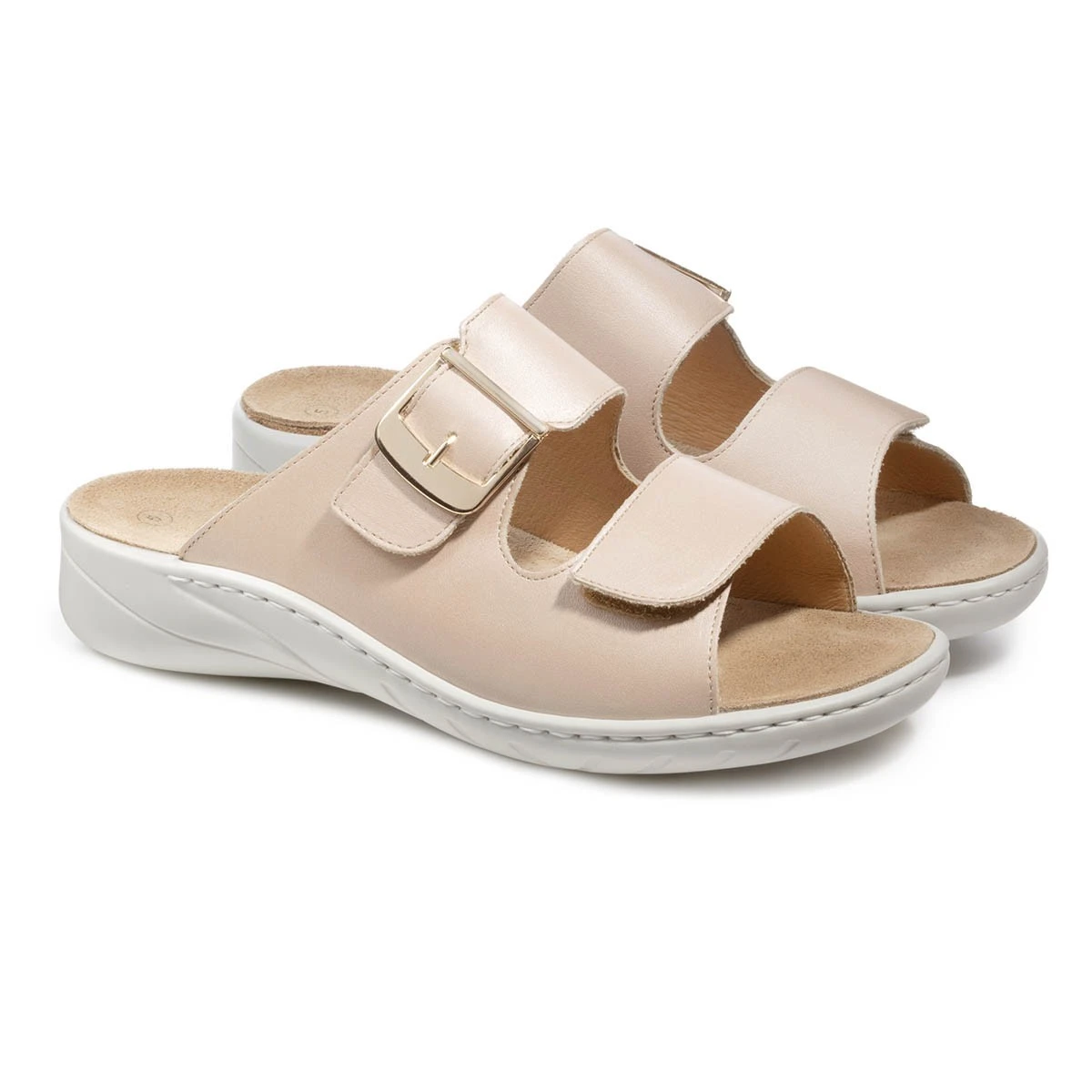 Сабо выполнены из натуральной кожи в красивом пудровом оттенке и подходят на узкую стопу. Модель имеет полною раскрываемость благодаря двум широким ремешками на застежках велкро, которые облегчают надевание и регулировку обуви по стопе. Крупная декоративная металлическая пряжка придает модели изысканности.