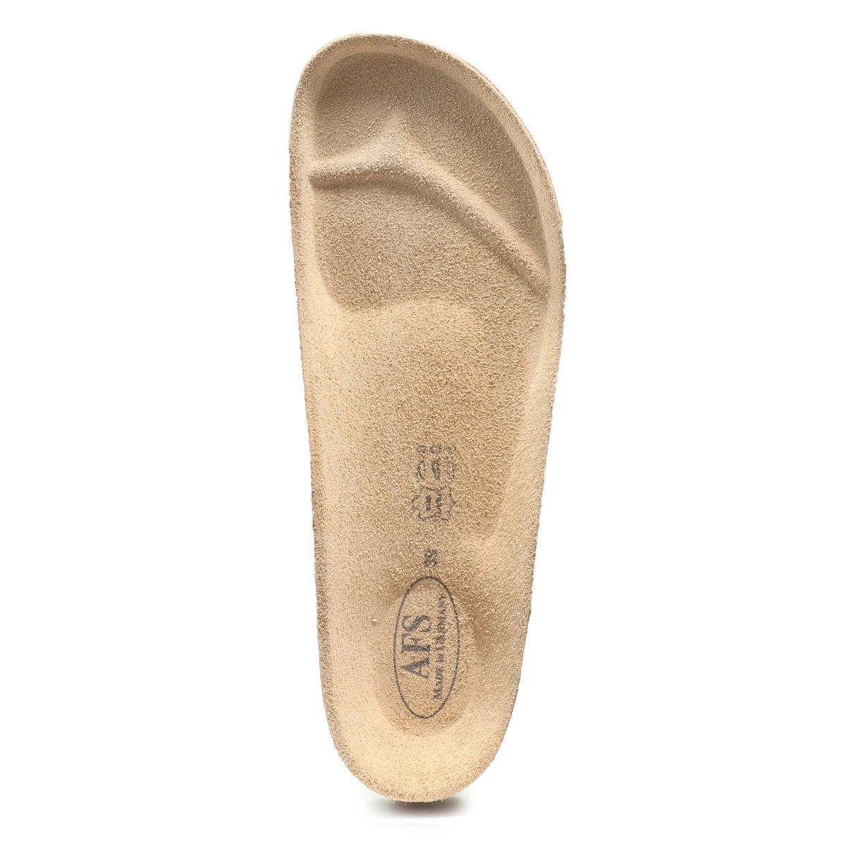 Уникальная анатомическая стелька выполнена из коры пробкового дуба со слоем из вспененного материала и финишем из натуральной кожи велюровой выделки. Форма стельки повторяет отпечаток здоровой стопы на песке, поддерживает своды стопы, пальцы и пятку в анатомически правильном положении, снимая усталость. Оригинальная анатомическая стелька AFS оснащена разделителем пальцев для их естественного расположения, углублением в пяточной области для устойчивости при ходьбе и бортиком по периметру для фиксации ноги в правильном положении. Стелька из пробкового дуба гасит ударные нагрузки на суставы ног и позвоночник. Покрытие стельки из натуральной кожи сохраняет стопы сухими и препятствует скольжению ноги внутри обуви, что очень важно в летний период.