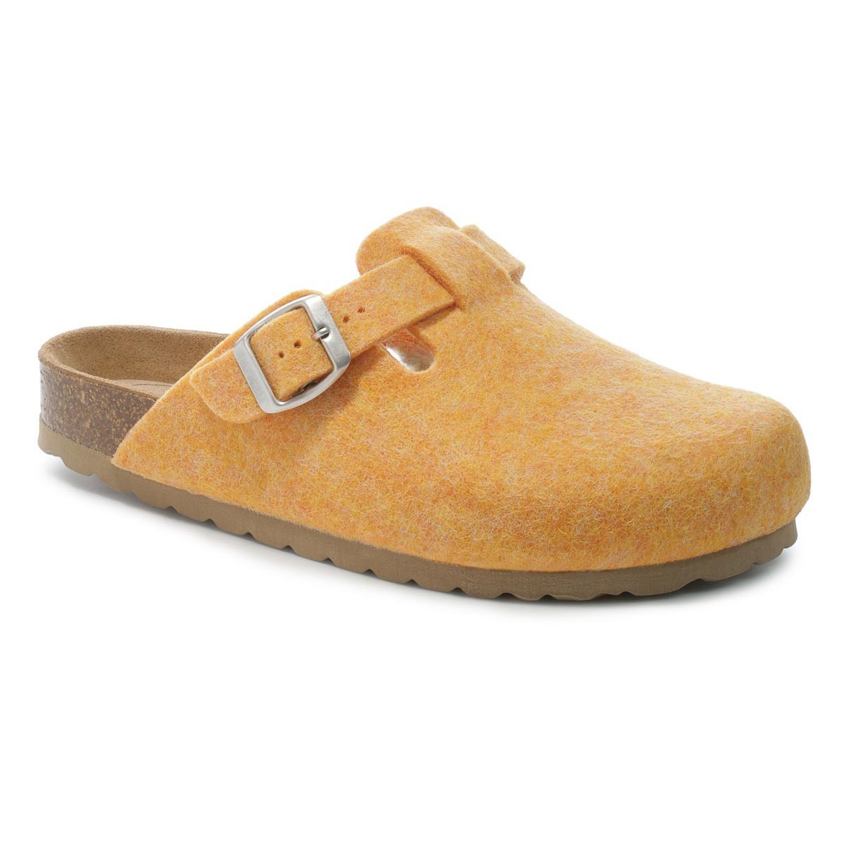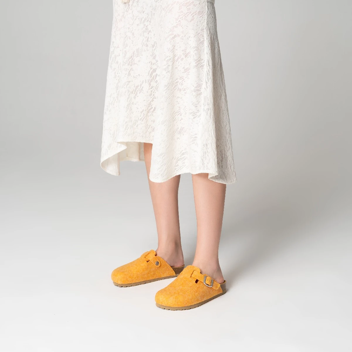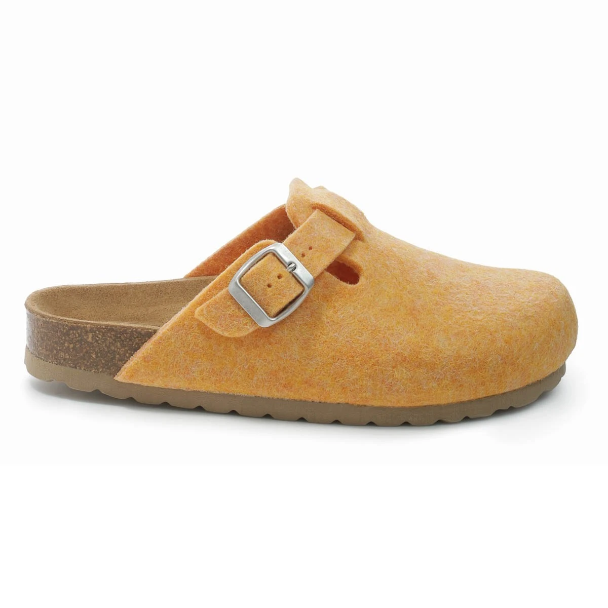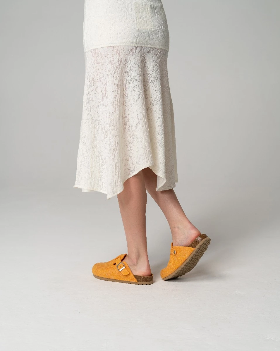 Женские домашние клоги в нежно-оранжевом цвете сразу привлекают к себе внимание! Эта пара выполнена из натурального войлока с регулировкой в подъеме. Материал верха дышащий и при этом хорошо сохраняющий тепло. Металлическая фурнитура цвета состаренного серебра не содержит никель и кадмий и является гипоаллергенной.