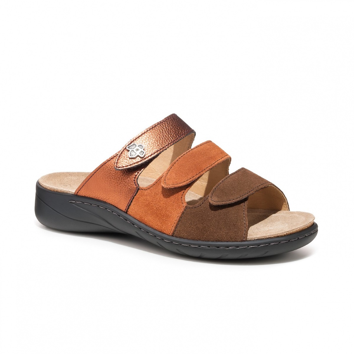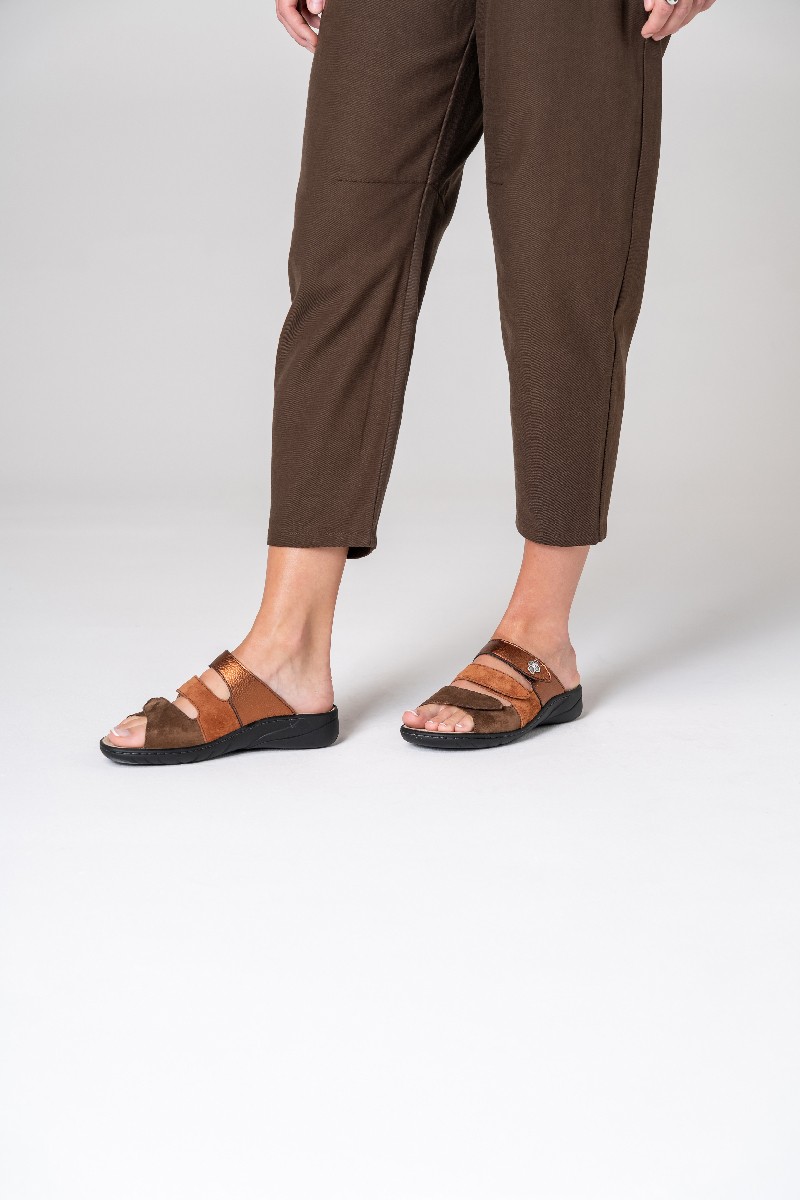 Классические женские сабо из замши и кожи коричневых и медных оттенков имеют три ремешка на липучках. Благодаря им обувь имеет полною раскрываемость, что облегчает надевание и регулировку модели по стопе.