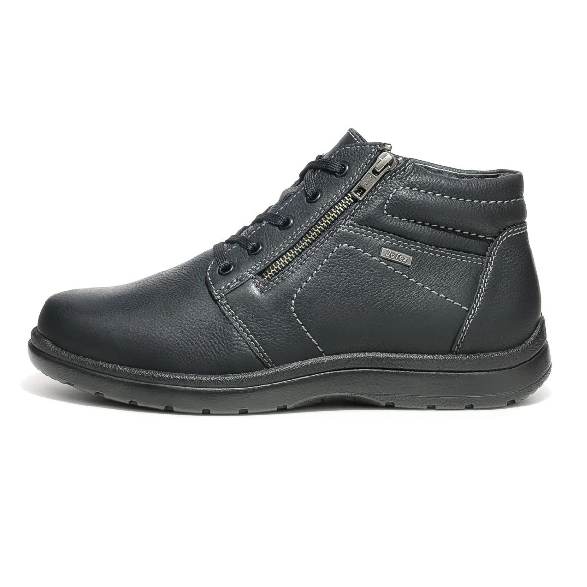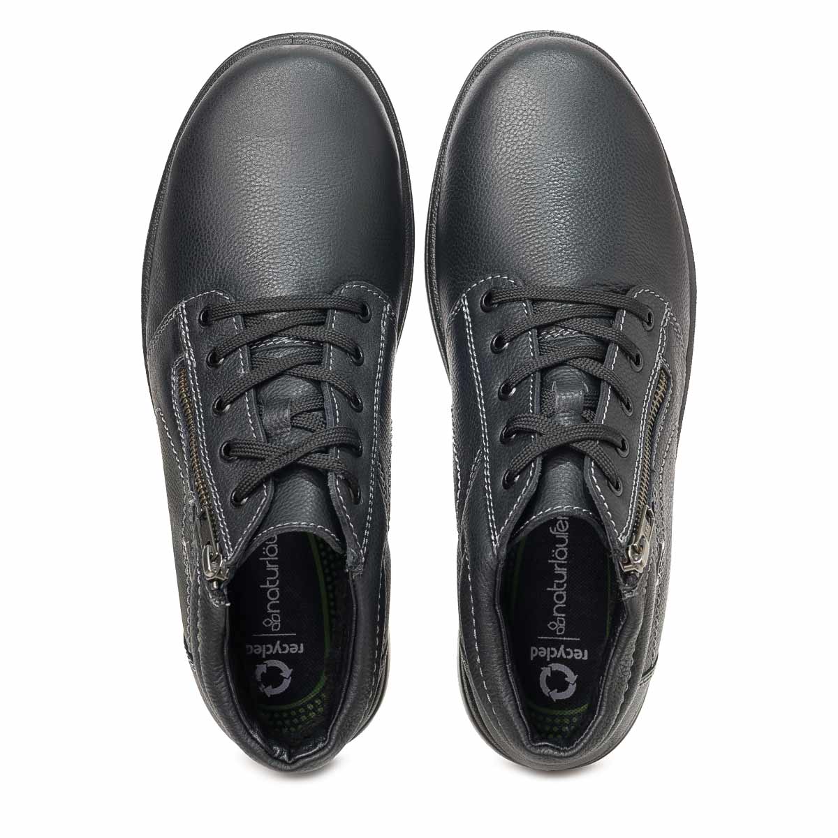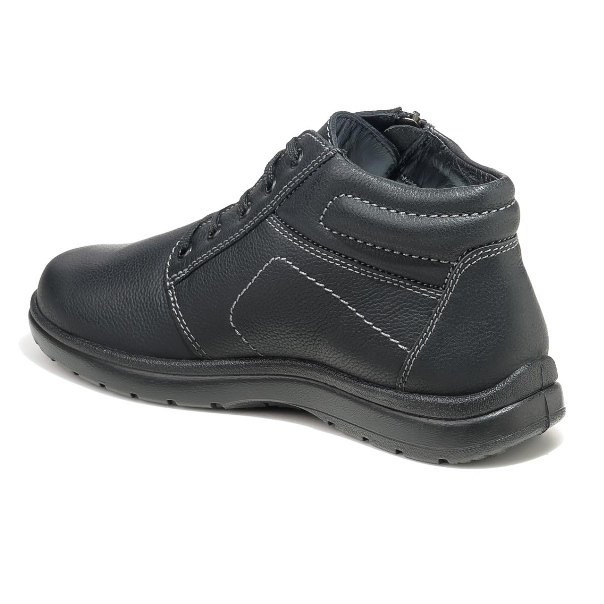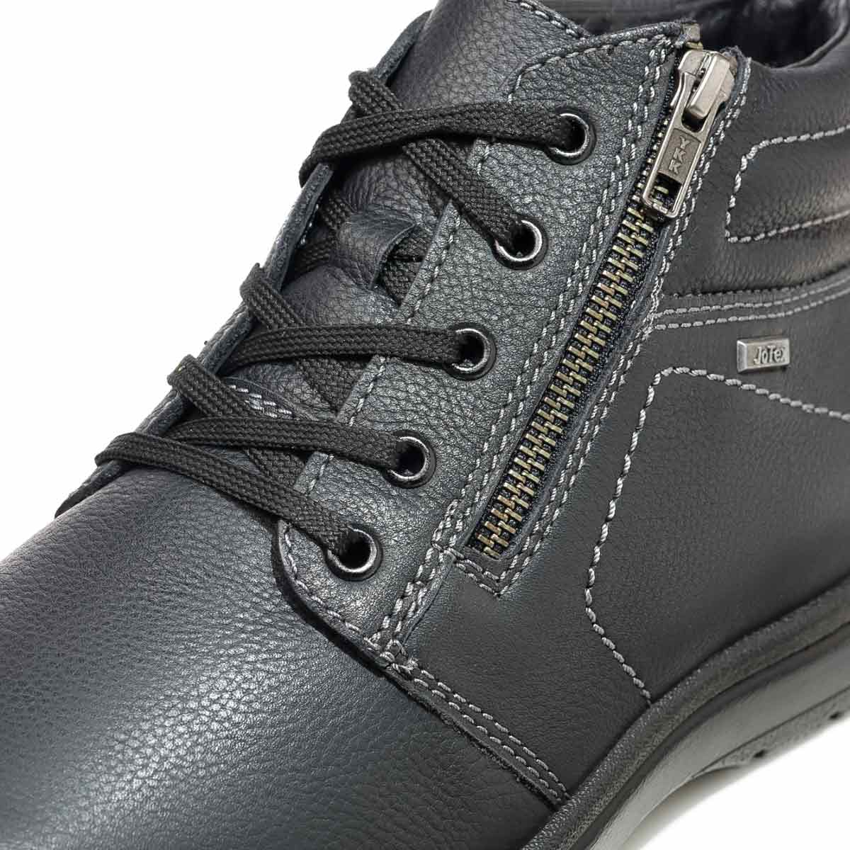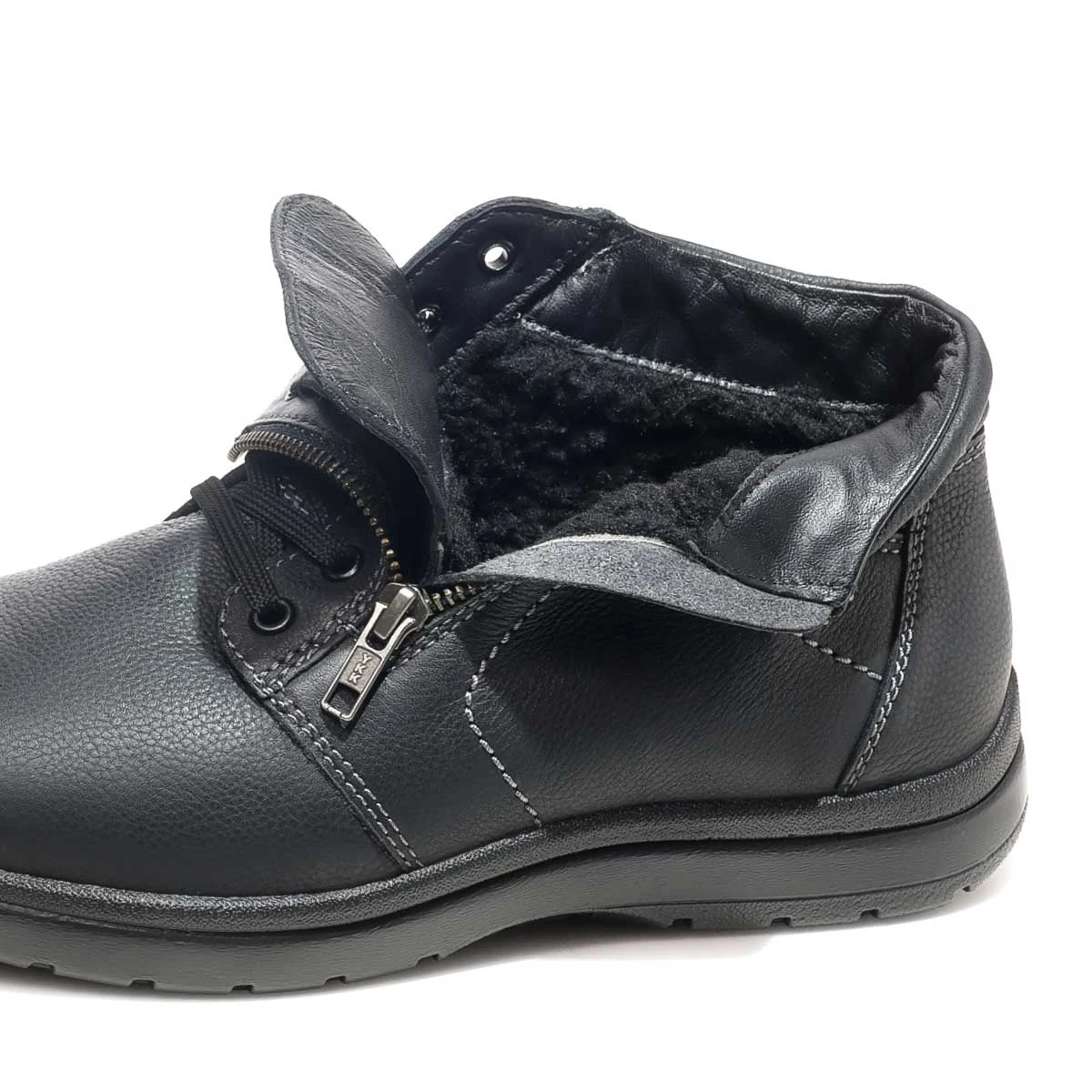Зимние ботинки на шнуровке и молнии выполнены из натуральной, зернистой и прочной кожи, за которой легко ухаживать в холодное время года. Поэтому ботинки подходят для повседневной носки, что особенно актуально в холодное время года. Однотонный классический цвет модели незаменим для гардероба в стиле кэжуал.