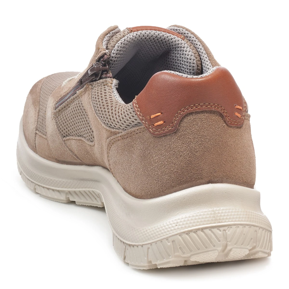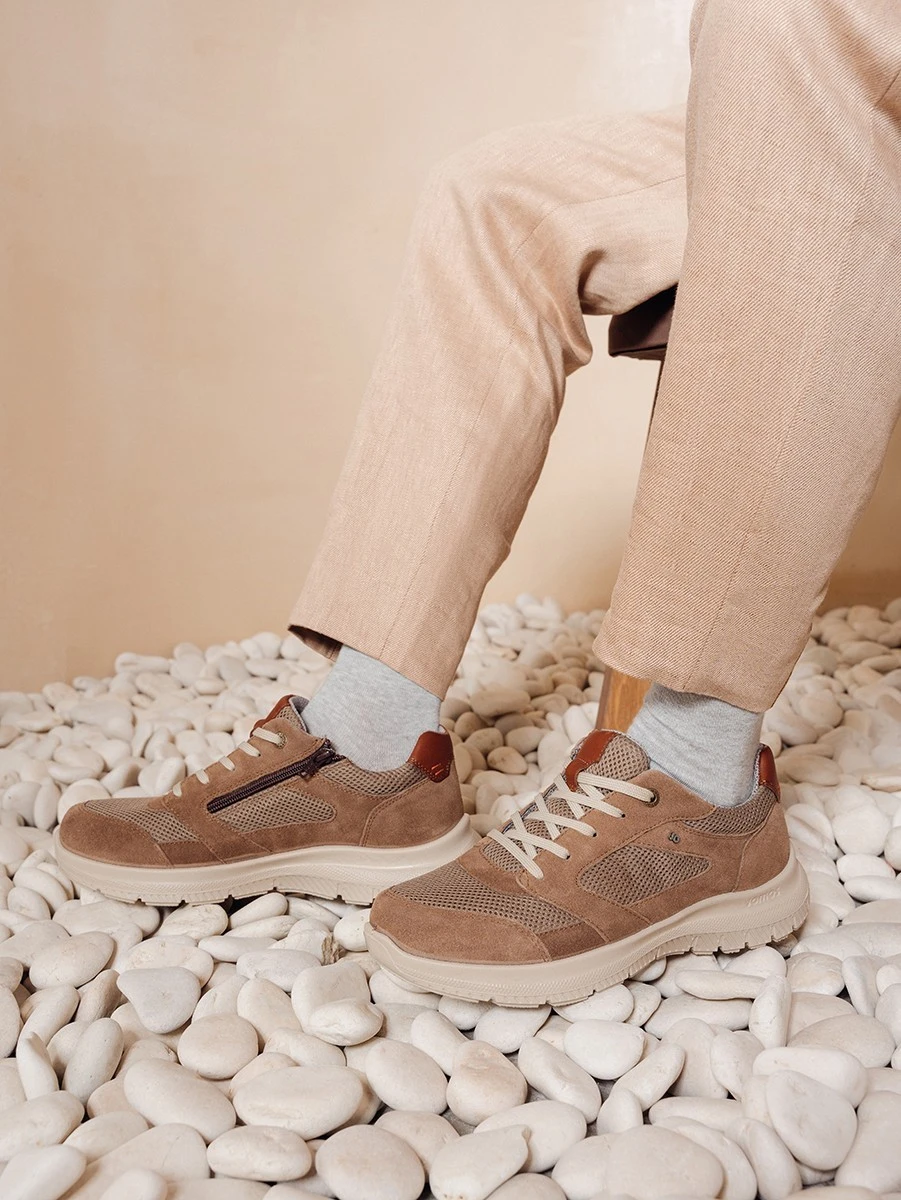 Замшевые кроссовки на шнуровке и молнии в благородном песочном оттенке сегодня обретают новое прочтение, становясь современной классикой без ограничений в стилизации. Молния быстро и надежно фиксирует обувь, а шнуровка удобно регулируется в соответствии с собственными параметрами ноги.