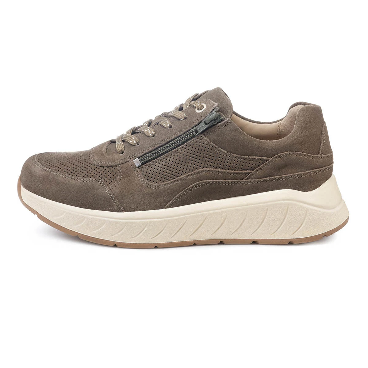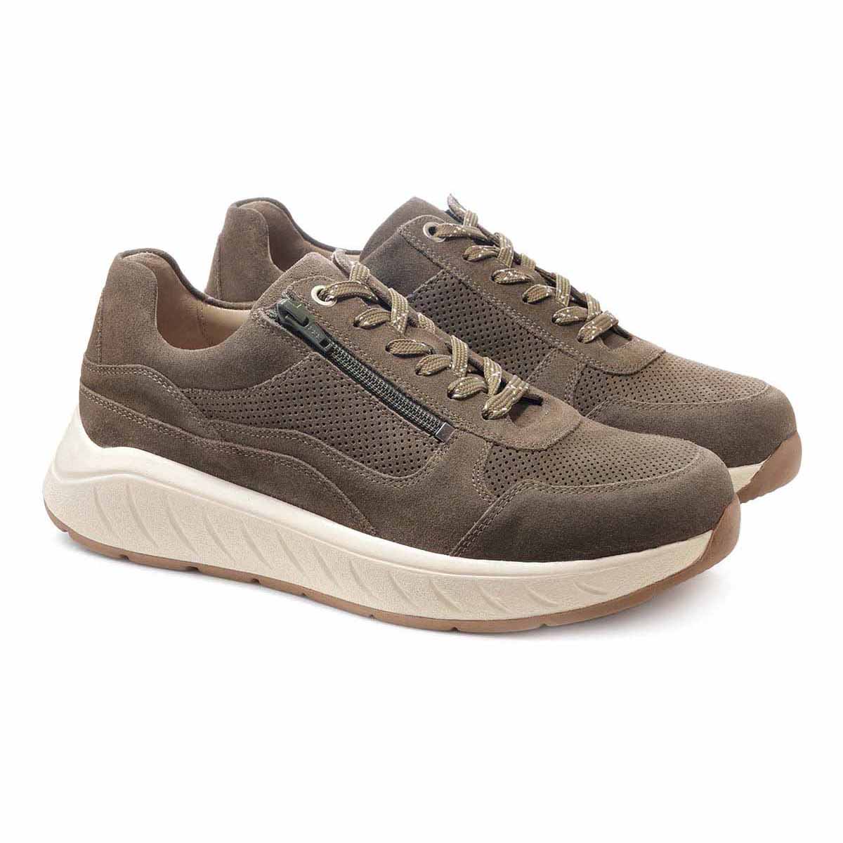 Стильные и удобные кроссовки выполнены из мягкой натуральной замши цвета хаки.
