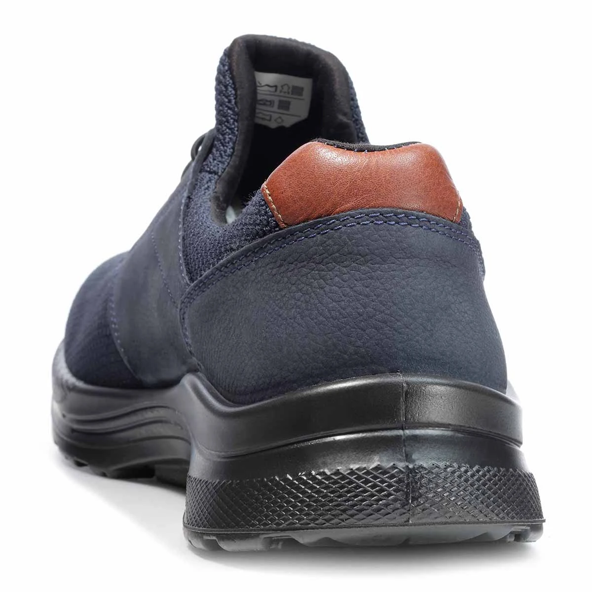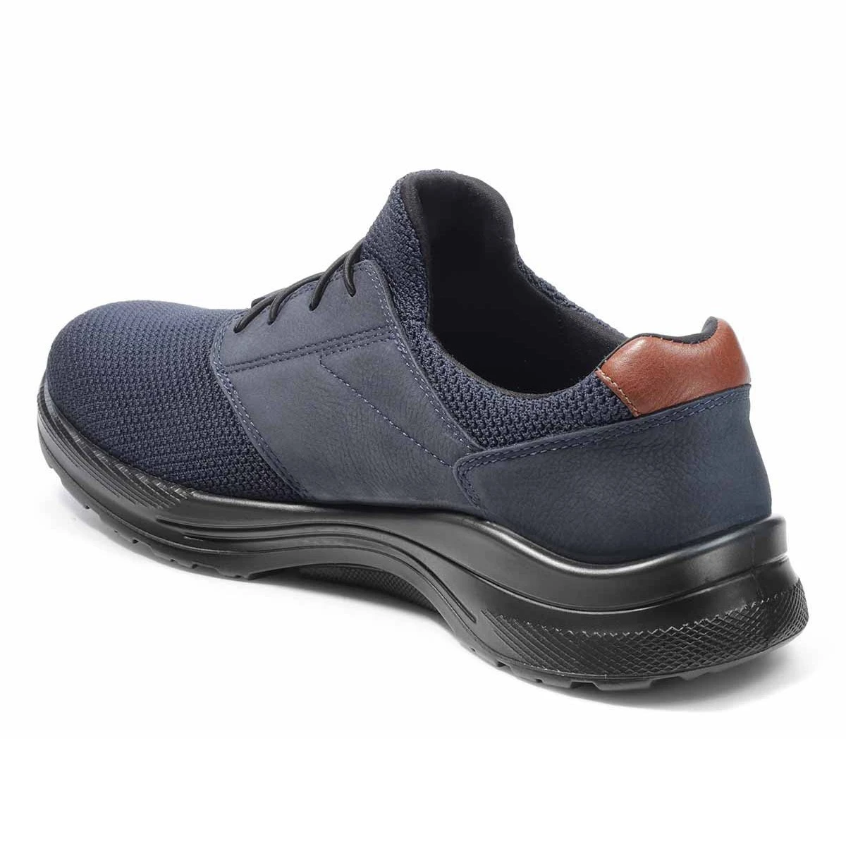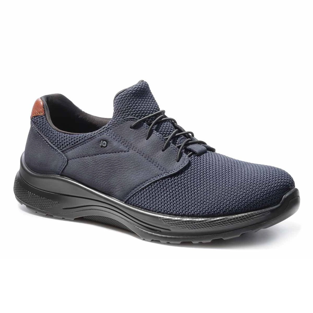 Синие кроссовки в увеличенной полноте Н выполнены с эластичным вязаным материалом в области союзки для снятия давления в проблемных зонах стопы.