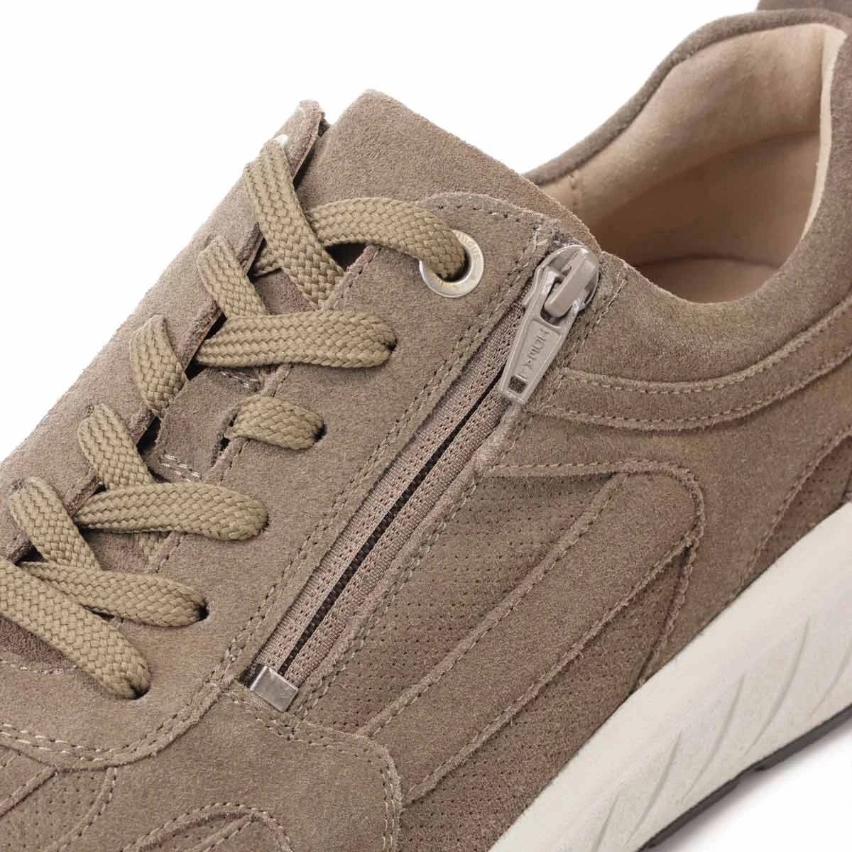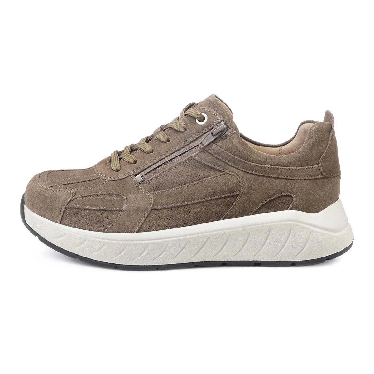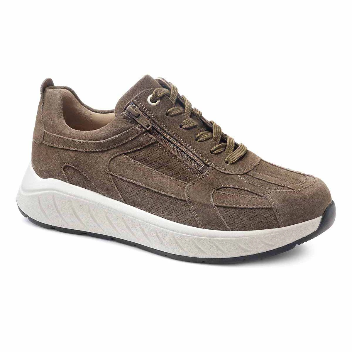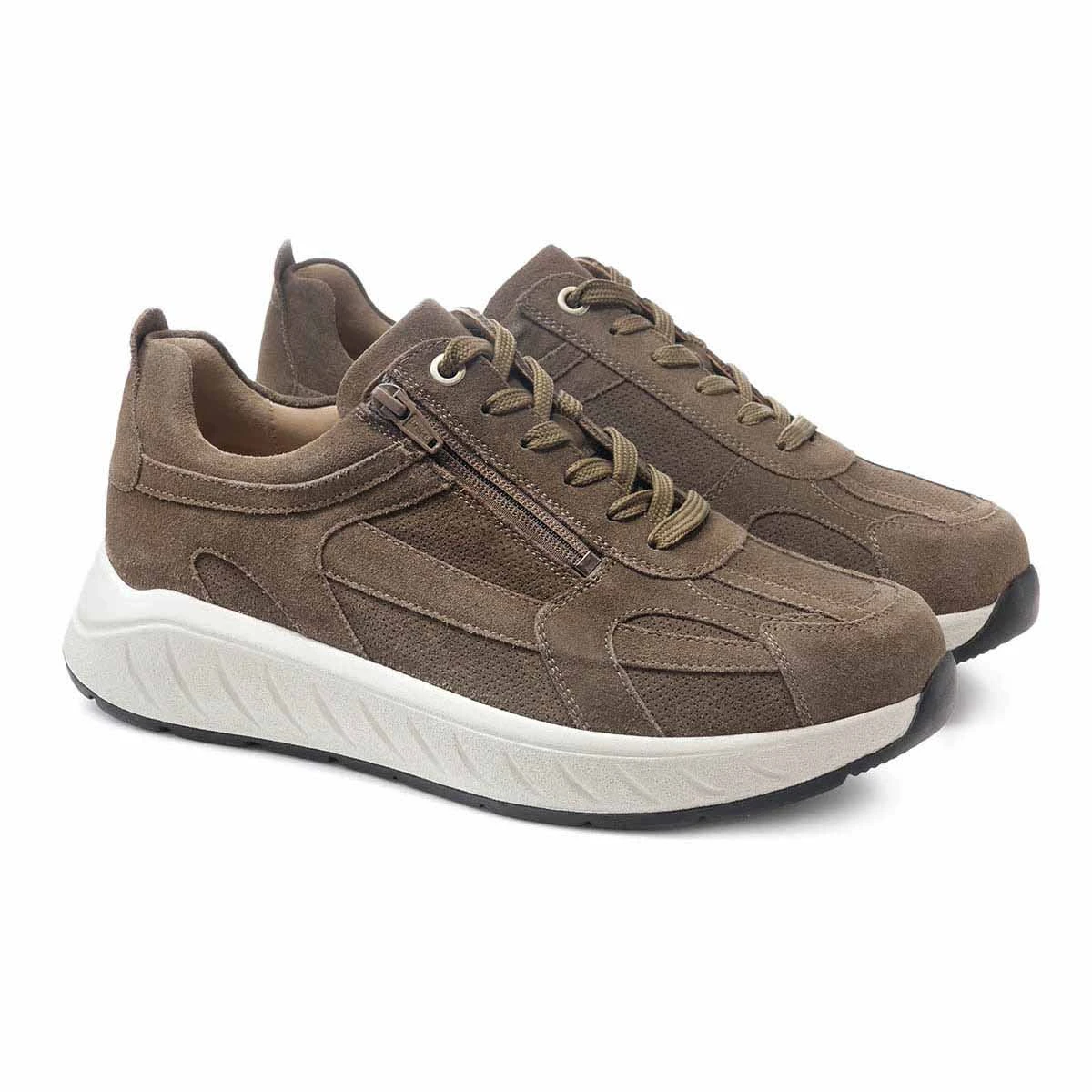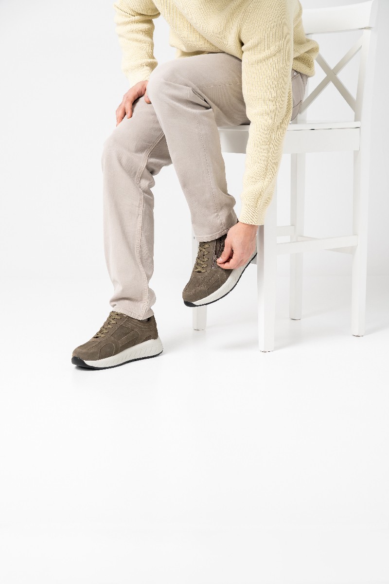 Стильные и удобные кроссовки выполнены из мягкой натуральной замши цвета хаки. Полнота обуви 2в1: в комплект с обувью входят две пары стелек: верхняя анатомическая стелька с поддержкой сводов стопы и дополнительная нижняя стелька. При использовании двух стелек одновременно полнота обуви соответствует значению H (увеличенная полнота); если вытащить нижнюю стельку и использовать только основную анатомическую стельку, полнота обуви увеличивается до значения K (широкая полнота, также подходит на высокий подъем);