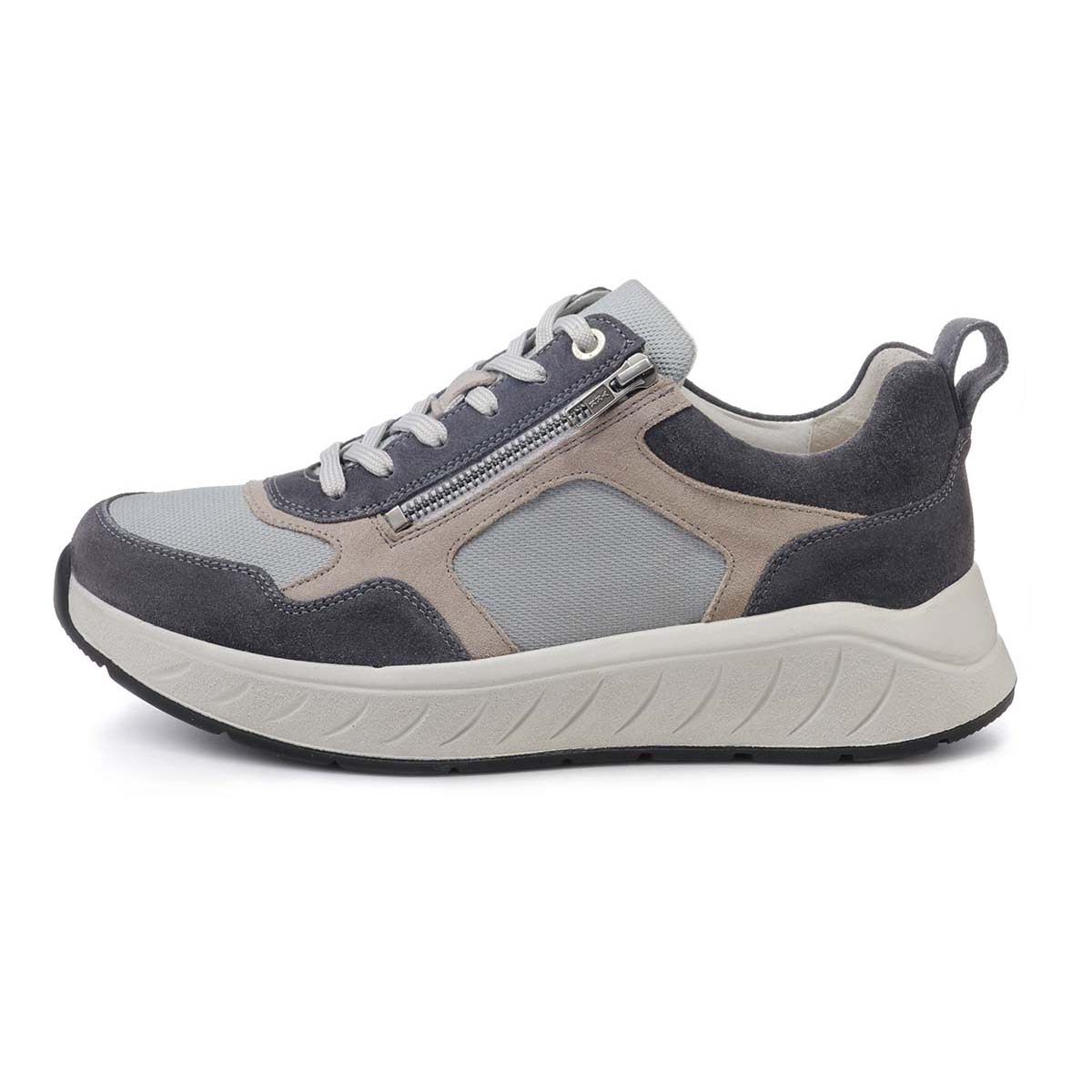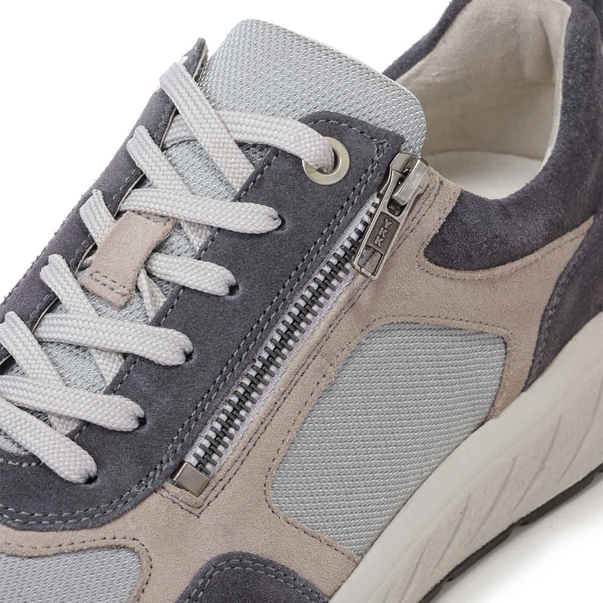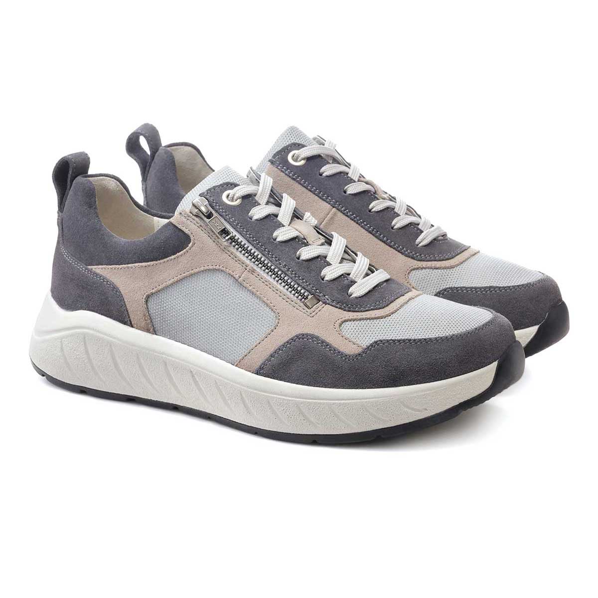 Стильные комбинированные кроссовки в широкой полноте выполнены из мягкой натуральной замши серого цвета. Верх дополнен вставками из стрейч-текстиля в области союзки и берец (не давит на деформированные участки стопы); мягкая подкладка из антибактериального дышащего материала Fashmo, который легко почистить влажной тканью.