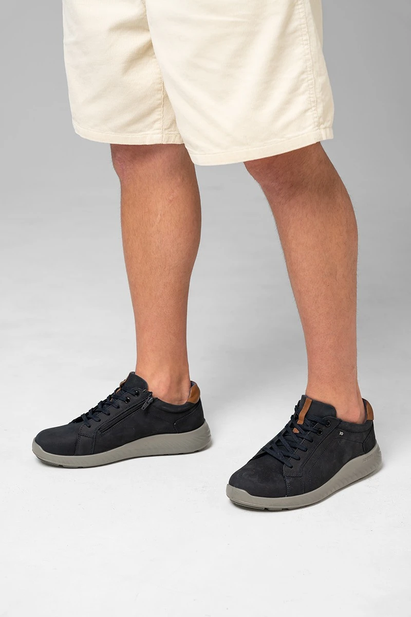 Мужские кроссовки в увеличенной полноте H подойдут на среднюю и умеренно широкую стопу. Модель выполнена из мягкого натурального нубука синего оттенка с акцентными деталями из коричневой кожи. Легкие и дышащие материалы верха и подкладки обеспечивают комфортный микроклимат и приятную воздухопроницаемость.