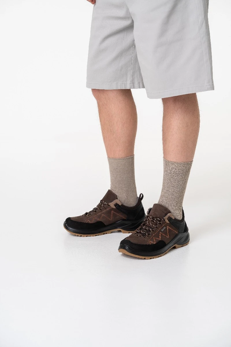 Треккинговые кроссовки для активного отдыха в широкой полноте с мембраной выполнены из мягкого, но прочного нубука темно-коричневого оттенка с практичными черными вставками в носочной и пяточной частях.
