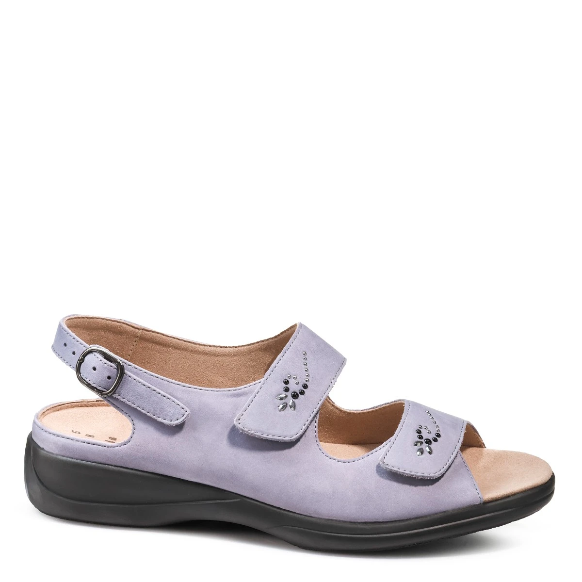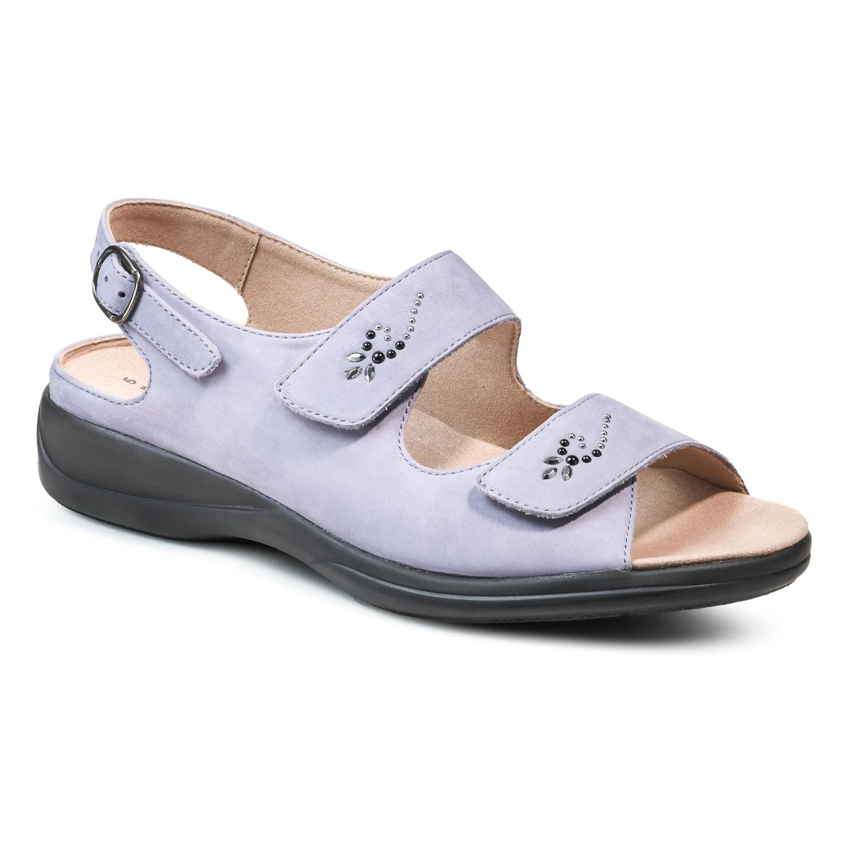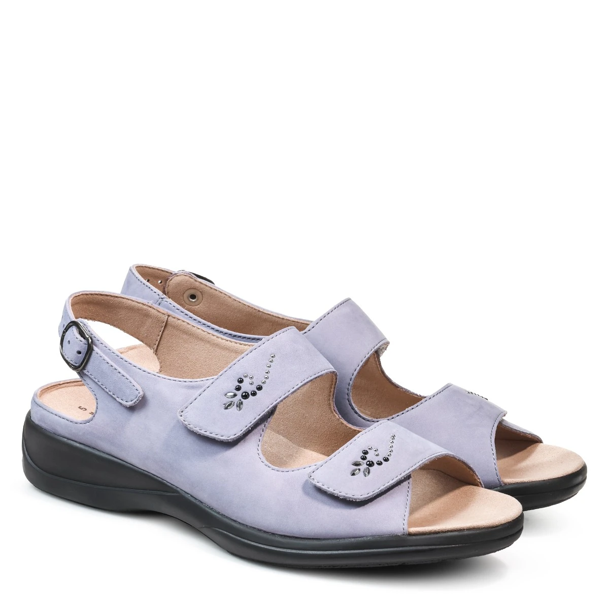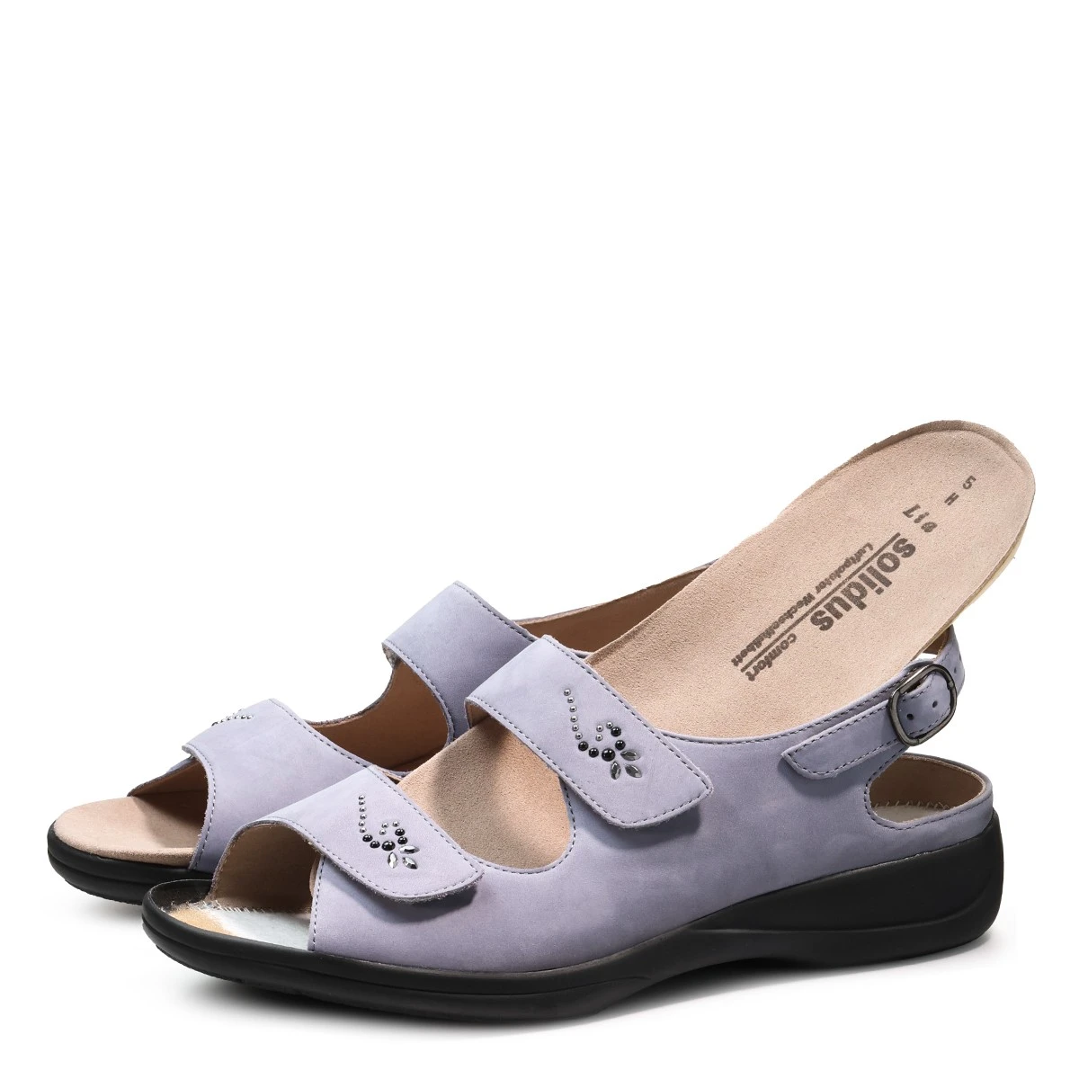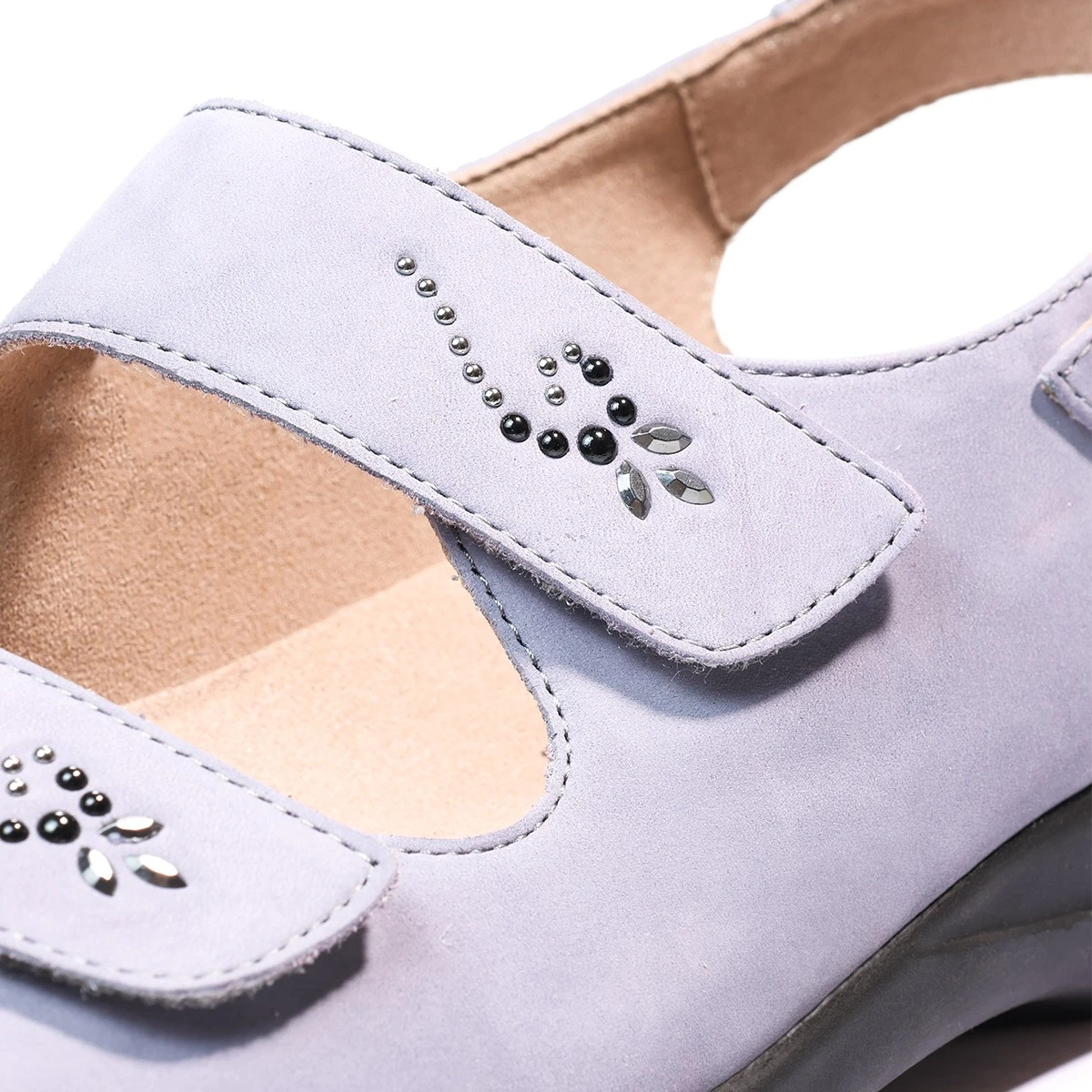 Женские босоножки из мягкого нубука в увеличенной полноте на колодке Lia - удобная обувь на лето. Лиловый оттенок вечернего неба при заходящем солнце создает особенное настроение. Аппликация из мерцающих страз придает модели изысканность и элегантность.