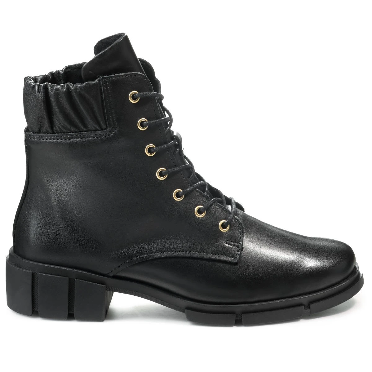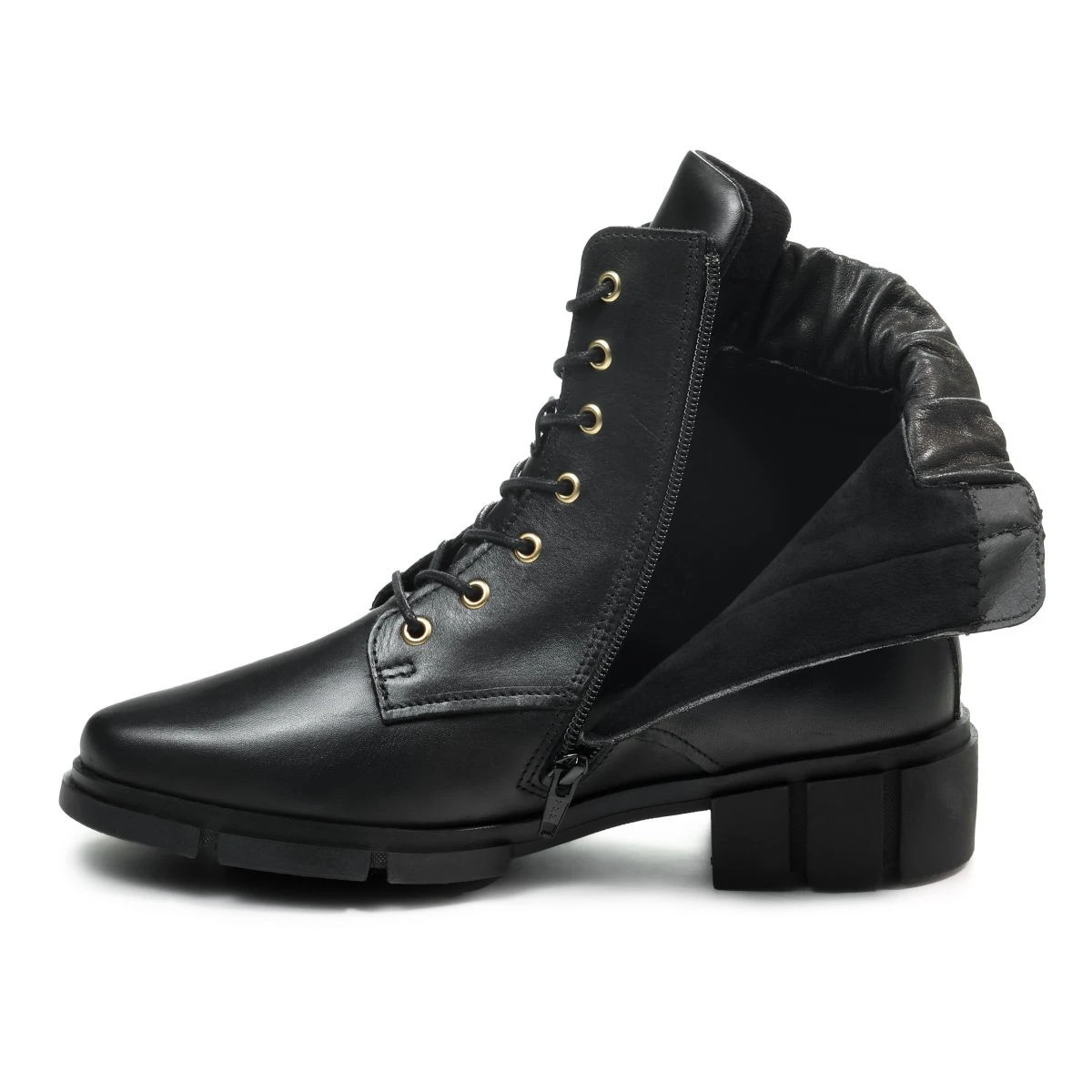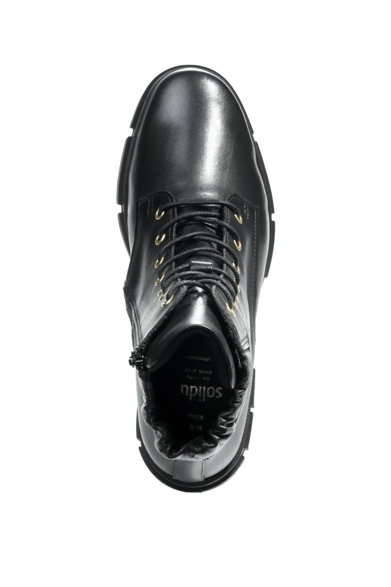 Модные черные женские ботинки на колодке Kibu Stiefel от Solidus в армейском или байкерском стиле с золотистой металлической фурнитурой и присборенным краем голенища наводят мысли об изысканном готическом стиле. Поскольку обувь застегивается на молнию с внутренней стороны, ее легко надевать и снимать.