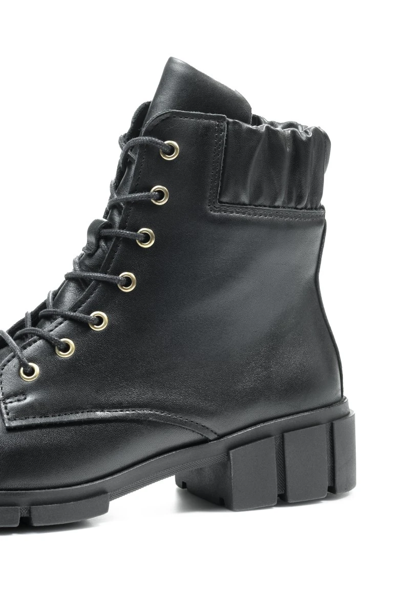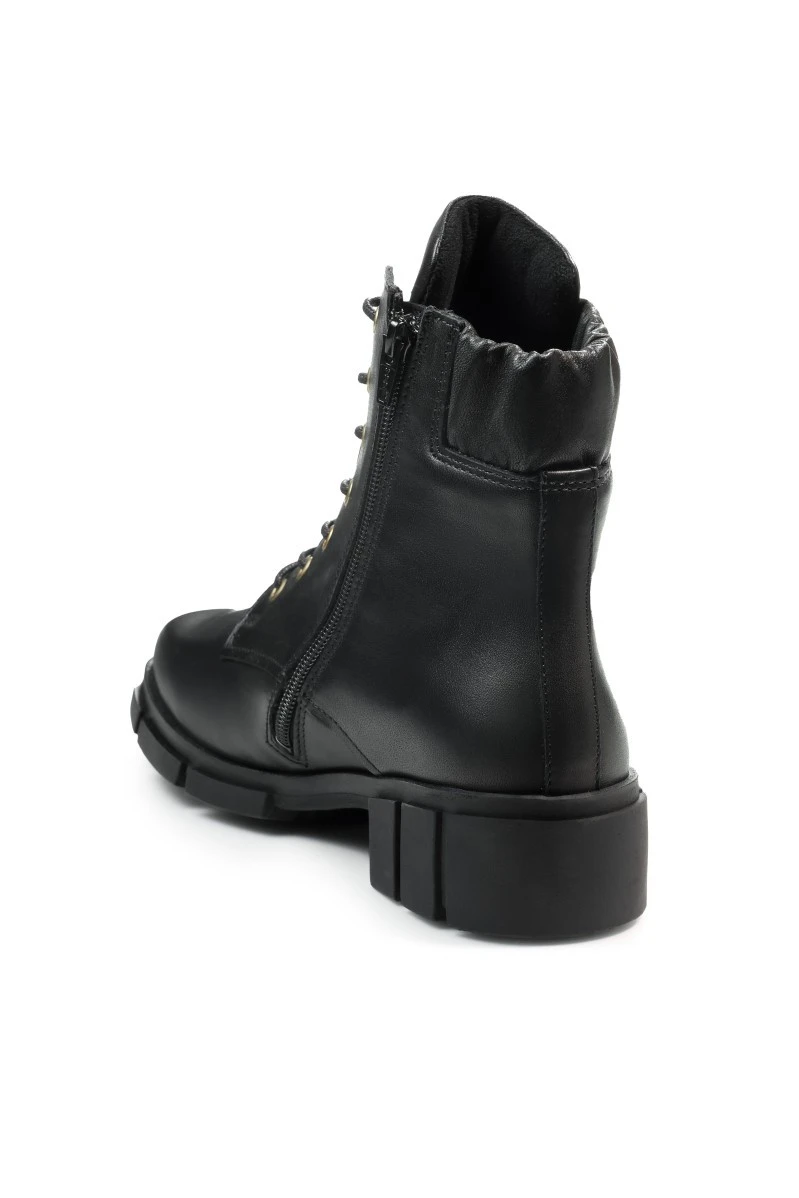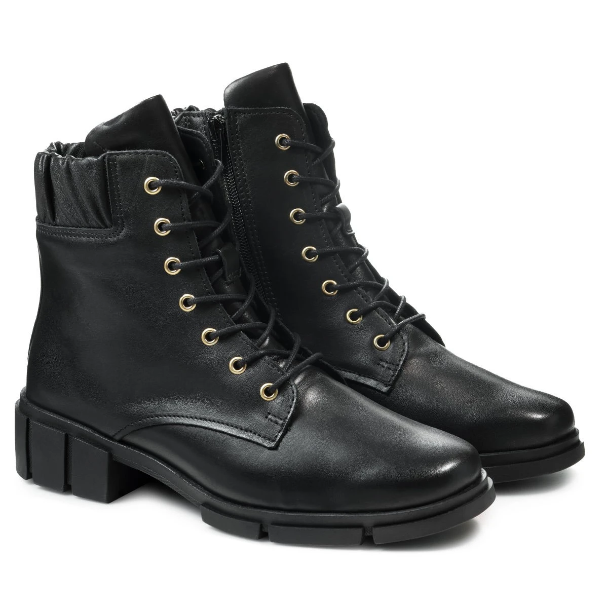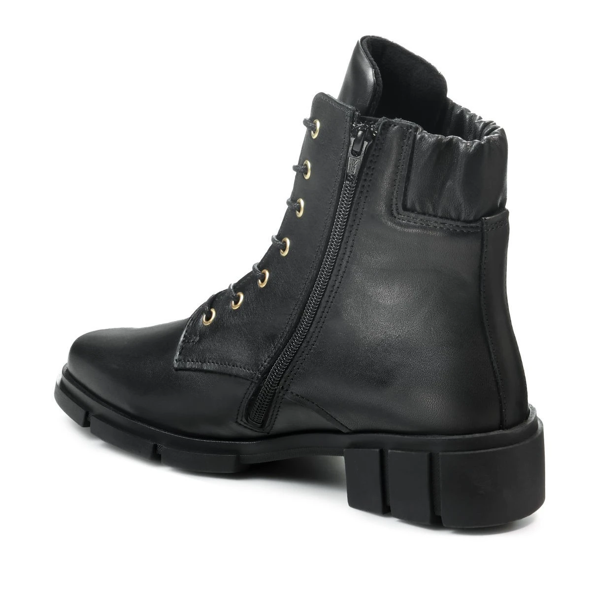 Модные черные женские ботинки на колодке Kibu Stiefel от Solidus в армейском или байкерском стиле с золотистой металлической фурнитурой и присборенным краем голенища наводят мысли об изысканном готическом стиле. Поскольку обувь застегивается на молнию с внутренней стороны, ее легко надевать и снимать.