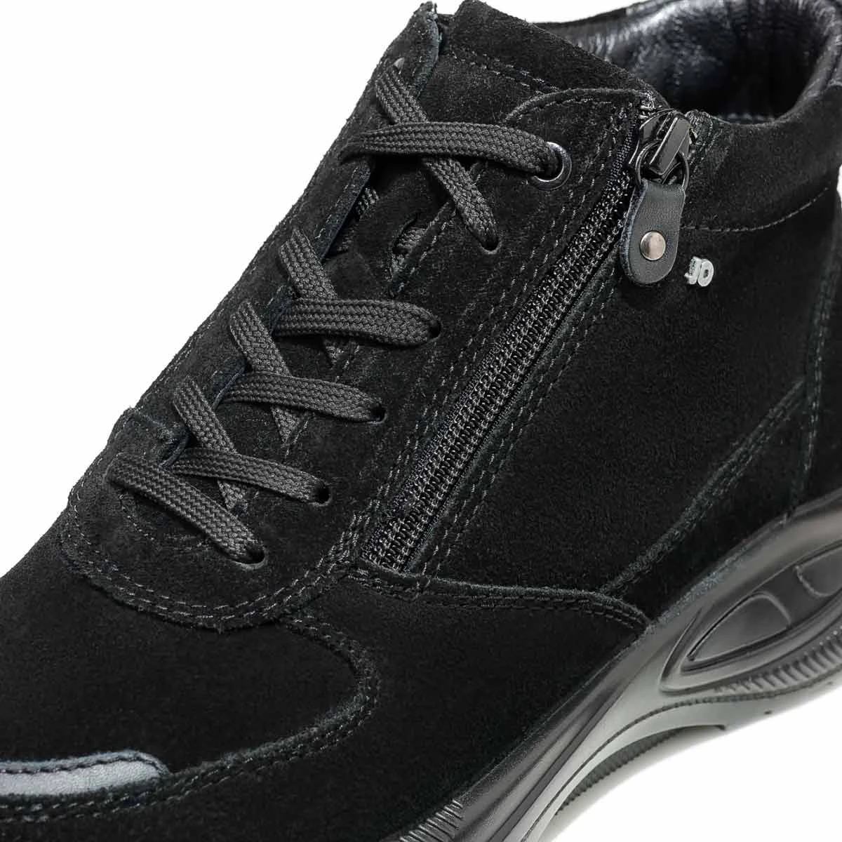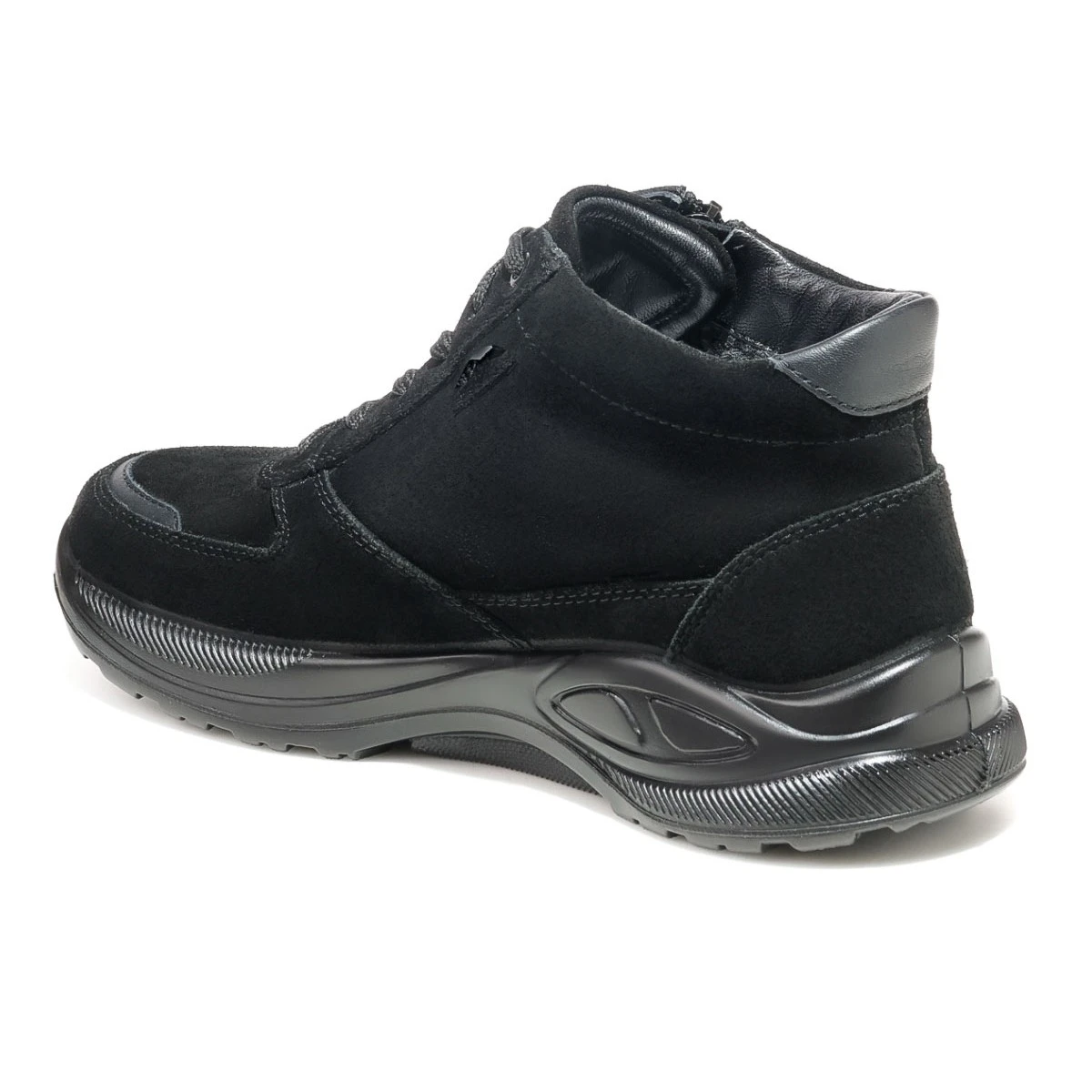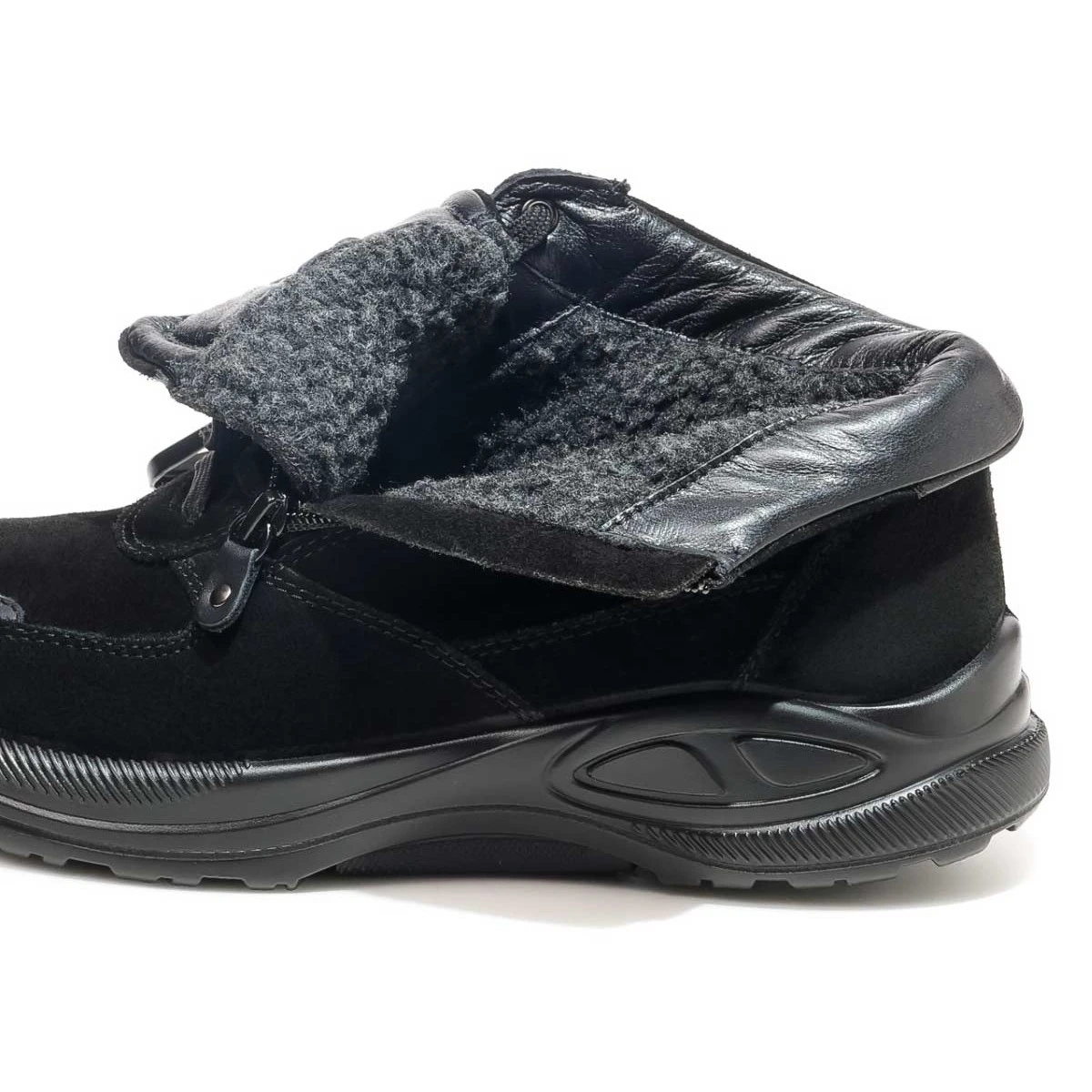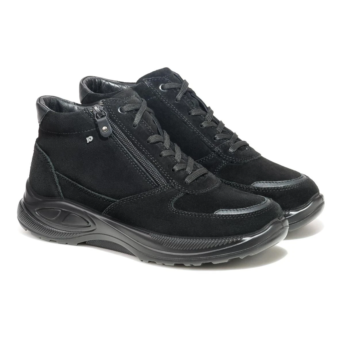 Черные ботинки в увеличенной полноте К подходят на широкую стопу и высокий подъем. Для максимального удобства модель оснащена двойной застежкой - шнуровкой и молнией, которые максимально облегчают надевание и регулировку по стопе. Молния быстро и надежно фиксирует обувь, шнуровка удобно регулируется по ноге.
