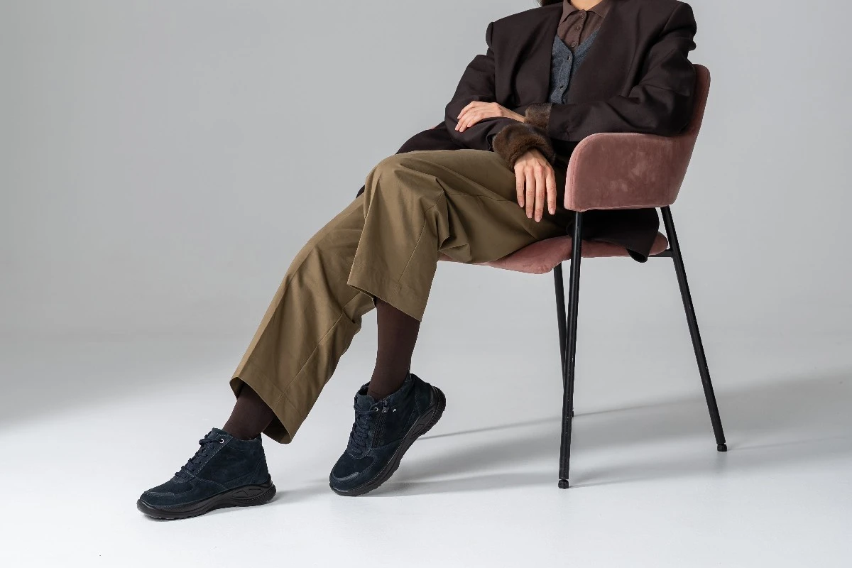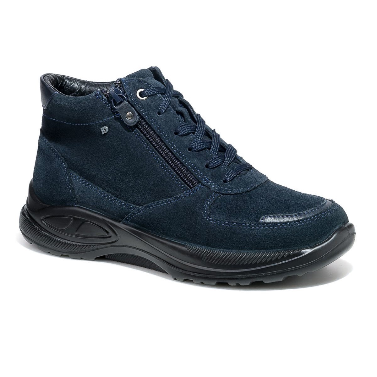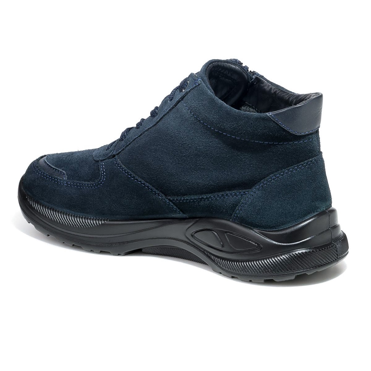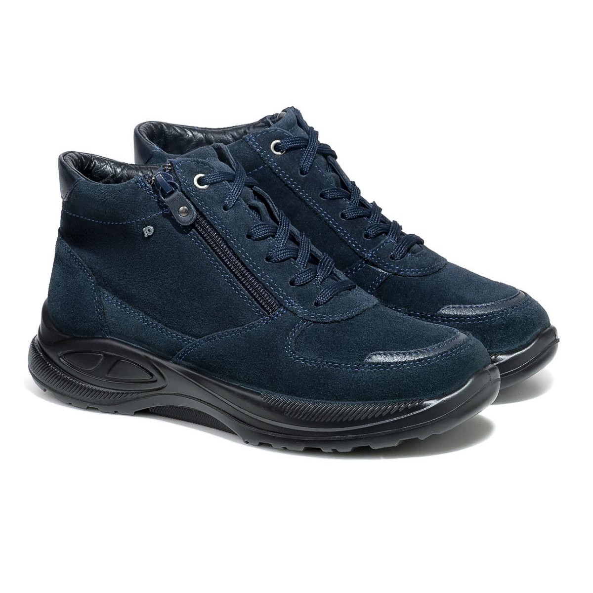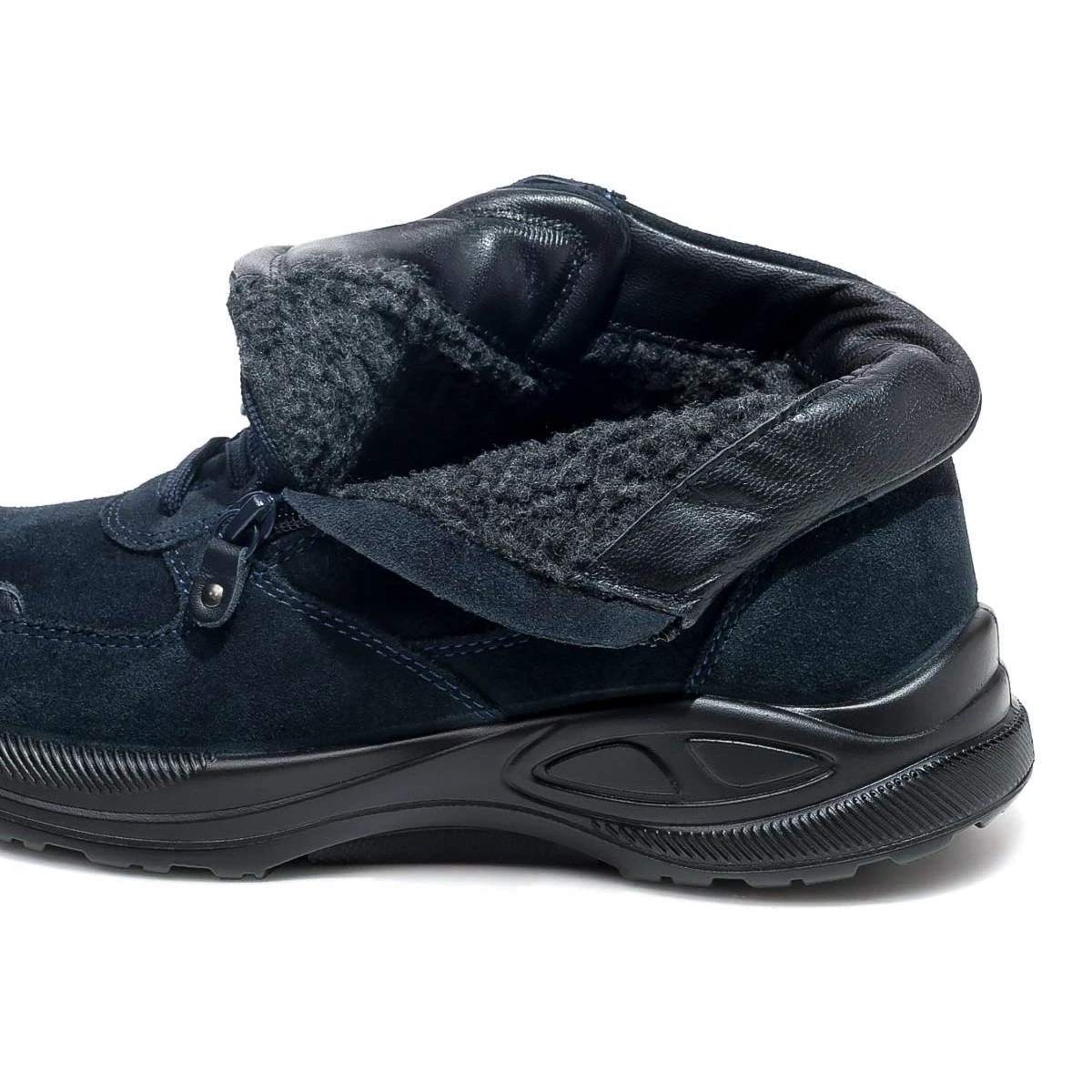Темно-синие ботинки в увеличенной полноте К подходят на широкую стопу и высокий подъем. Для максимального удобства модель оснащена двойной застежкой - шнуровкой и молнией, которые облегчают надевание и регулировку по стопе. Молния быстро и надежно фиксирует обувь, шнуровка удобно регулируется по ноге.