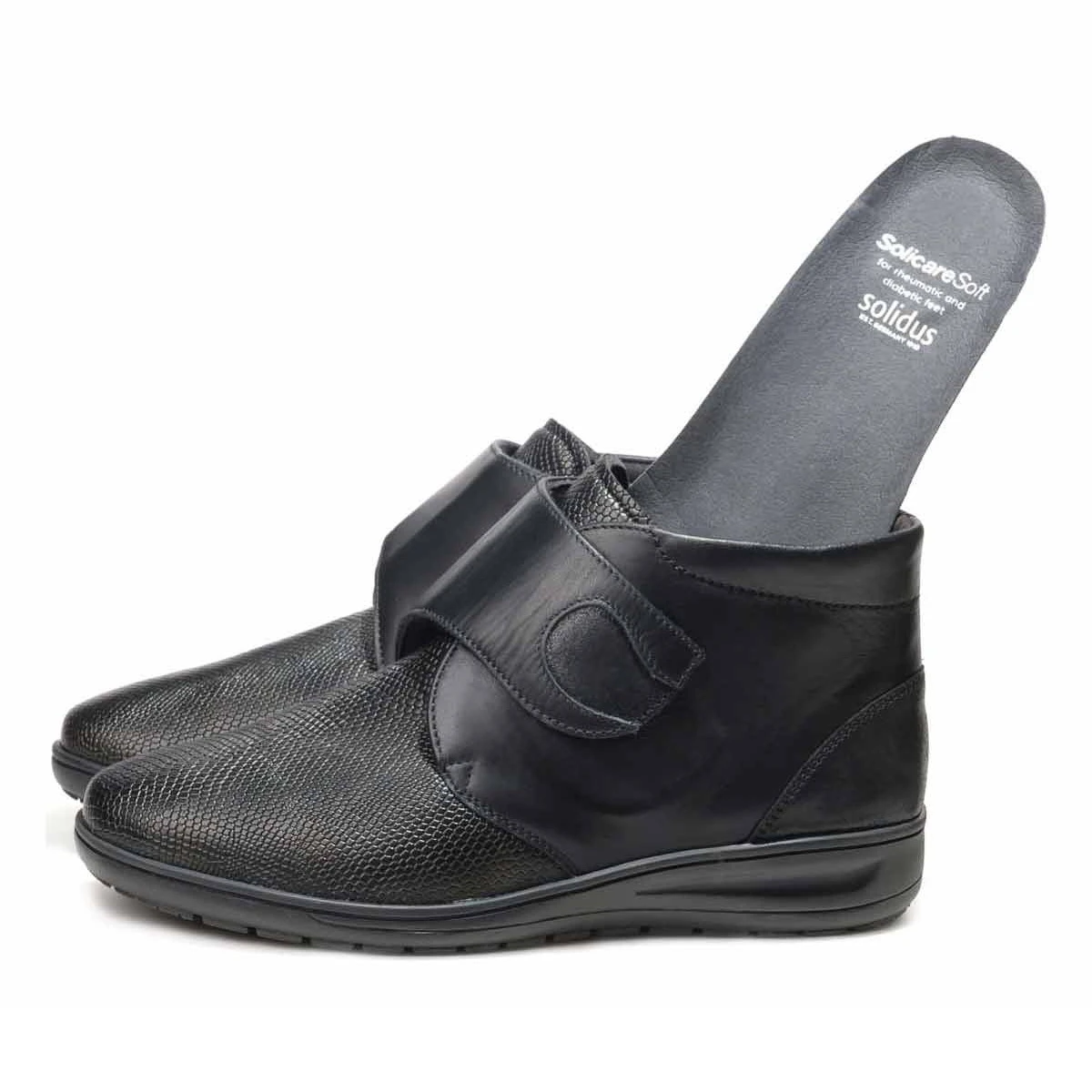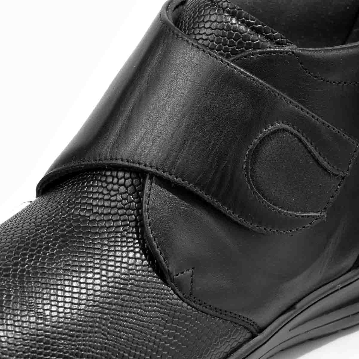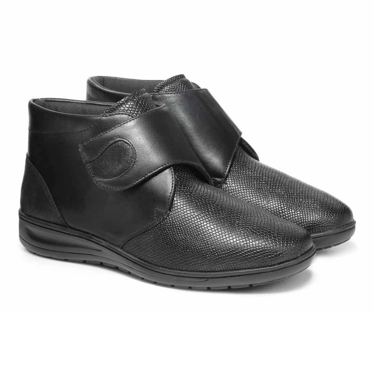 Черные ботинки подходят на широкую стопу и высокий подъем. Застежка-велкро позволяет быстро отрегулировать обувь по стопе. Верх модели выполнен из натуральной кожи с эластичной вставкой из материала Nappaflex в области союзки (снимает давление с деформированных участков стопы). Мягкая подкладка и покрытие стельки из антибактериального и дышащего материала Fashmo легко почистить влажной тканью. Мягкие внутренние швы не повреждают даже чувствительную кожу.