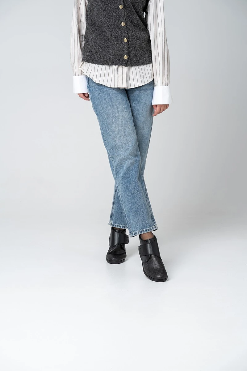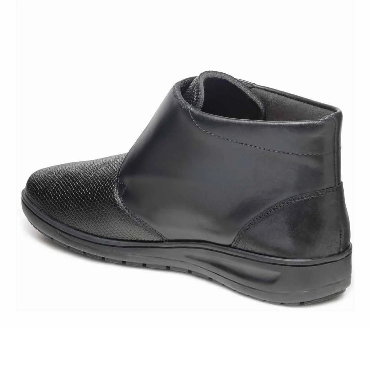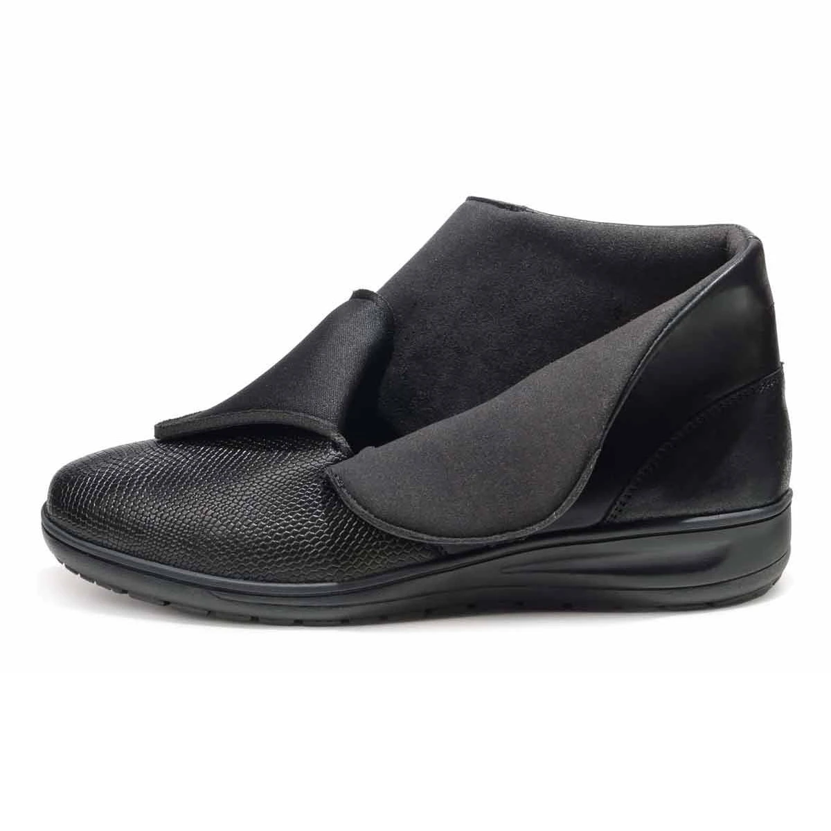 Черные ботинки подходят на широкую стопу и высокий подъем. Застежка-велкро позволяет быстро отрегулировать обувь по стопе. Верх модели выполнен из натуральной кожи с эластичной вставкой из материала Nappaflex в области союзки (снимает давление с деформированных участков стопы). Мягкая подкладка и покрытие стельки из антибактериального и дышащего материала Fashmo легко почистить влажной тканью. Мягкие внутренние швы не повреждают даже чувствительную кожу.