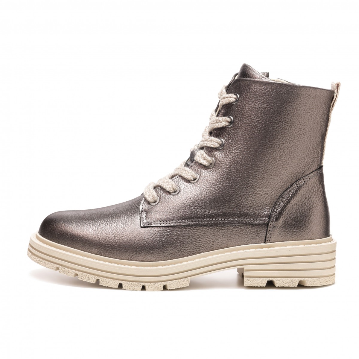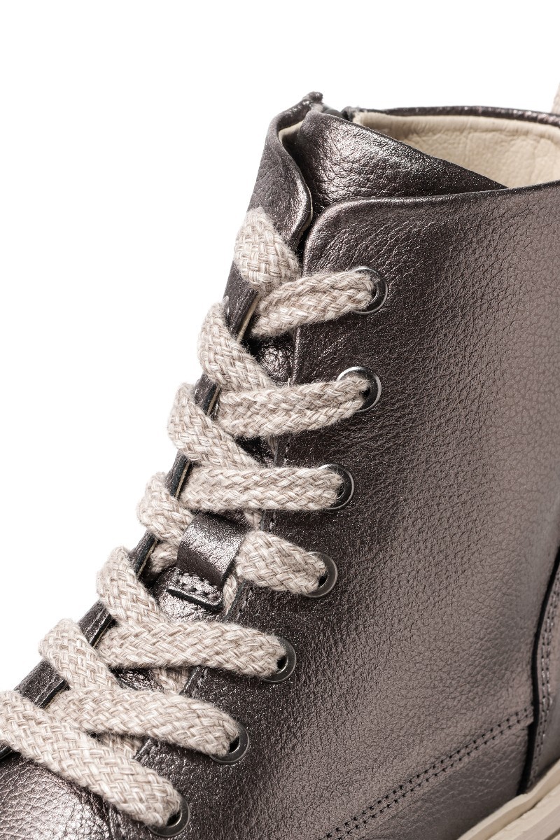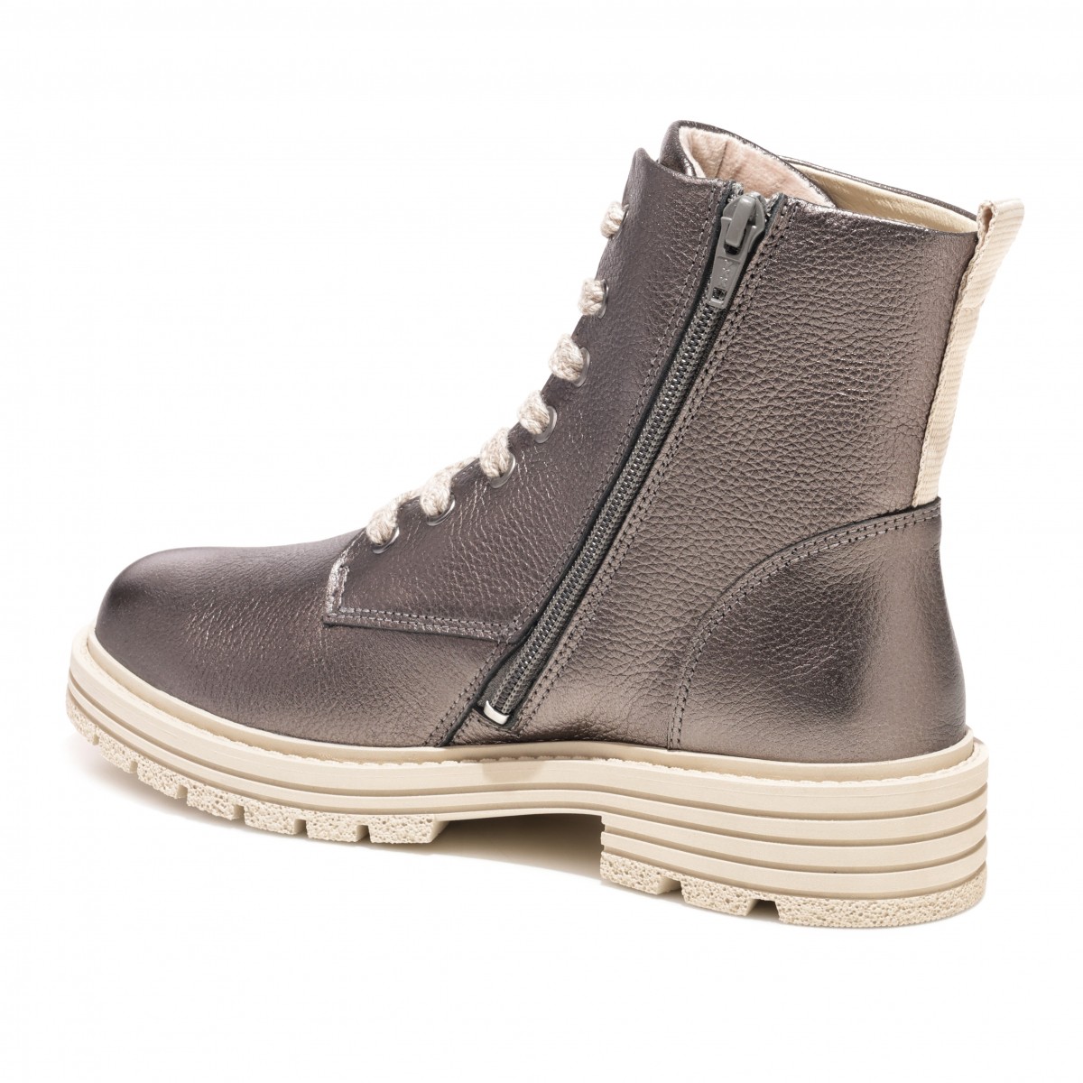 Минималистичные демисезонные ботинки выполнены из прочной натуральной зернистой кожи в бронзовом оттенке. Подкладка модели – мягкая дышащая микрофибра, сохраняющая комфортный микроклимат в обуви. Покрытие стельки – антибактериальный дышащий материала Fashmo, который легко почистить влажной тканью.