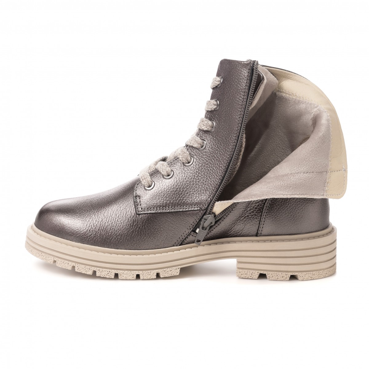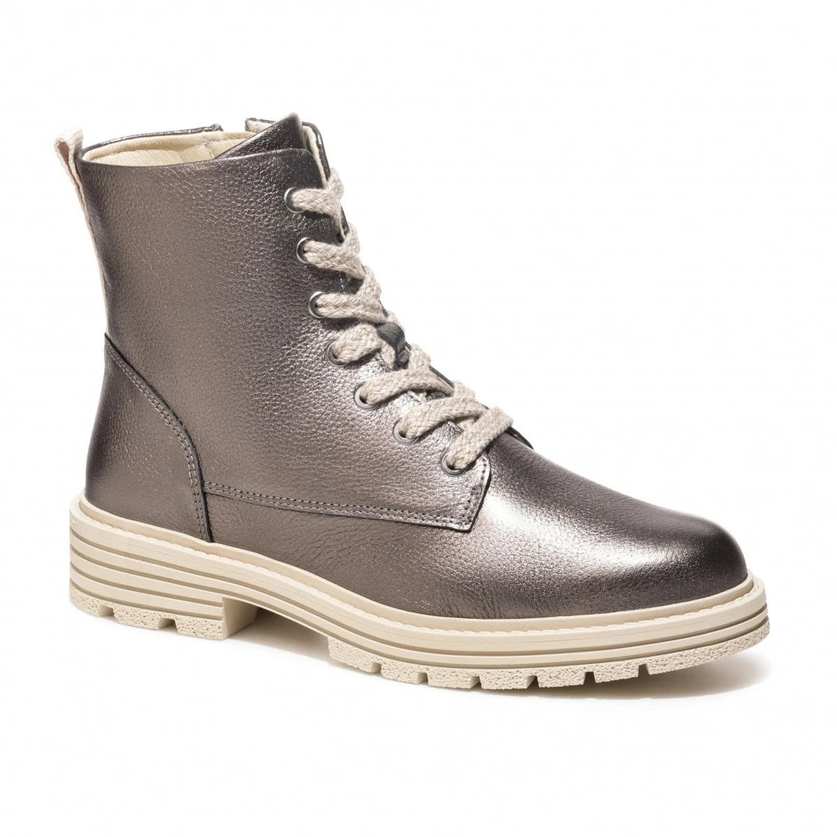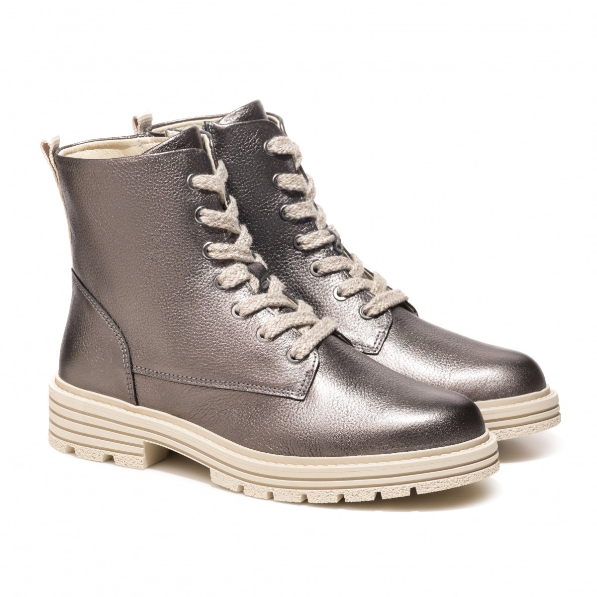 Минималистичные демисезонные ботинки выполнены из прочной натуральной зернистой кожи в бронзовом оттенке. Подкладка модели – мягкая дышащая микрофибра, сохраняющая комфортный микроклимат в обуви. Покрытие стельки – антибактериальный дышащий материала Fashmo, который легко почистить влажной тканью.