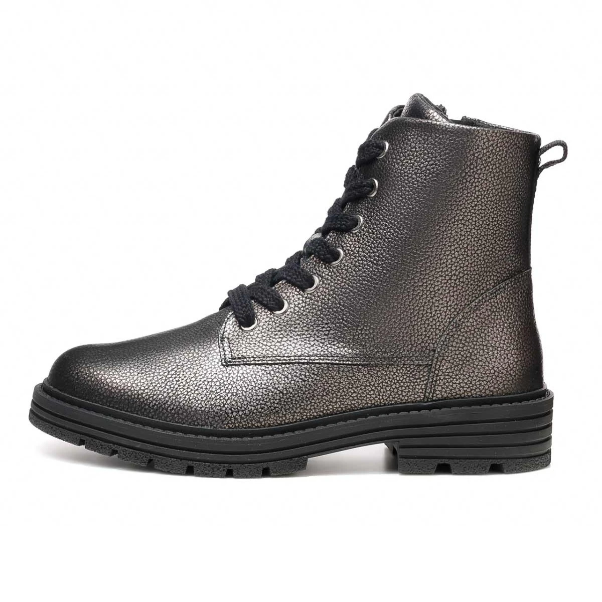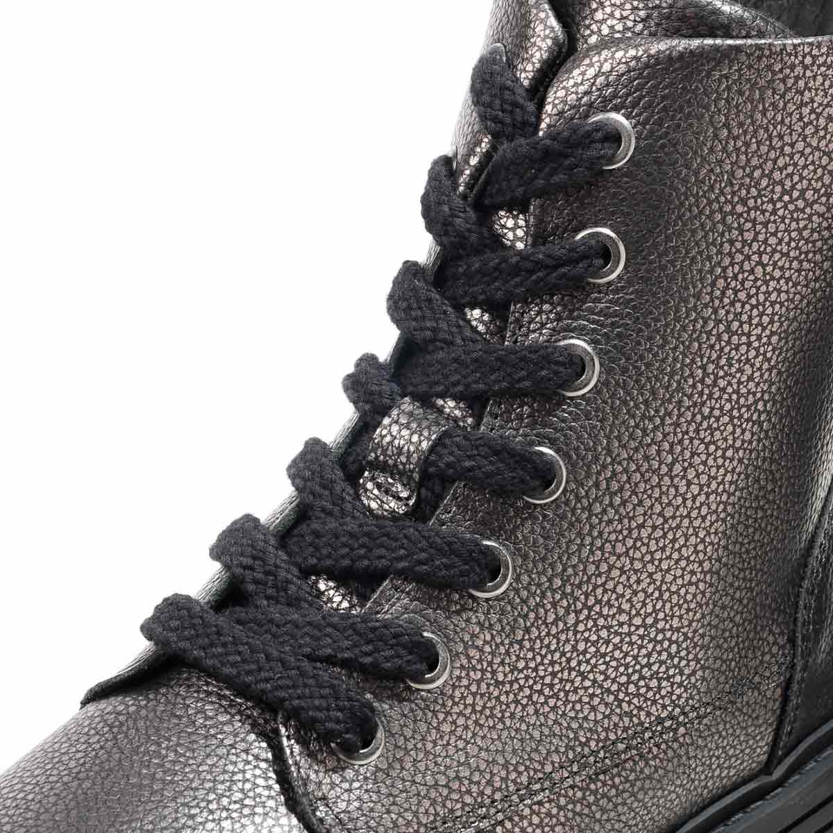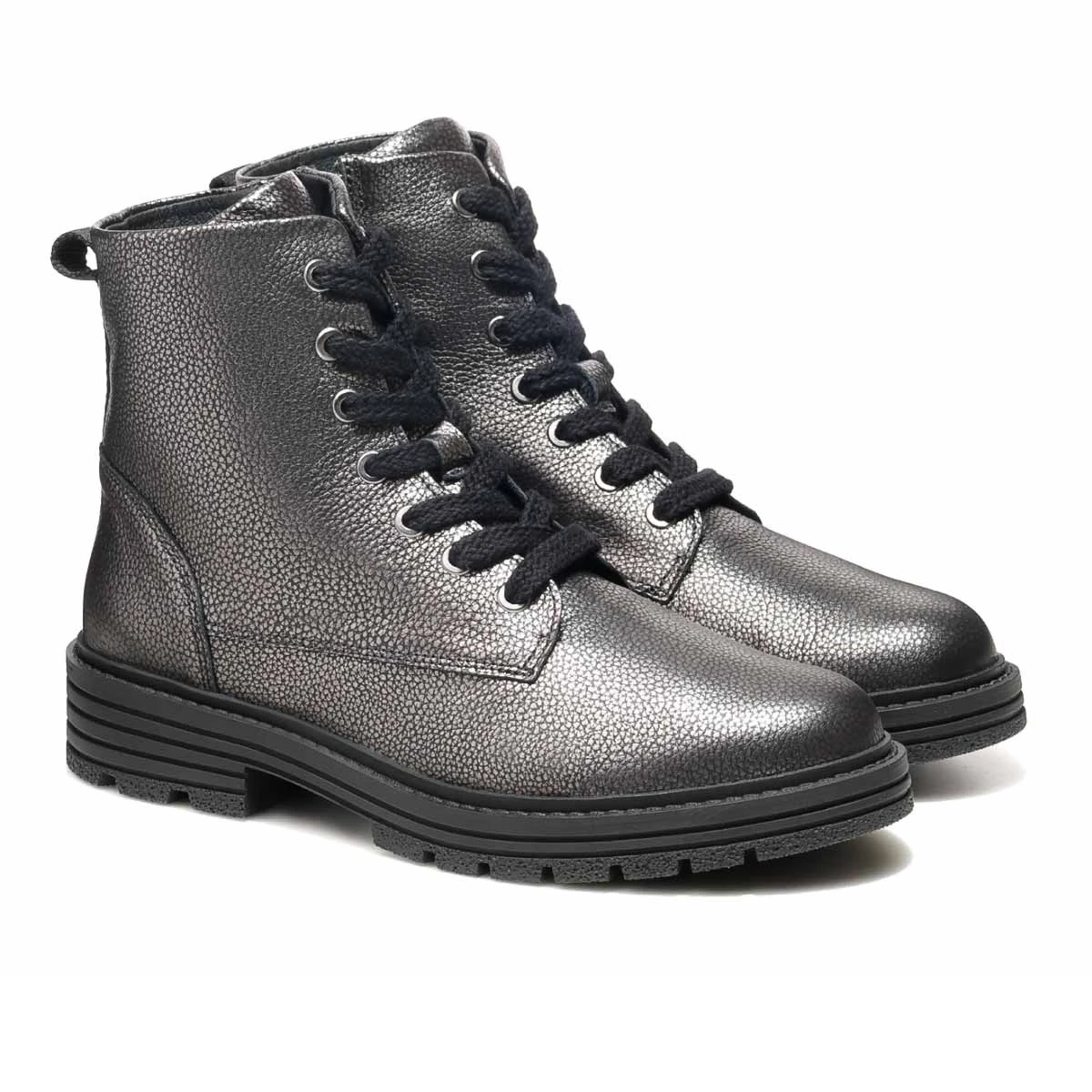 Минималистичные демисезонные ботинки выполнены из прочной натуральной зернистой кожи в оттенке серый металлик. Подкладка модели – мягкая дышащая микрофибра, сохраняющая комфортный микроклимат в обуви. Покрытие стельки – антибактериальный дышащий материала Fashmo, который легко почистить влажной тканью.