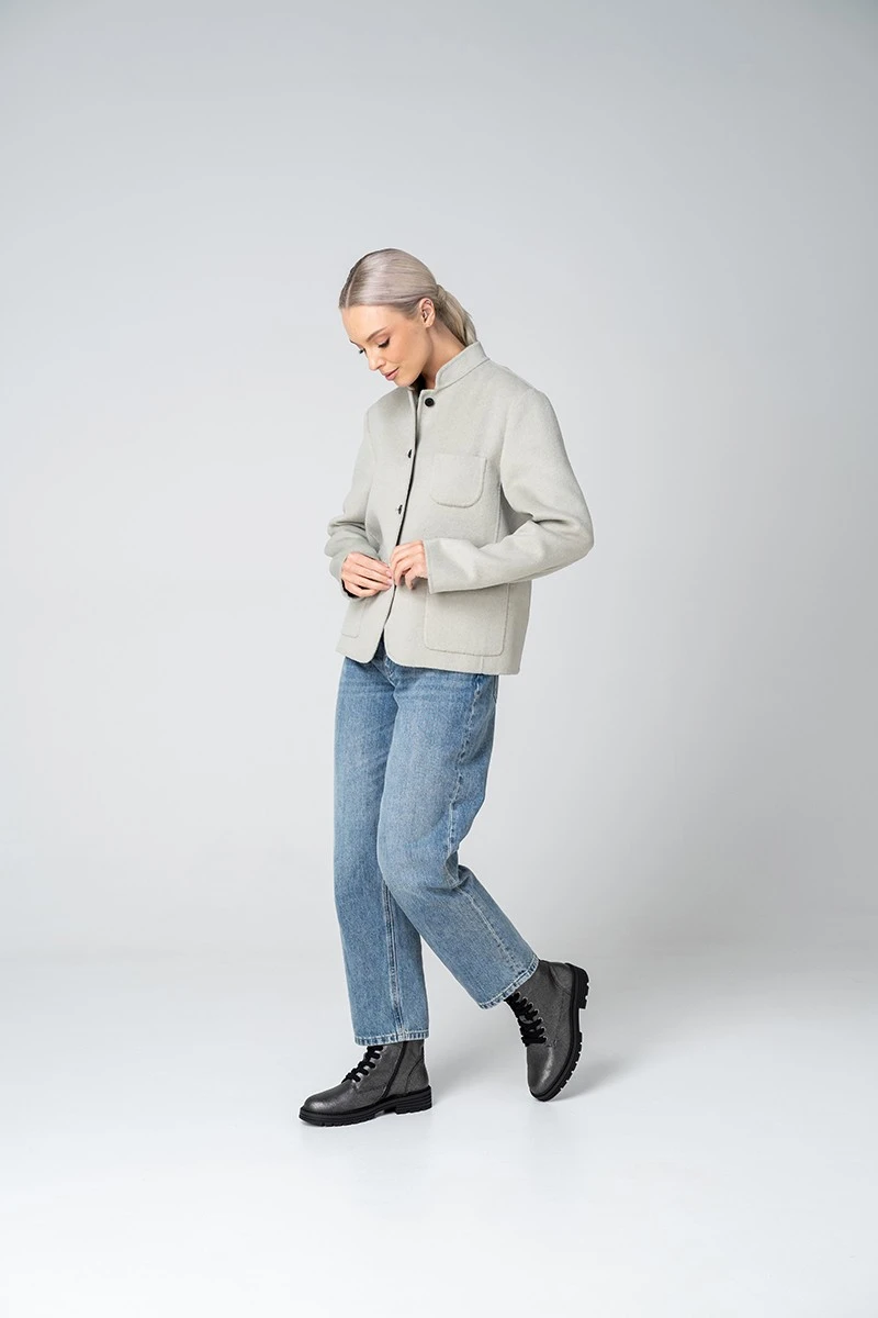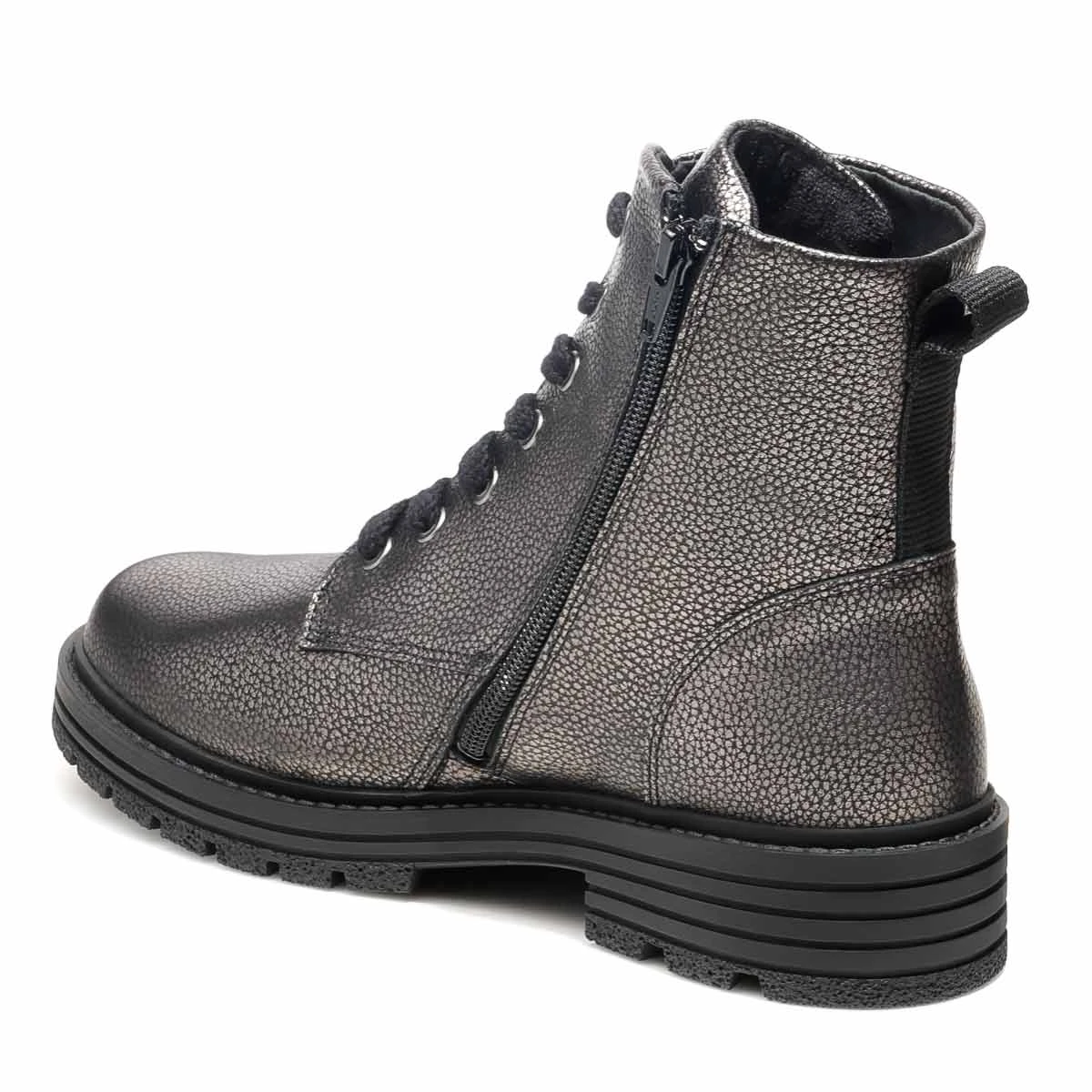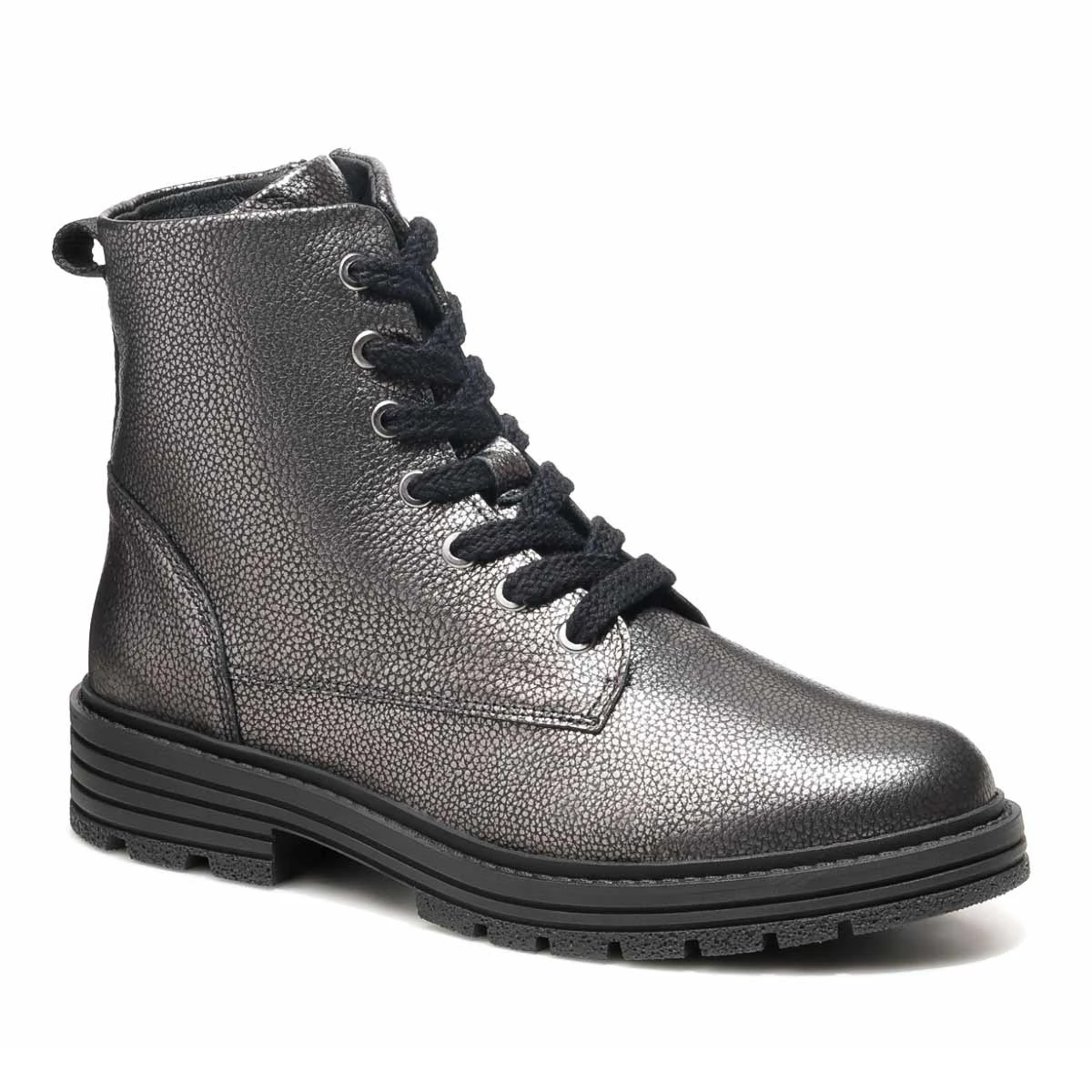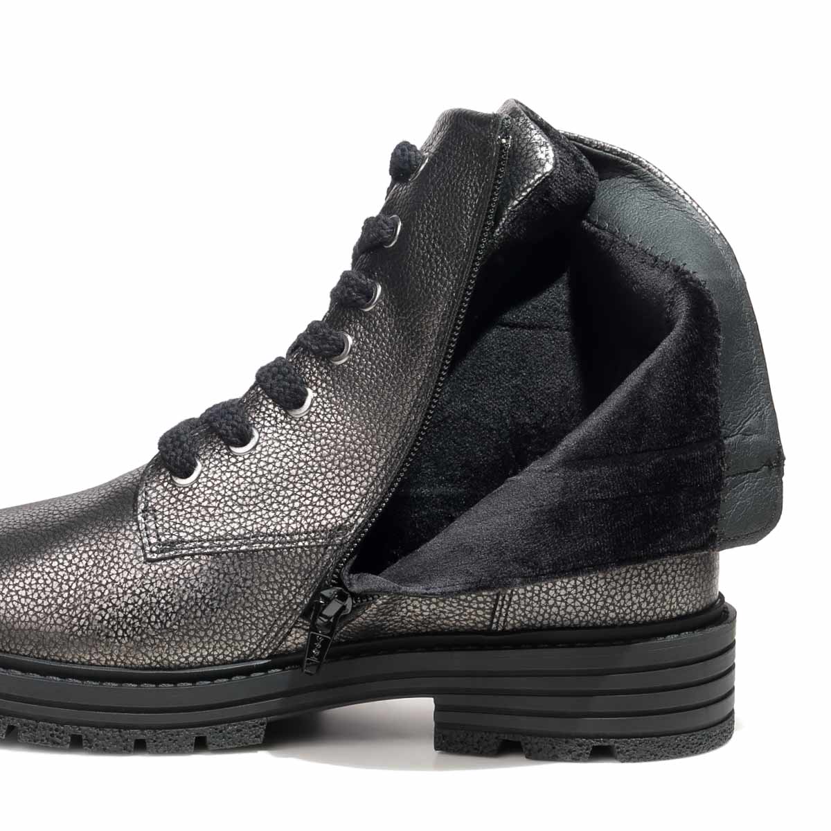 Минималистичные демисезонные ботинки выполнены из прочной натуральной зернистой кожи в оттенке серый металлик. Подкладка модели – мягкая дышащая микрофибра, сохраняющая комфортный микроклимат в обуви. Покрытие стельки – антибактериальный дышащий материала Fashmo, который легко почистить влажной тканью.