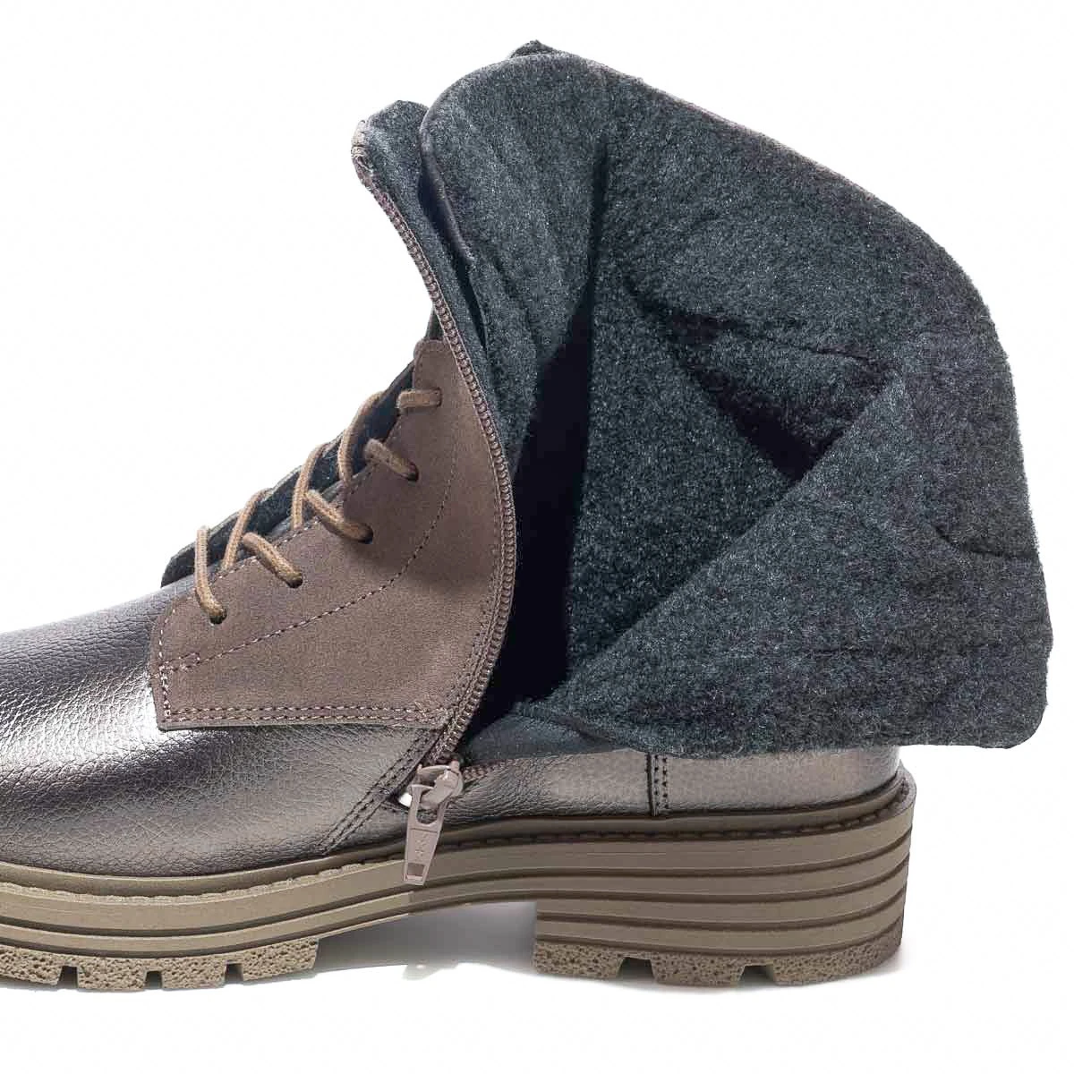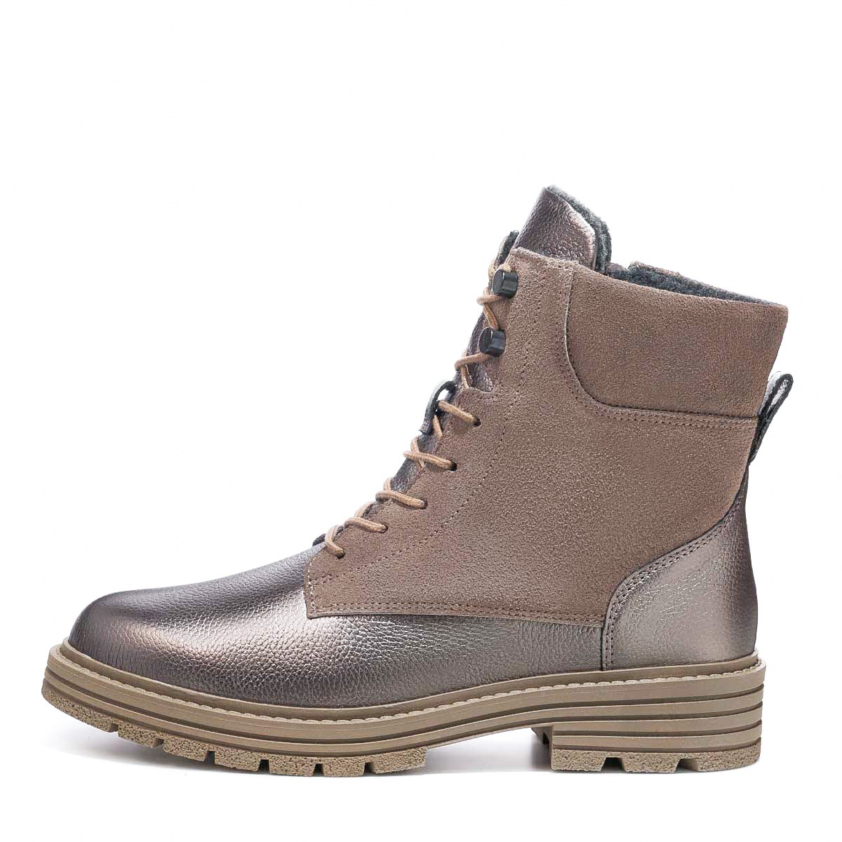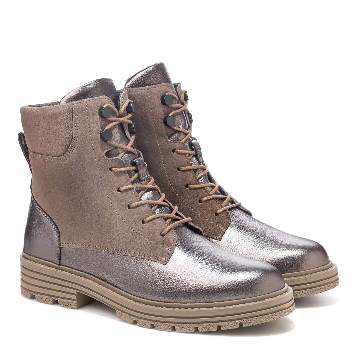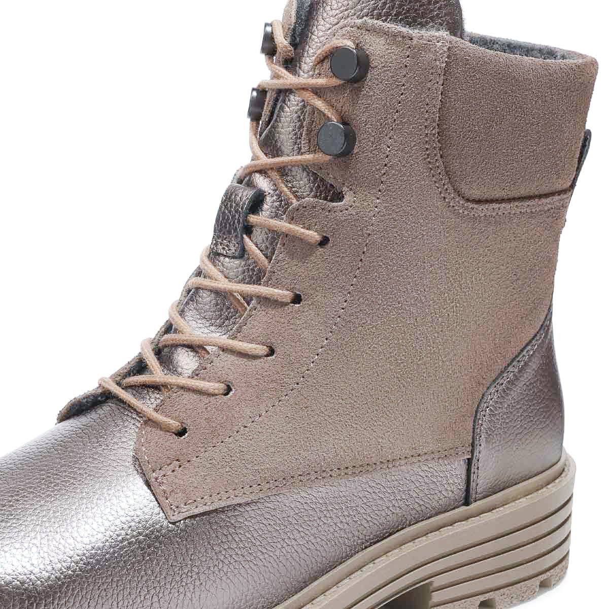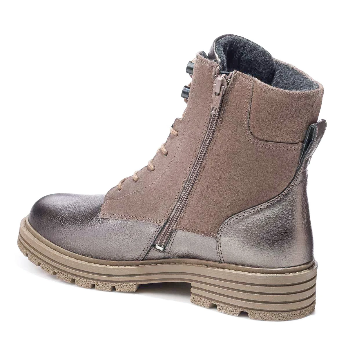 Стильные зимние ботинки выполнены в комбинации металлизированной кожи и мягкой замши.