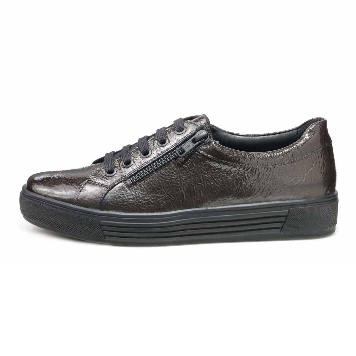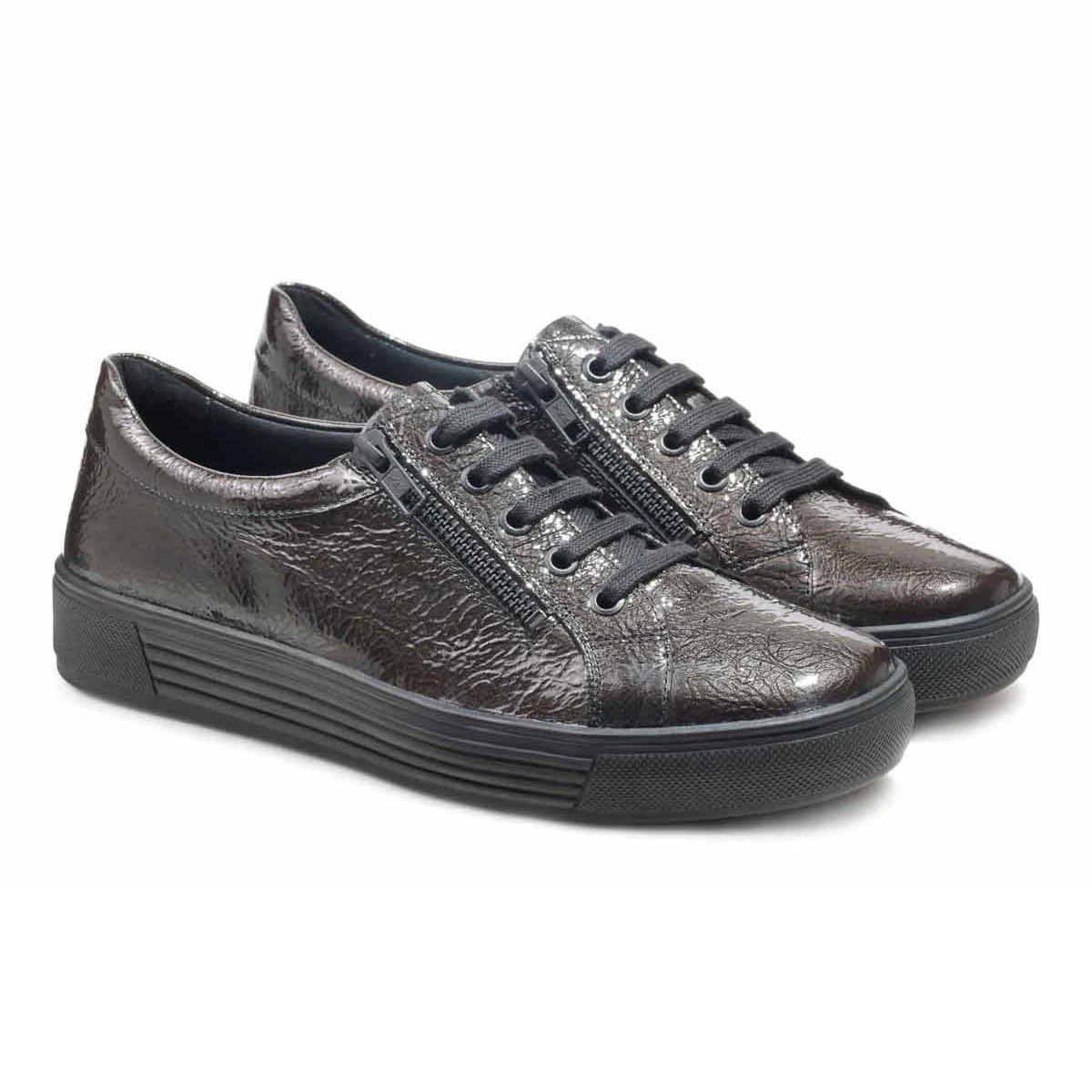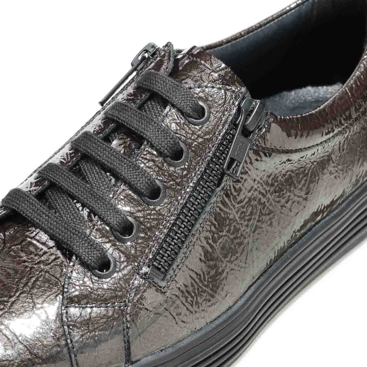 Кеды выполнены из натуральной лаковой кожи темно-серого оттенка, подходят на широкую стопу и высокий подъем. Подошва, снаружи кажущаяся плоской, внутри конструкции имеет скрытый каблук высотой 1,5 см, который обеспечивает необходимый физиологический перепад между положением пальцев и пятки для правильного распределения нагрузки по стопе.