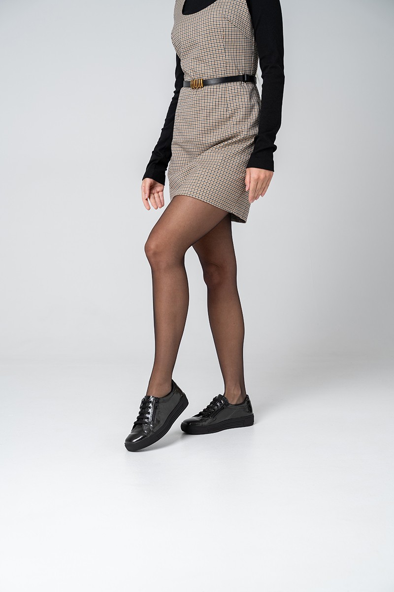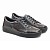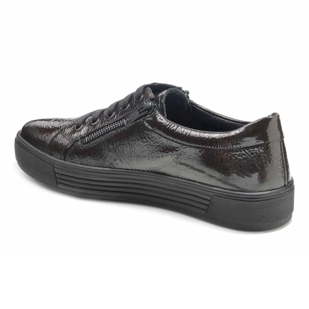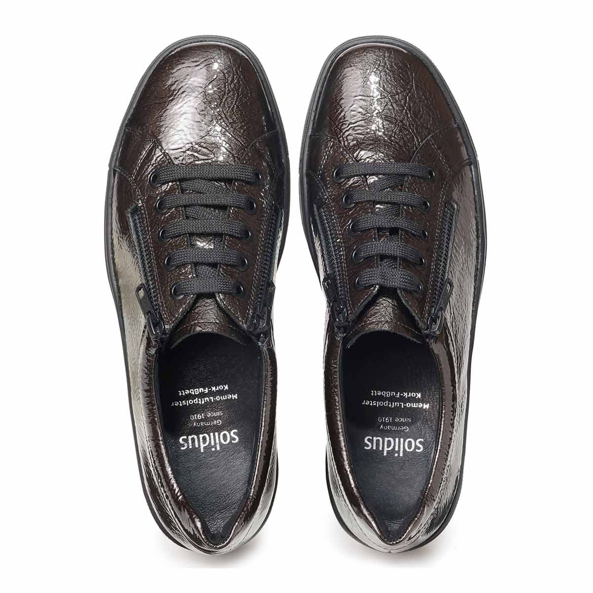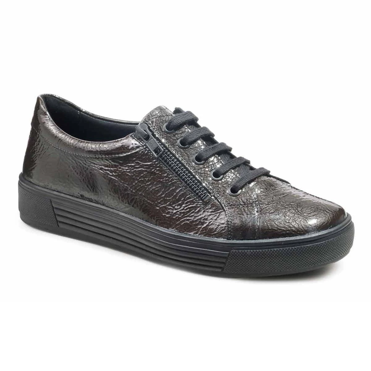 Кеды выполнены из натуральной лаковой кожи темно-серого оттенка, подходят на широкую стопу и высокий подъем. Подошва, снаружи кажущаяся плоской, внутри конструкции имеет скрытый каблук высотой 1,5 см, который обеспечивает необходимый физиологический перепад между положением пальцев и пятки для правильного распределения нагрузки по стопе.