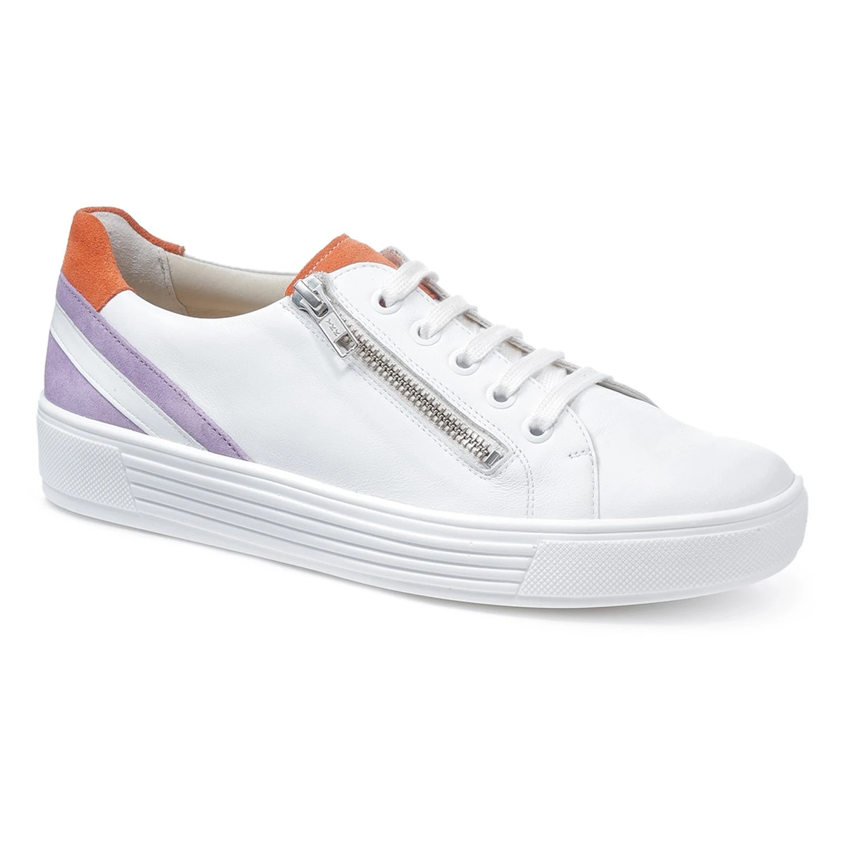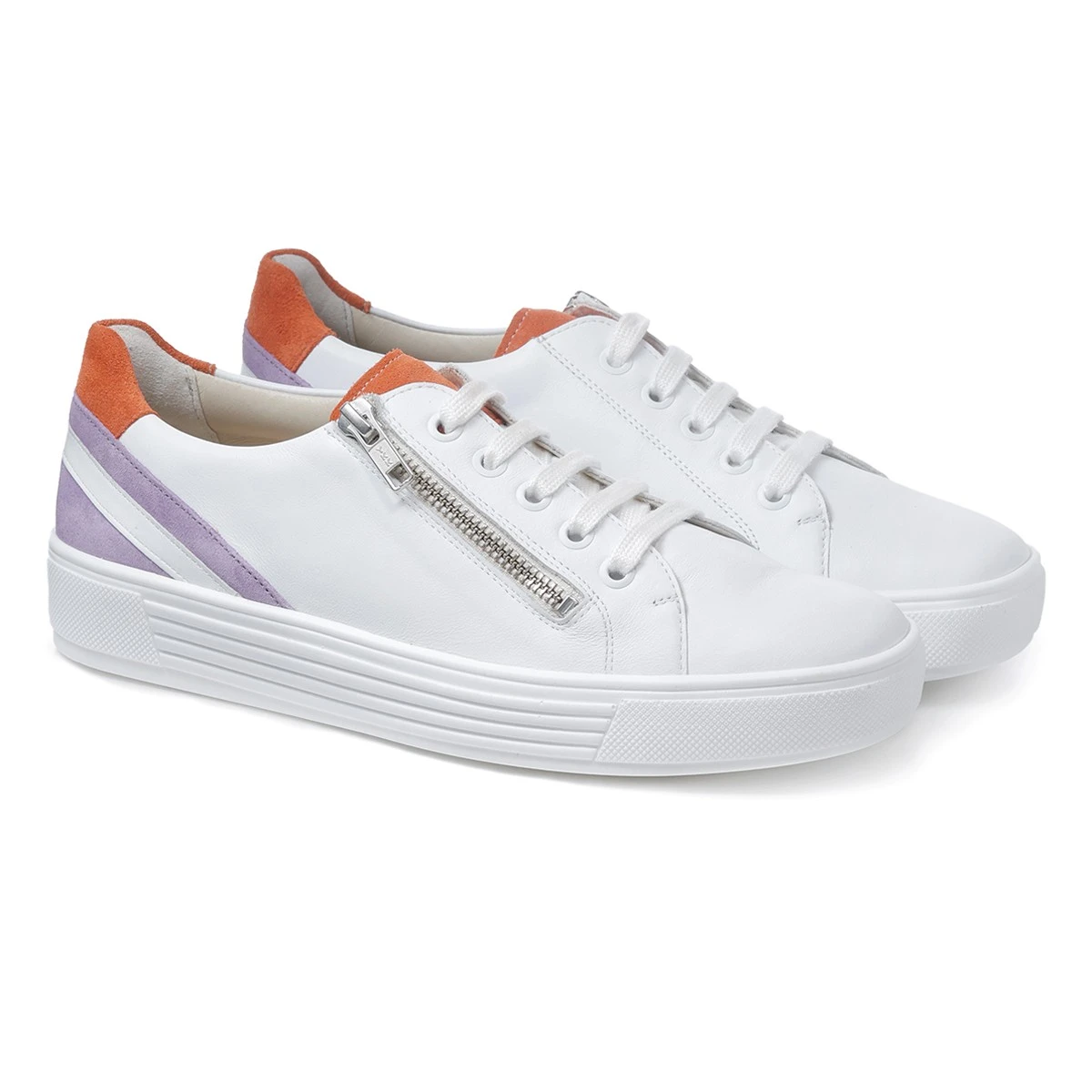 Удобные, мягкие кеды имеют увеличенную полноту Н, подходят на широкую стопу и высокий подъем. Шнуровка позволяет отрегулировать модель по индивидуальным параметрам, молния надежно зафиксирует обувь на ноге. Плоская с виду подошва имеет скрытый каблук высотой 1,5 см, который обеспечивает необходимый физиологический перепад между положением пальцев и пятки, а съемная стелька из пробкового дерева со вставками - амортизаторами поддерживает своды стопы. Гибкая, легкая, износоустойчивая подошва с воздушными подушками обладает исключительной амортизацией.