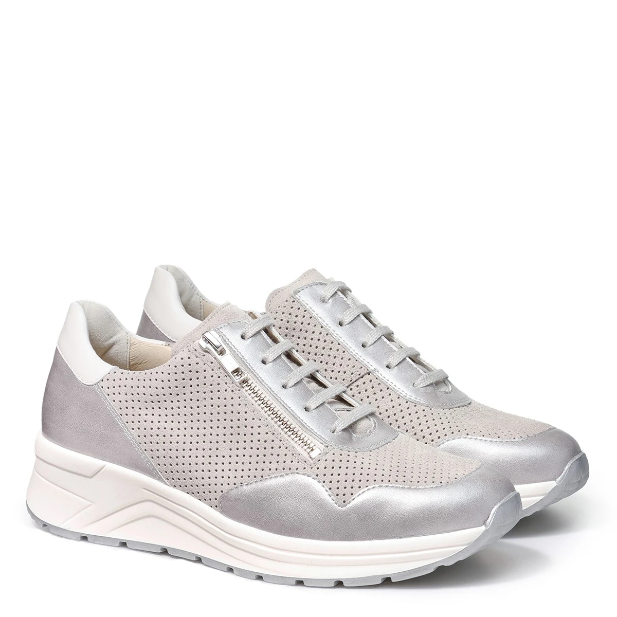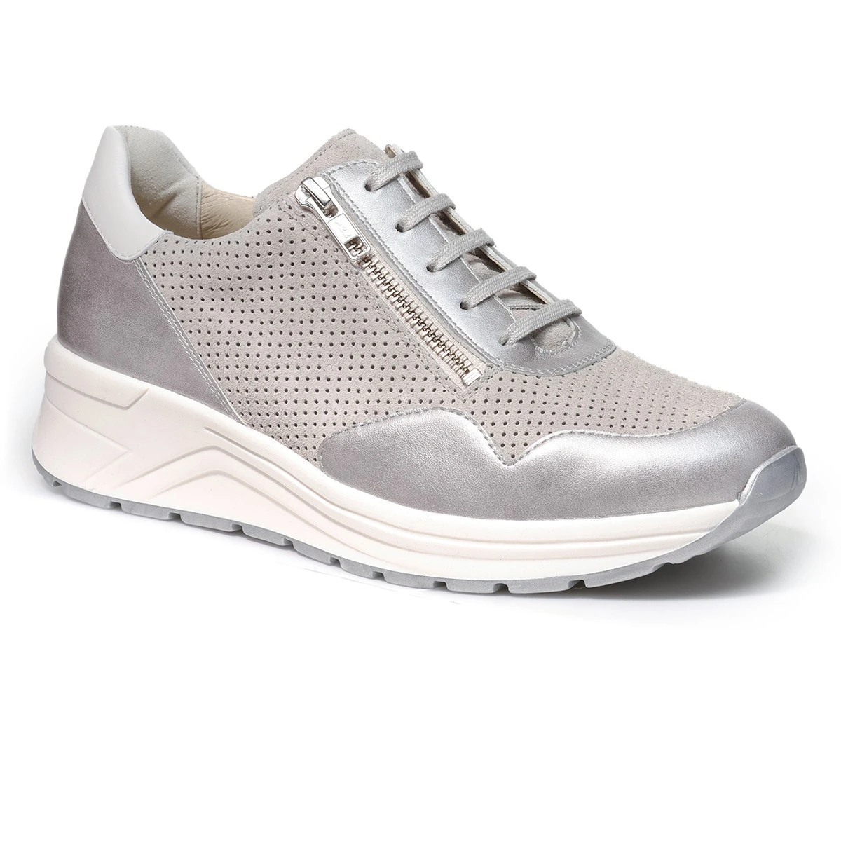 Изящные и устойчивые кроссовки на высокой платформе имеют широкую полноту. Удобные ботинки в стиле спорт-шик в комбинации различных фактур кожи (замшевая, металлизированная, гладкая) можно регулировать по подъему. Легкое серебристое мерцание кроссовок придает даже самому лаконичному образу настроение праздника.