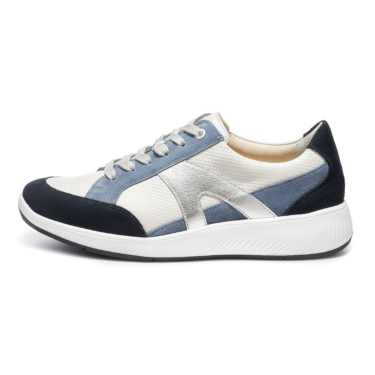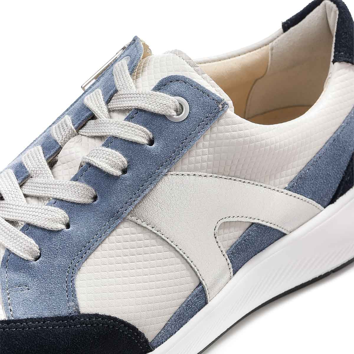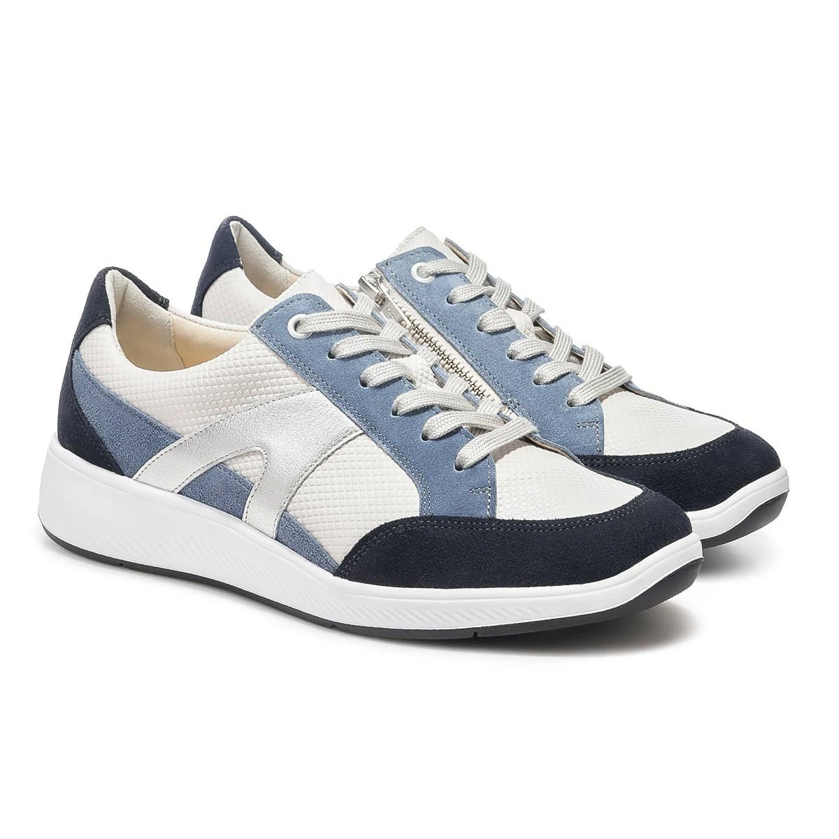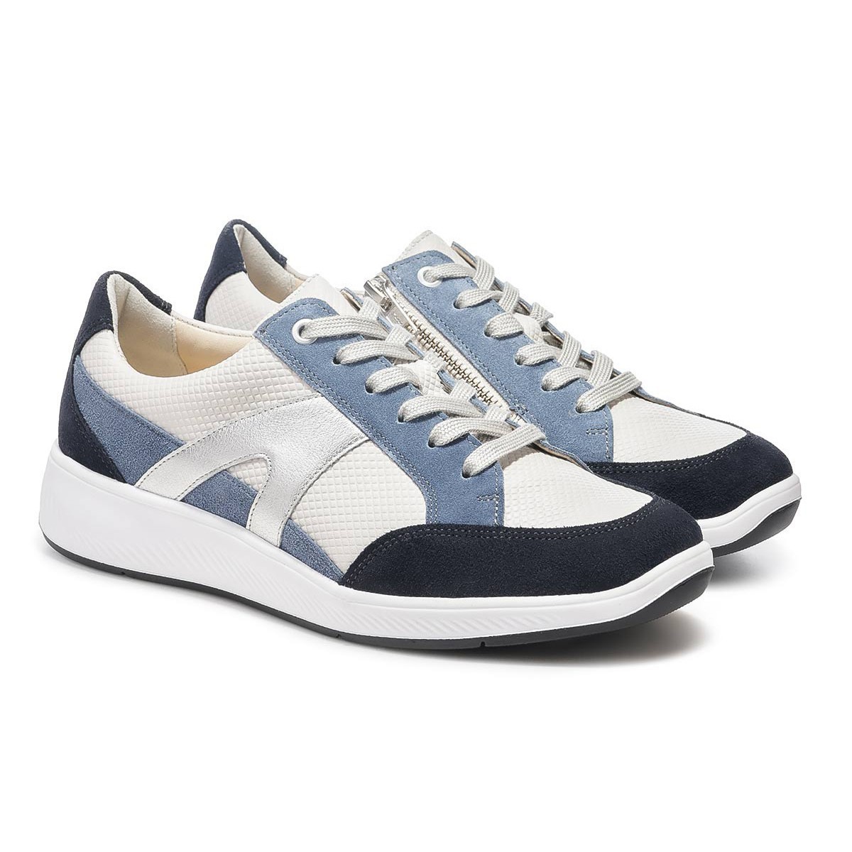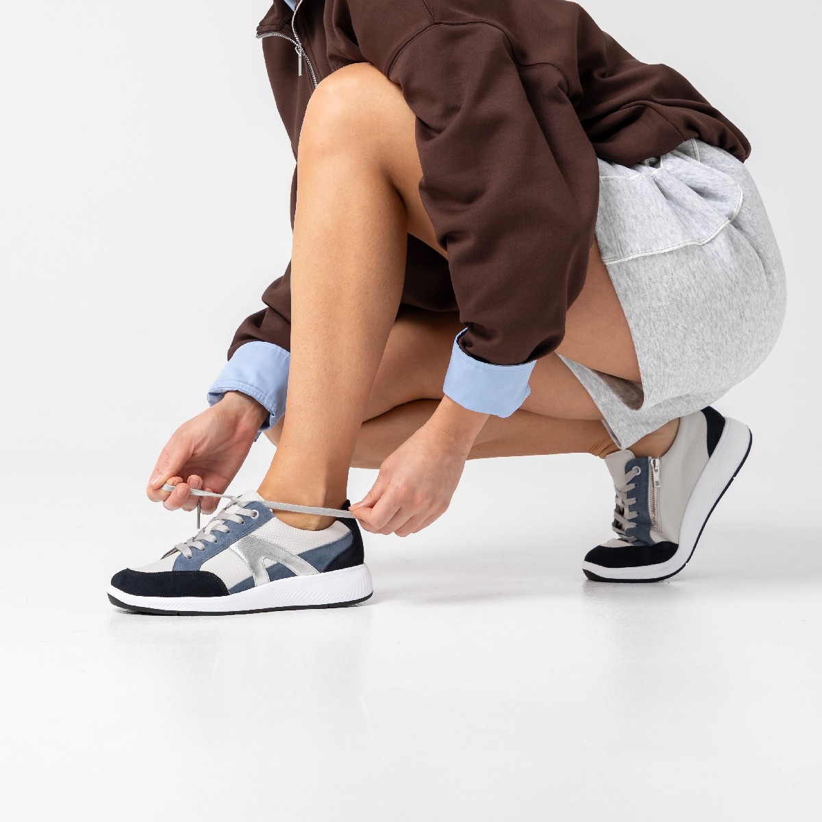 Облегченные кроссовки из натуральной кожи и замши разных фактур выполнены в широкой полноте К – подходят на широкую стопу и высокий подъем. Шнуровка позволяет отрегулировать полуботинки под собственные параметры, молния надежно зафиксирует обувь на ноге.