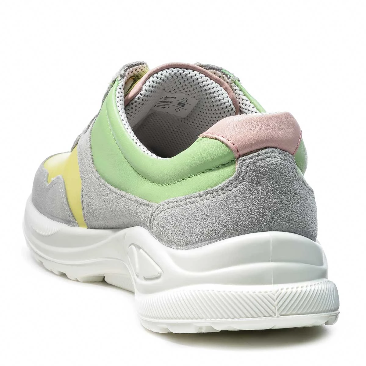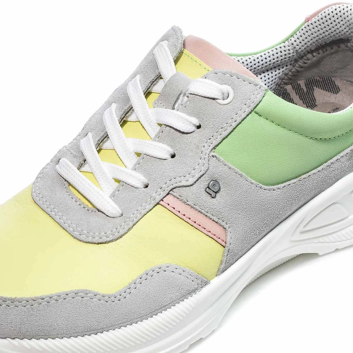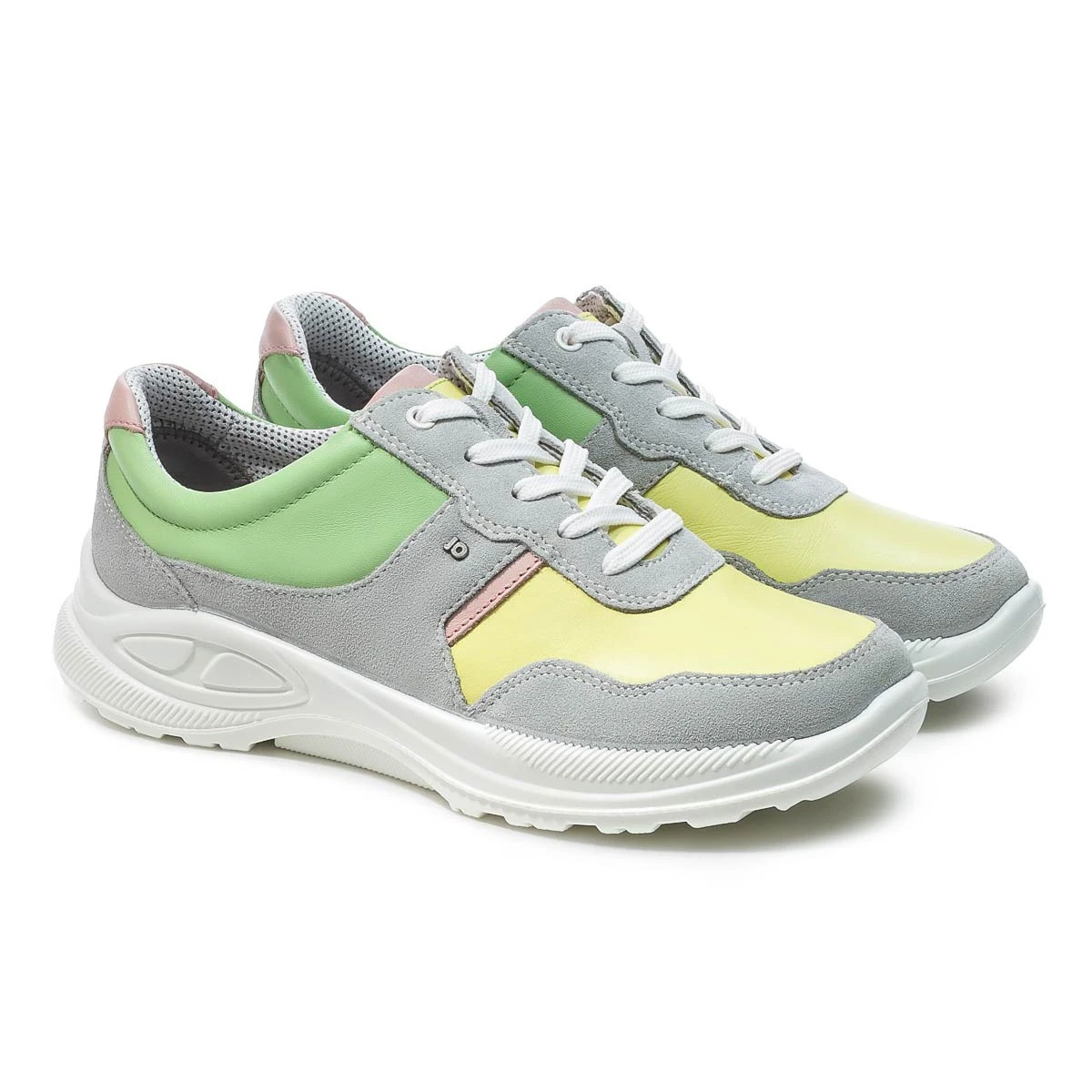 Яркие, разноцветные кроссовки в широкой полноте на высокой подошве выполнены в комбинации из натуральной гладкой кожи и замши.
