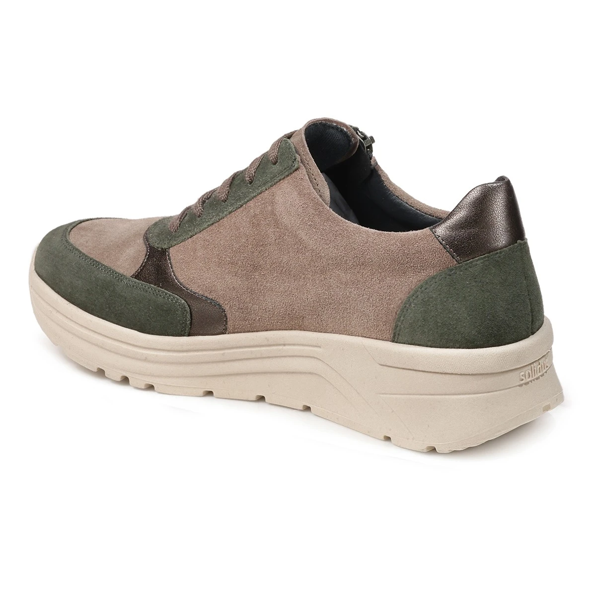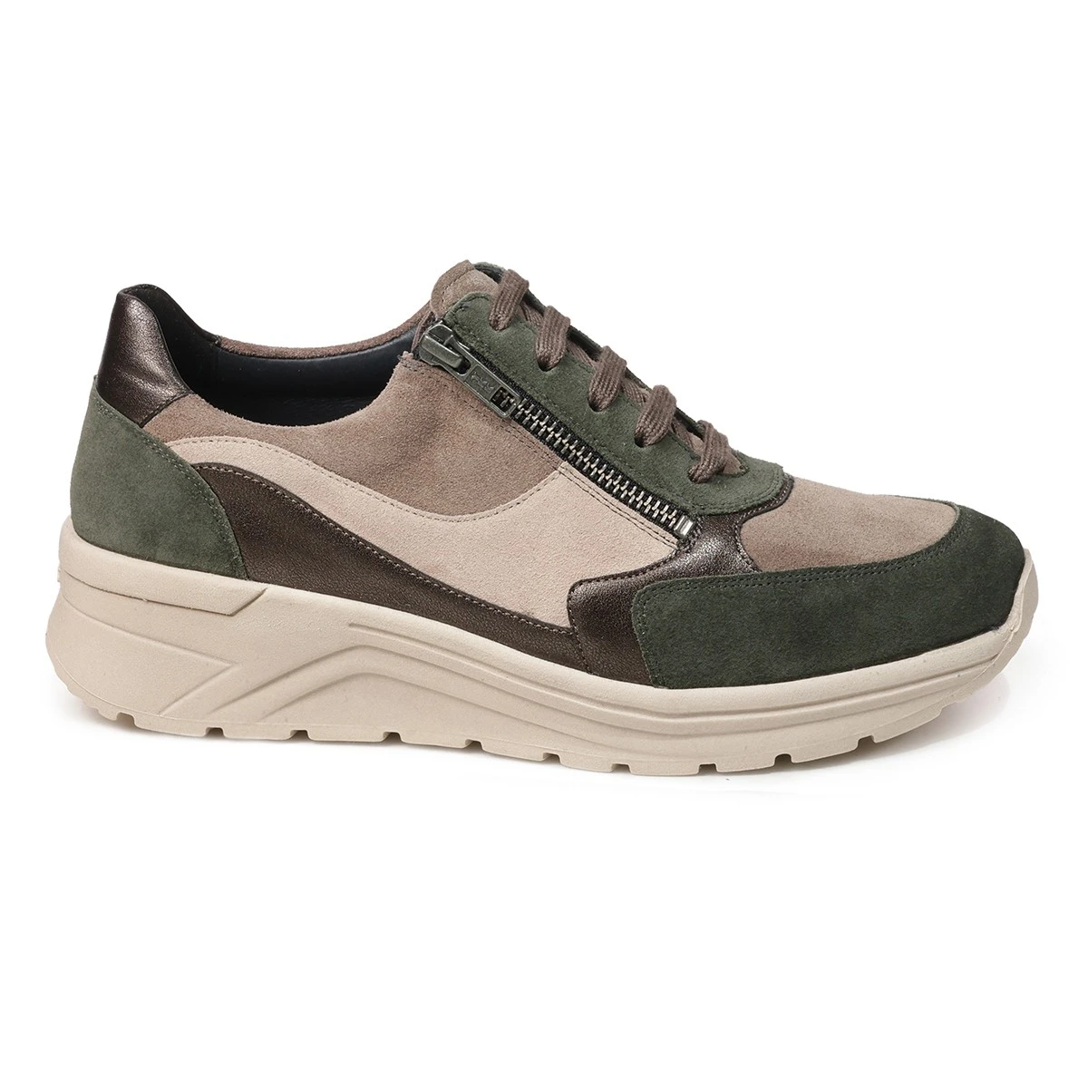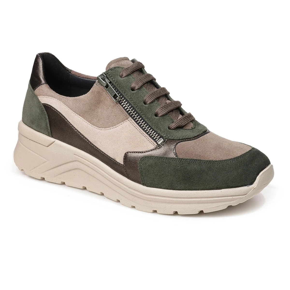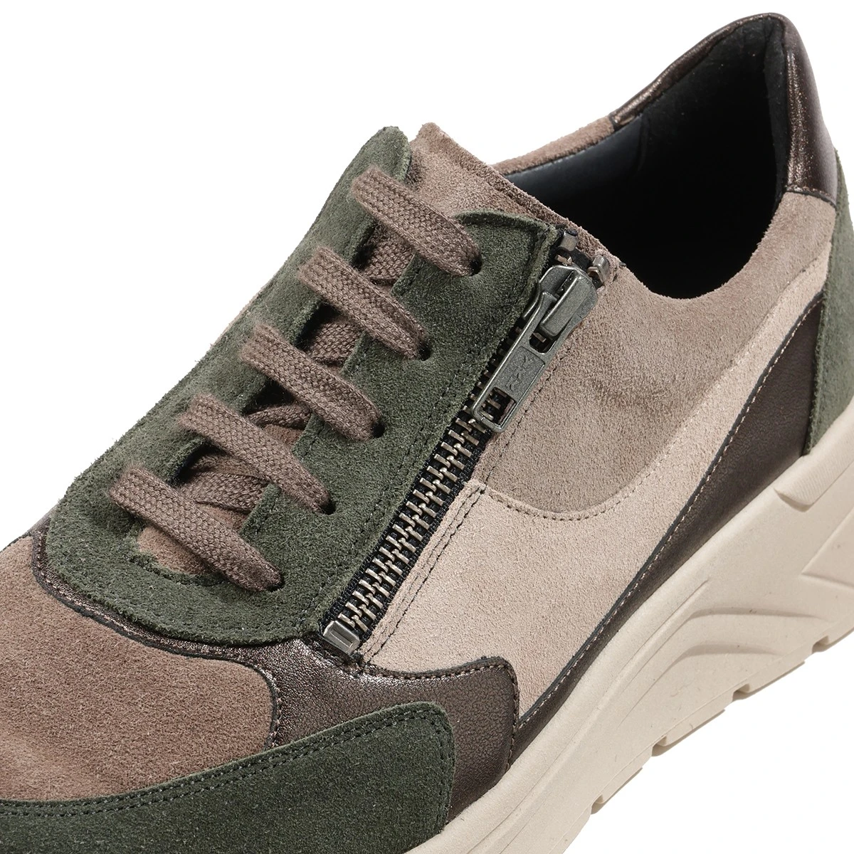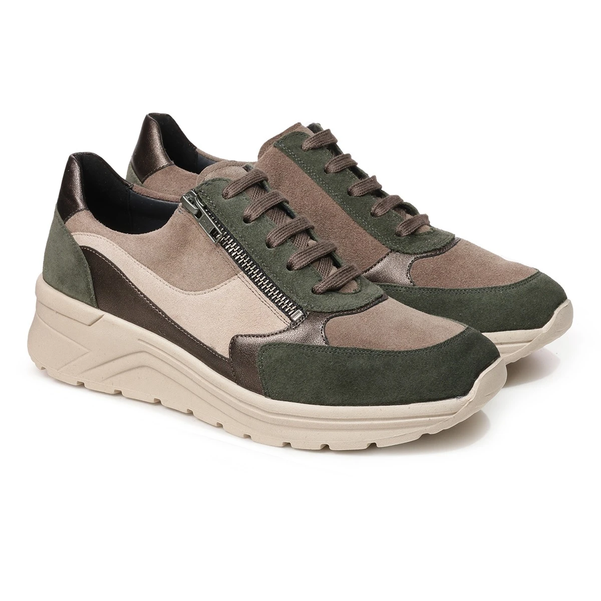 Демисезонные кроссовки на высокой подошве в стиле колор-блок выполнены в природных оттенках. Модель из натуральной замши и кожи с эффектом металлика подходит на широкую стопу. Благодаря шнуркам кроссовки можно отрегулировать по индивидуальным параметрам, а молния облегчает процесс надевания. Съемная стелька из натуральной пробки со вставками-амортизаторами мягко поддерживает своды стопы. Гибкая, легкая, износоустойчивая подошва с воздушными подушками обладает исключительной амортизацией, снимает нагрузку с суставов и позвоночника при ходьбе. Кроме того, двухслойная подошва немаркого темно-бежевого оттенка имеет превосходное сцепление на скользкой поверхности.