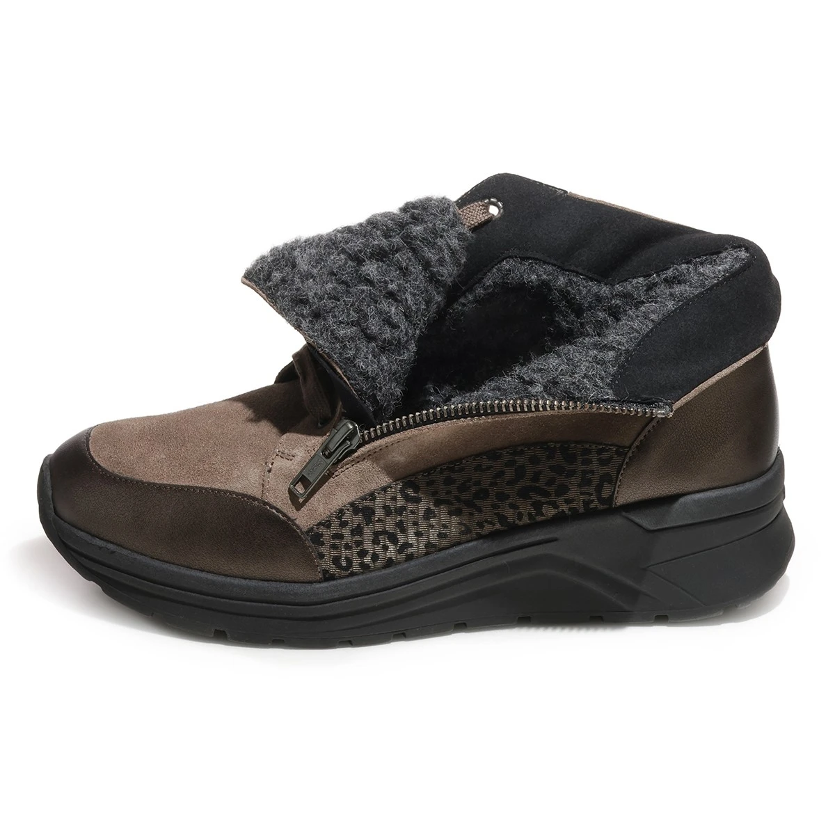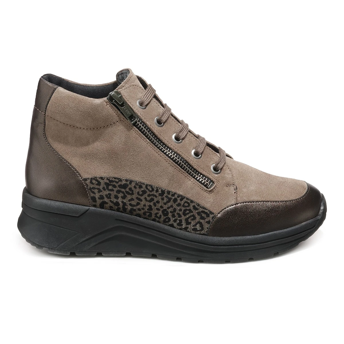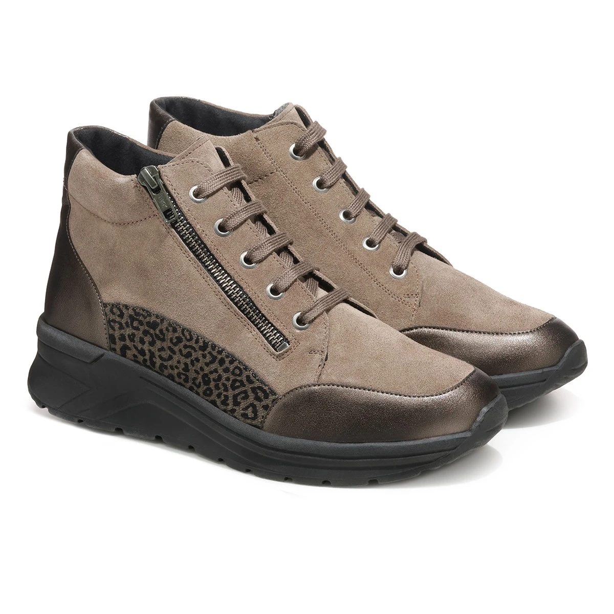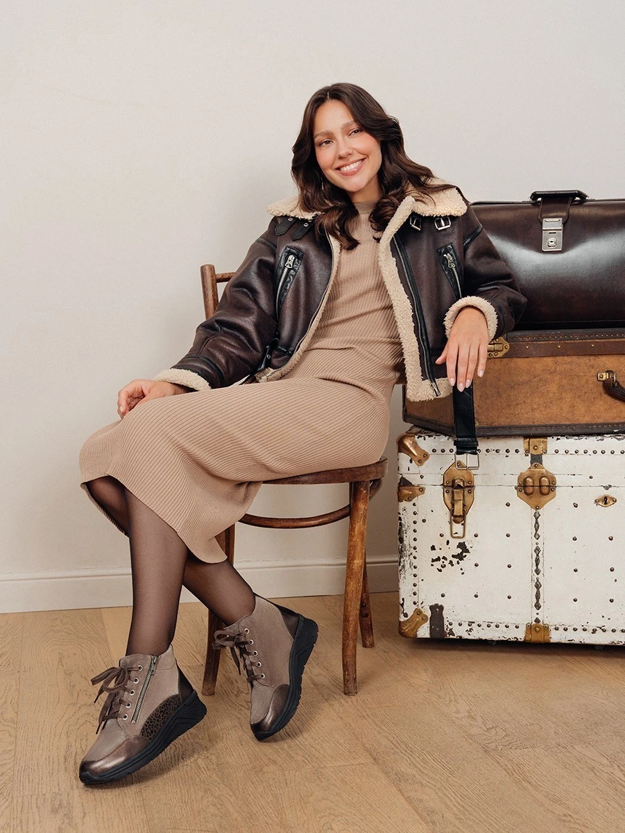 Эффектная модель на платформе в красивом серо-коричневом и бронзовом оттенках подойдет на каждый день и будет незаменима к образу в стиле кэжуал.