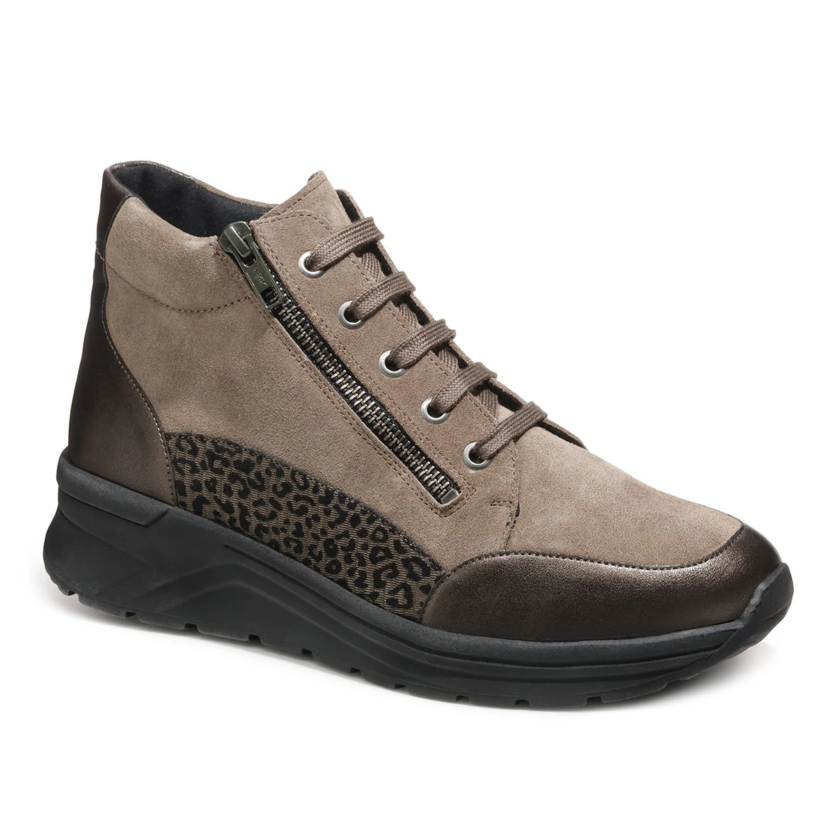 Высокие кроссовки с широкой полнотой К будут актуальны на широкую стопу и высокий подъем. Неоспоримым преимуществом кроссовок является двойная система фиксации: шнуровка удобно регулируется по ноге, а молния быстро и надежно фиксирует обувь.