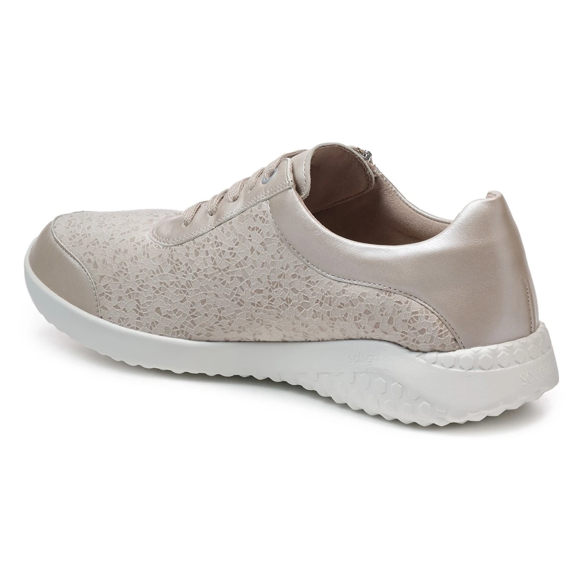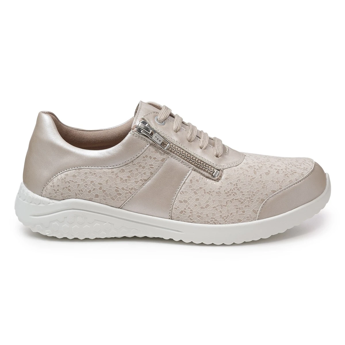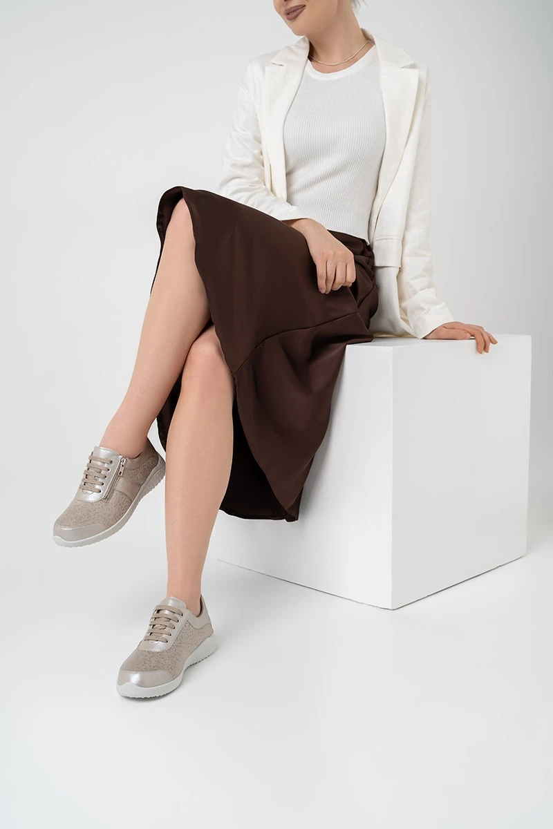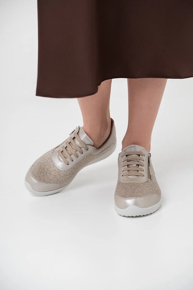 Супер-легкие кроссовки в бежевом оттенке на невысокой подошве подходят на широкую стопу и высокий подъем. Модель выполнена из натуральной кожи с эластичной вставкой из материала Nappaflex в области союзки (снимает давление с деформированных участков стопы).