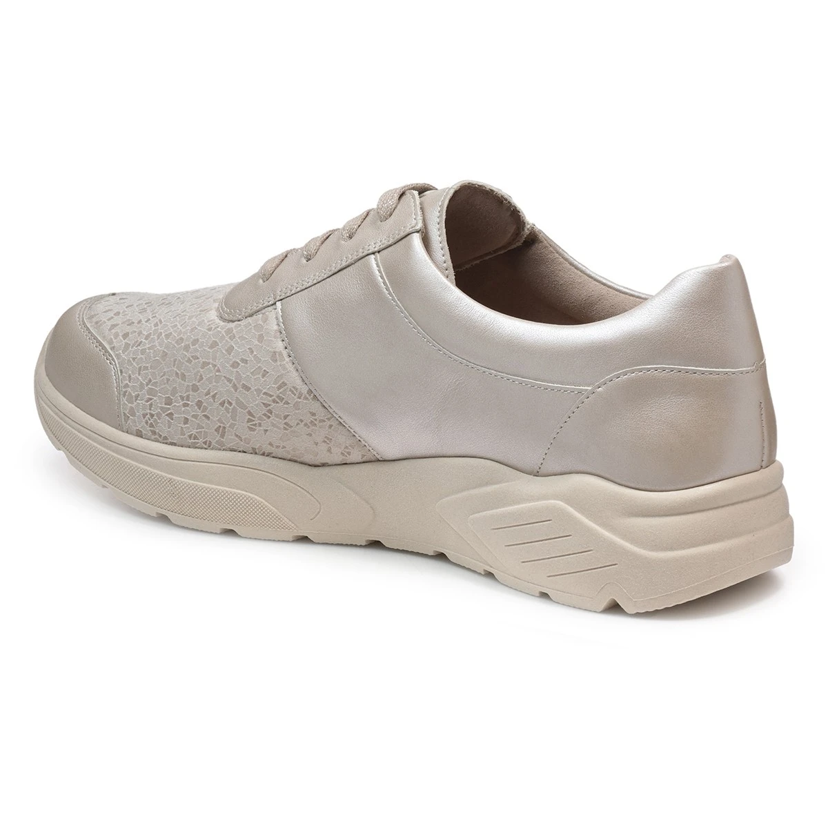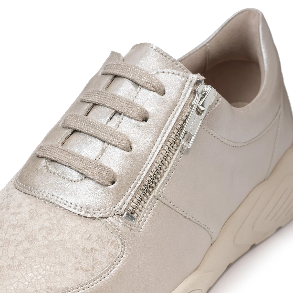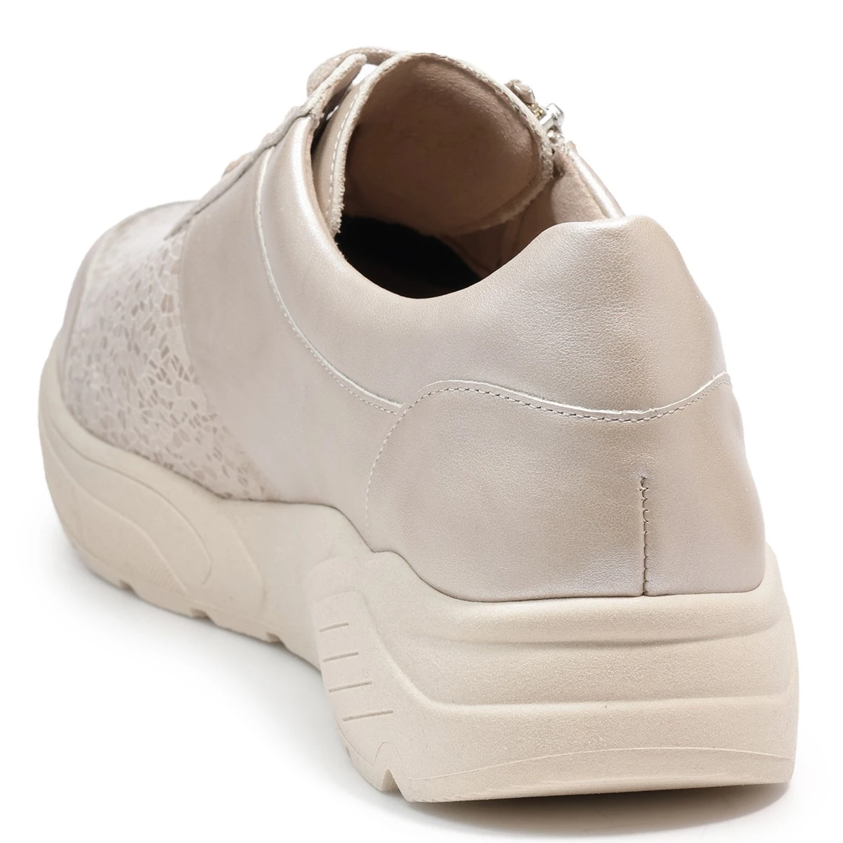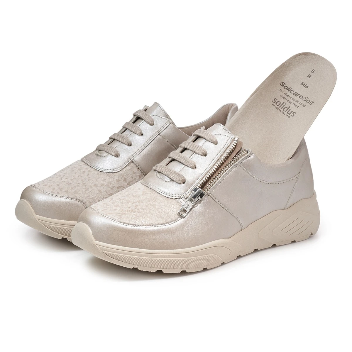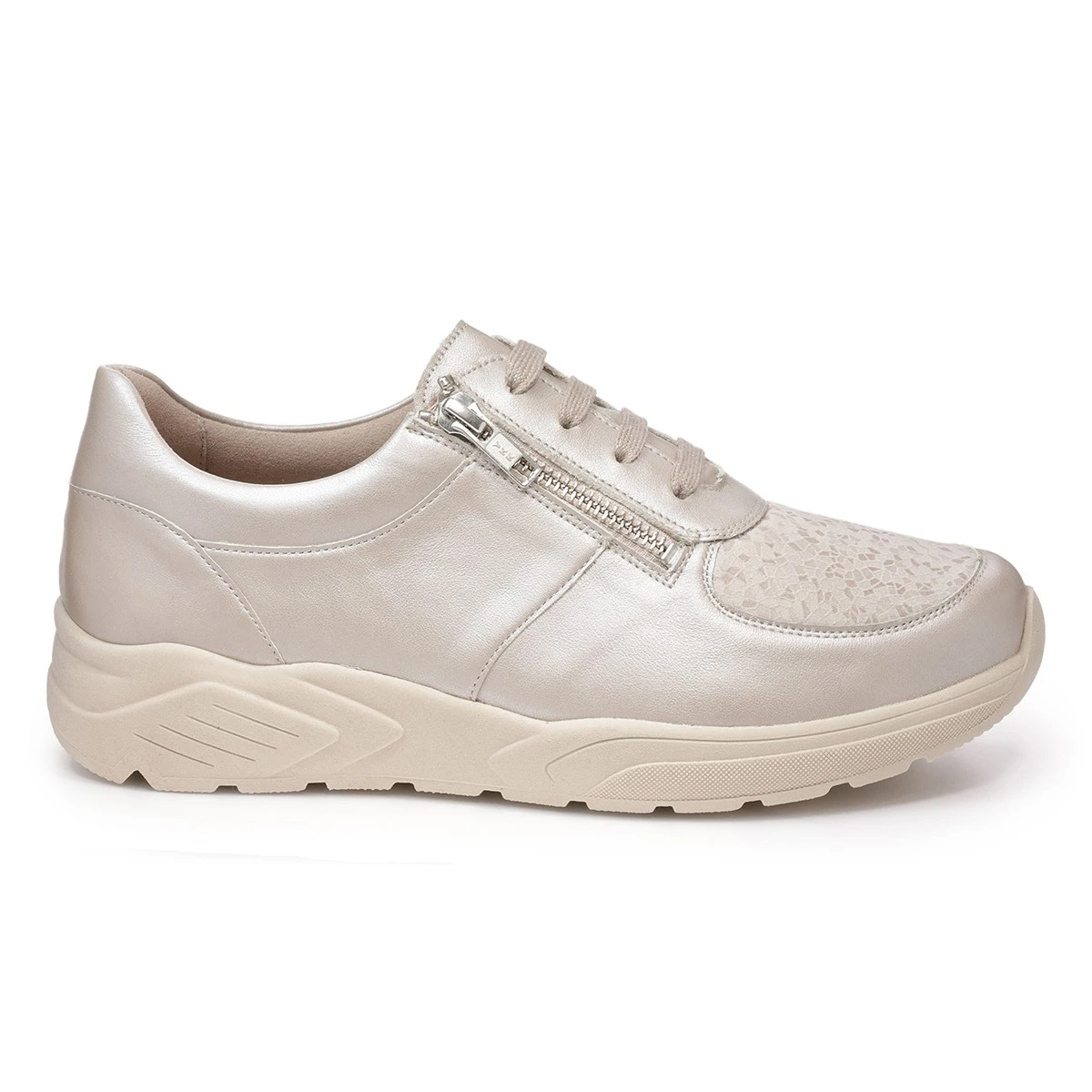 Бежевые кроссовки в очень широкой полноте подходят на высокий подъем, а также на стопу с выраженной отечностью. Модель выполнена из натуральной металлизированной кожи с эластичной вставкой из материала Nappaflex (снимает давление с деформированных участков стопы). Мягкая подкладка – из антибактериального дышащего материала Fashmo, который легко почистить влажной тканью. Мягкие внутренние швы не повреждают даже чувствительную кожу.