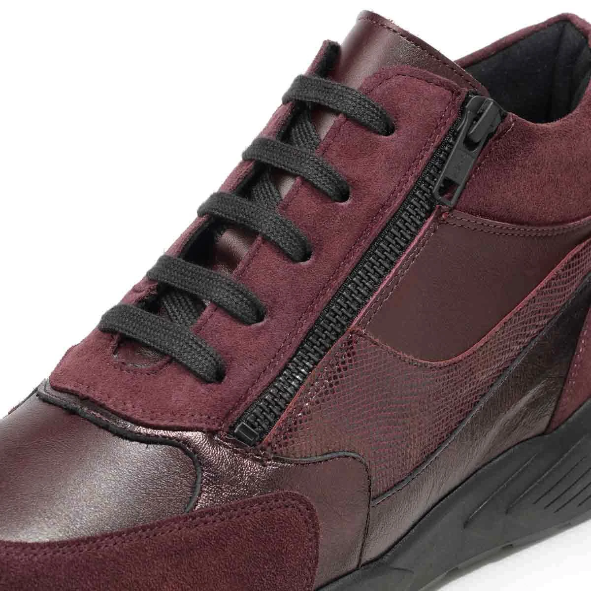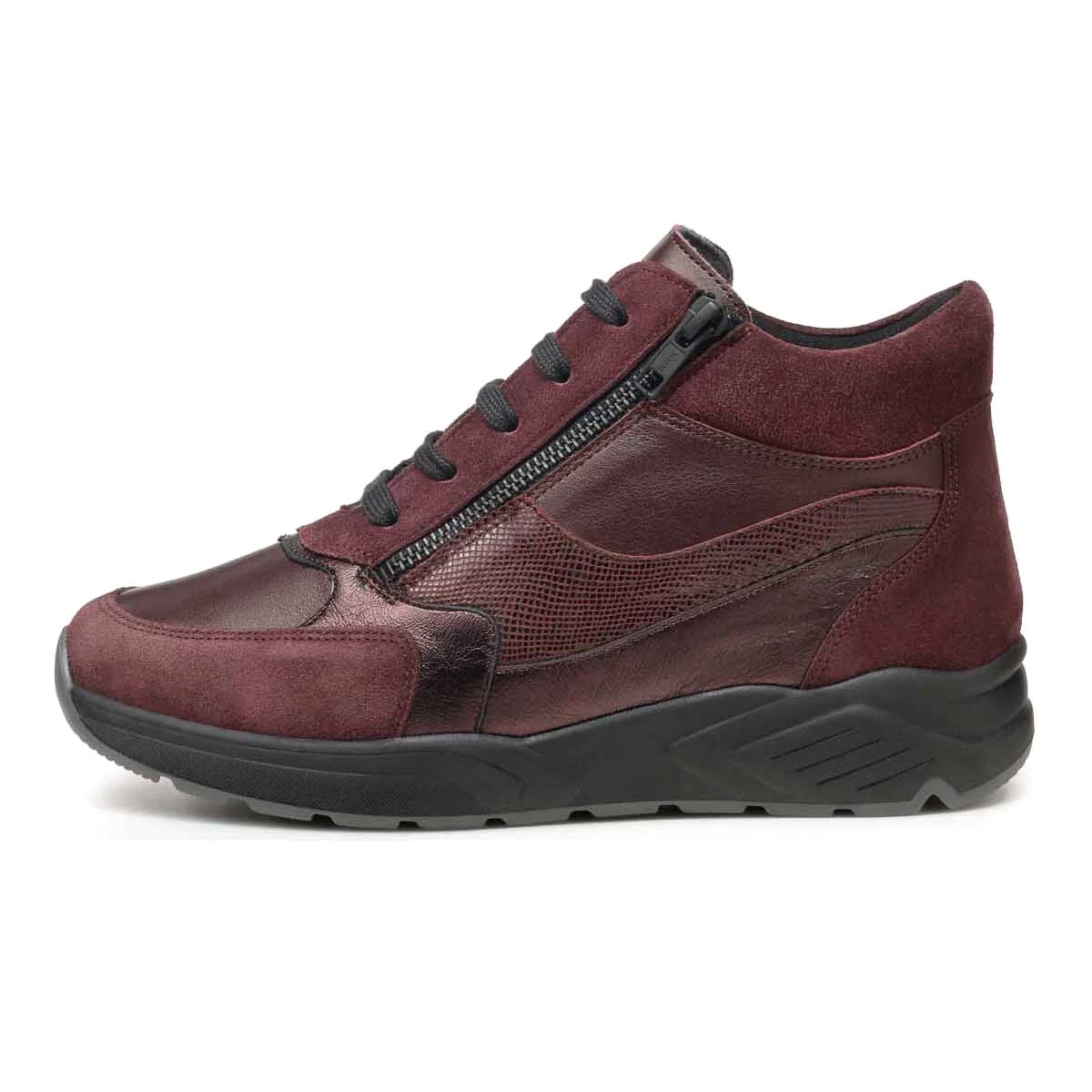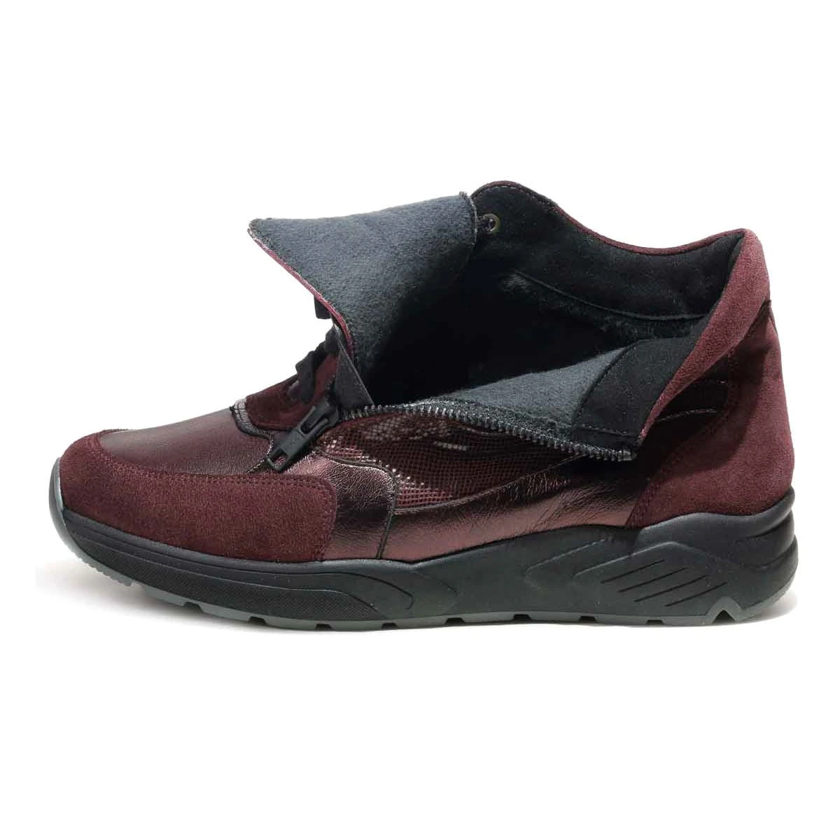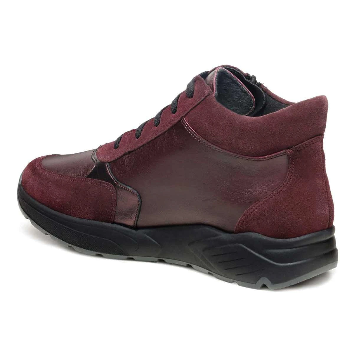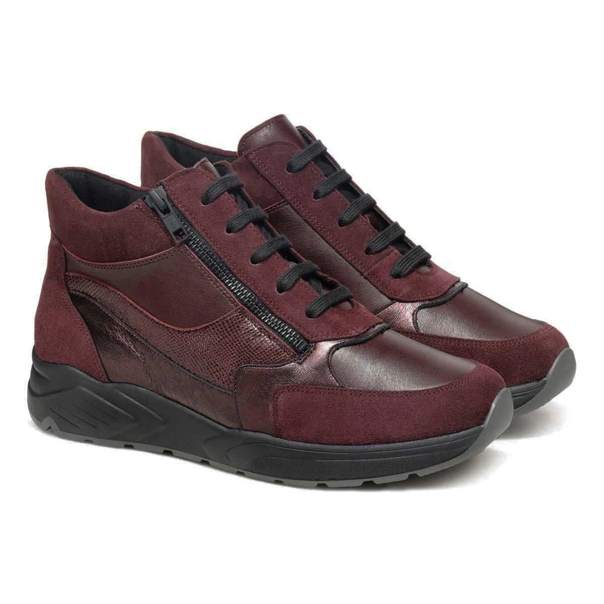 Высокие демисезонные кроссовки в очень широкой полноте подходят на высокий подъем и стопу с выраженной отечностью. Модель выполнена из натуральной кожи различных фактур: гладкая кожа, металлизированная кожа, замша. Кроссовки имеют двойную систему фиксации: шнурки и молния облегчают регулировку и надевание.