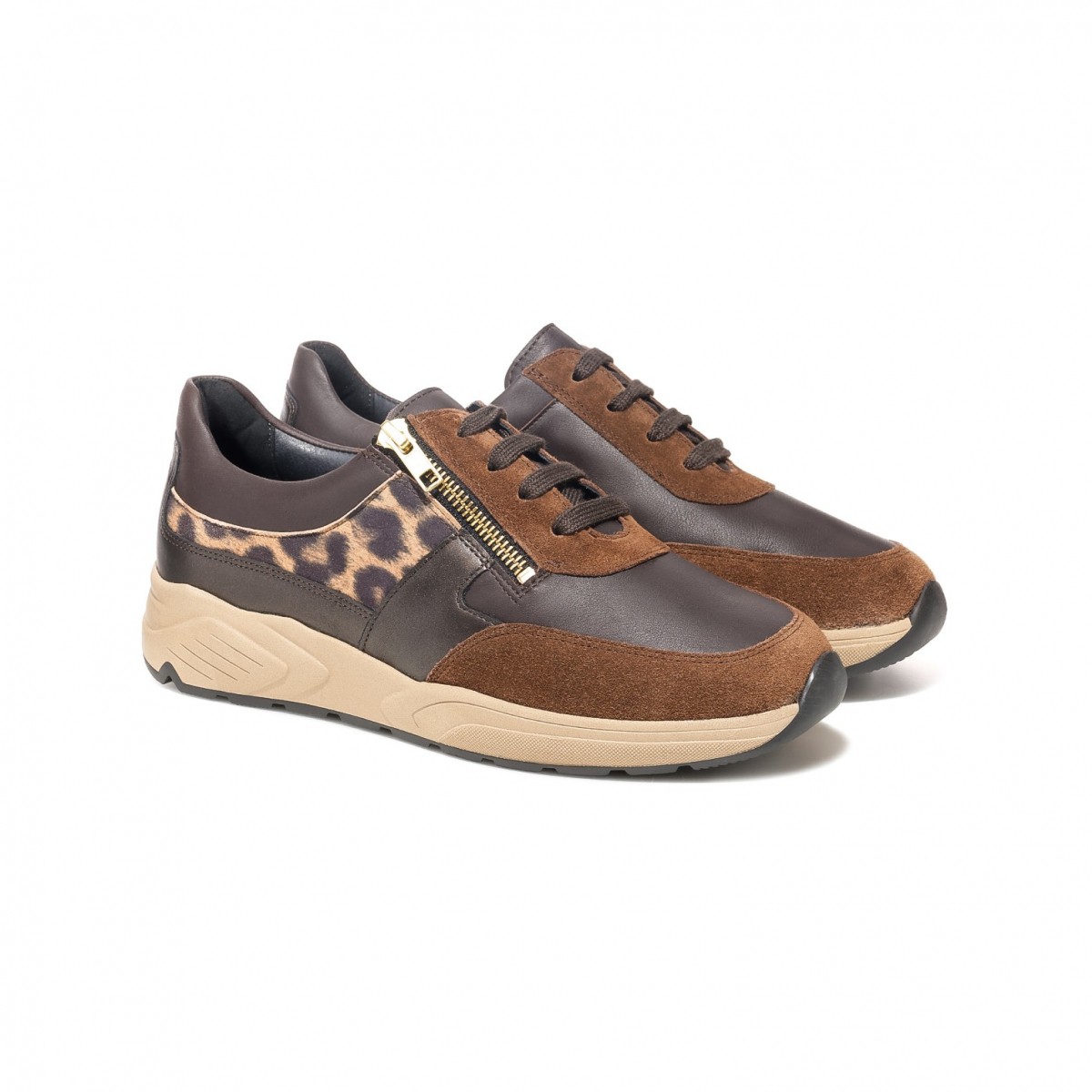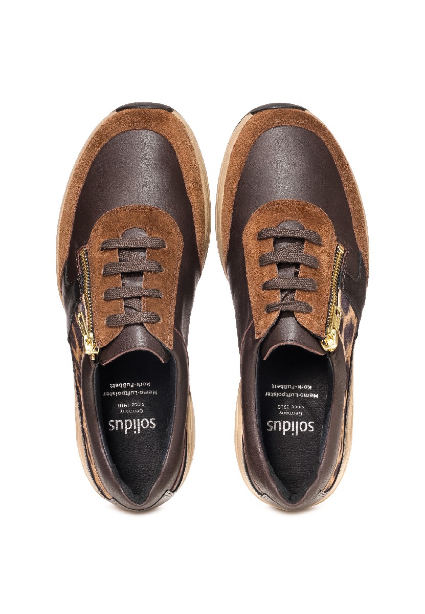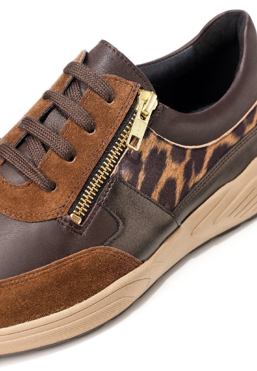 Стильные кроссовки в очень широкой полноте выполнены в коричневых оттенках с леопардовыми вставками. Материал верха – высококачественная натуральная кожа и замша. Обувь подходит на высокий подъем, а также на стопу с выраженной отечностью.