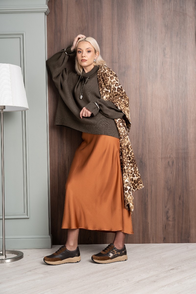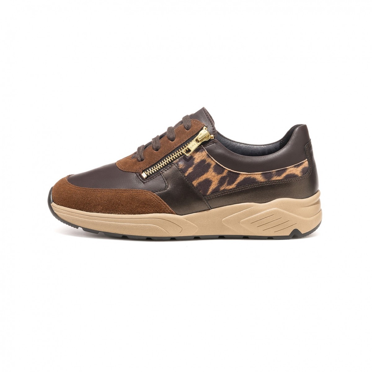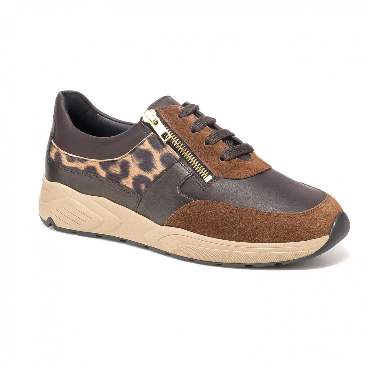Стильные кроссовки в очень широкой полноте выполнены в коричневых оттенках с леопардовыми вставками. Материал верха – высококачественная натуральная кожа и замша. Обувь подходит на высокий подъем, а также на стопу с выраженной отечностью.