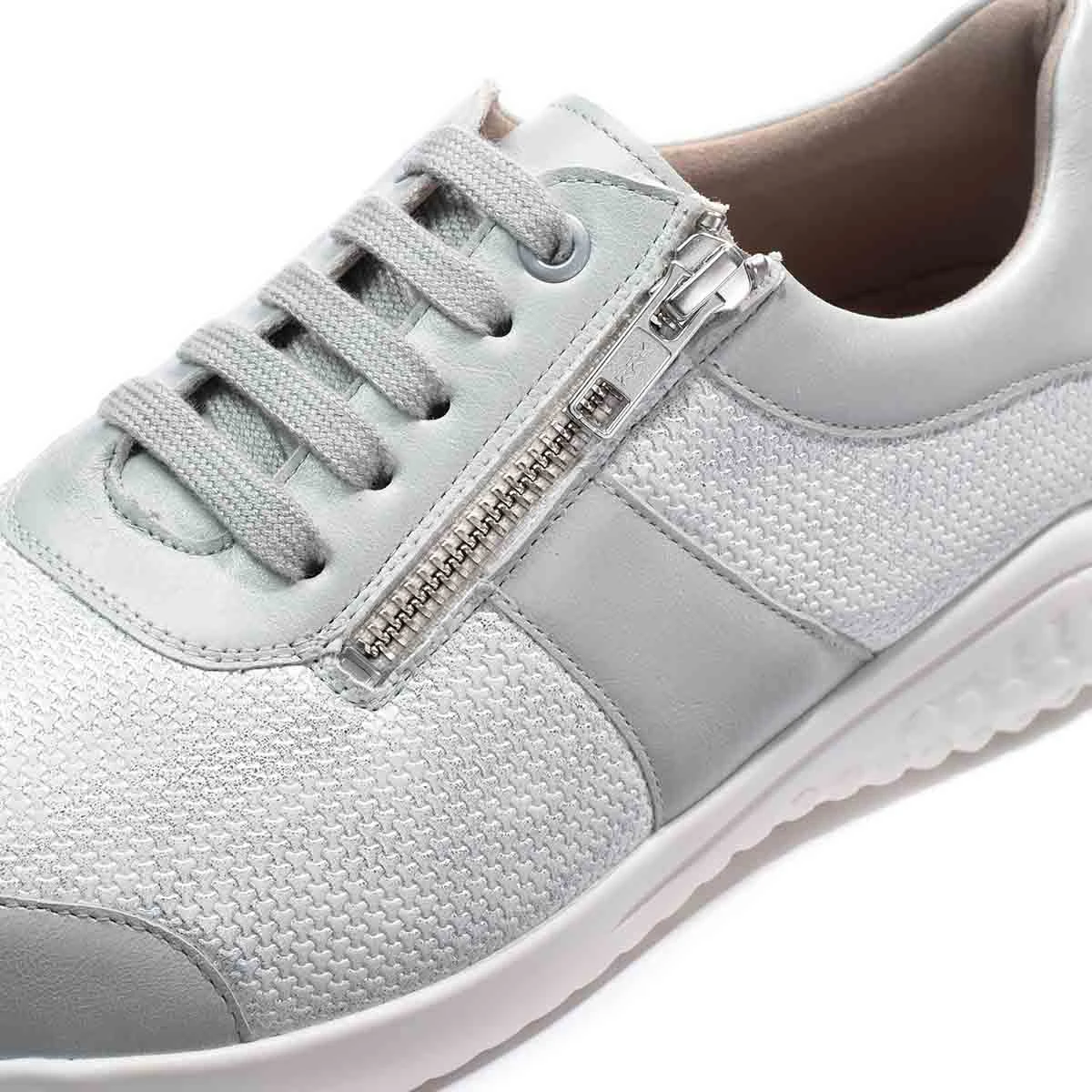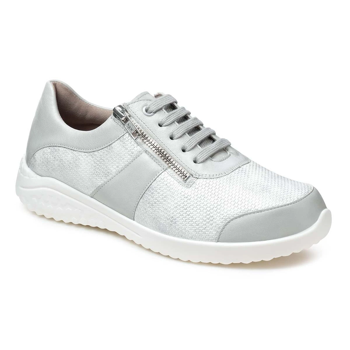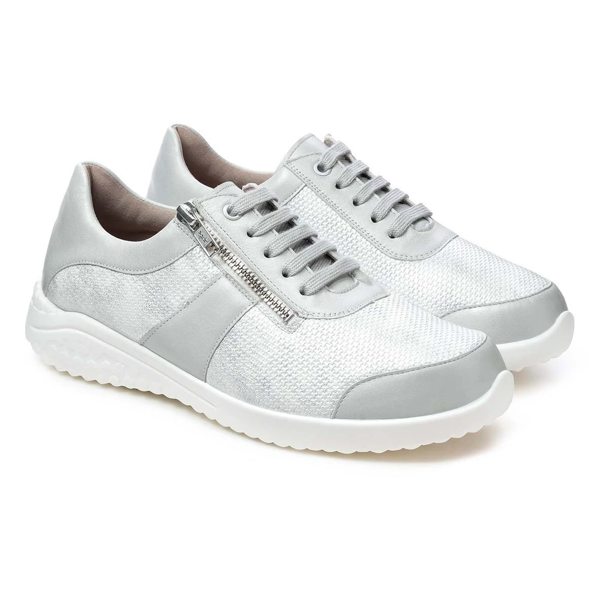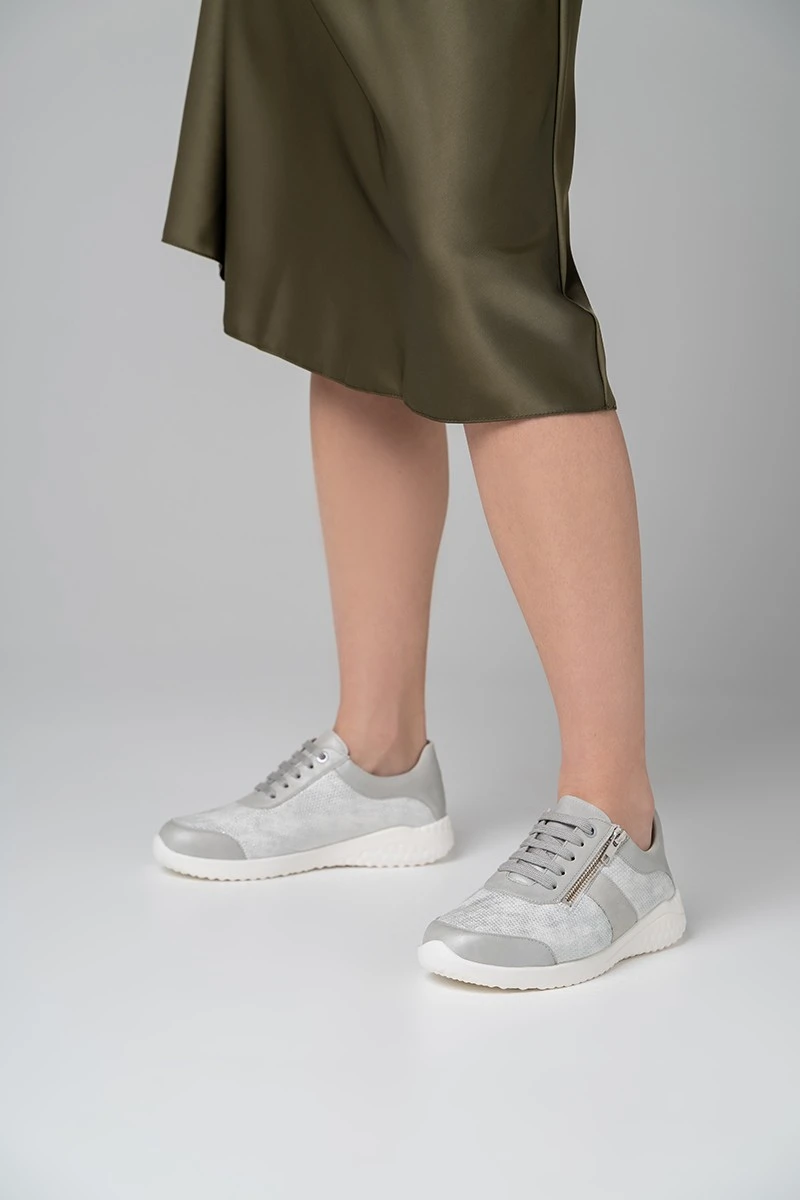 Супер-легкие кроссовки на невысокой подошве в светло-сером оттенке подходят на широкую стопу и высокий подъем. Модель выполнена из натуральной кожи с эластичной вставкой из материала Nappaflex в области союзки (снимает давление с деформированных участков стопы).